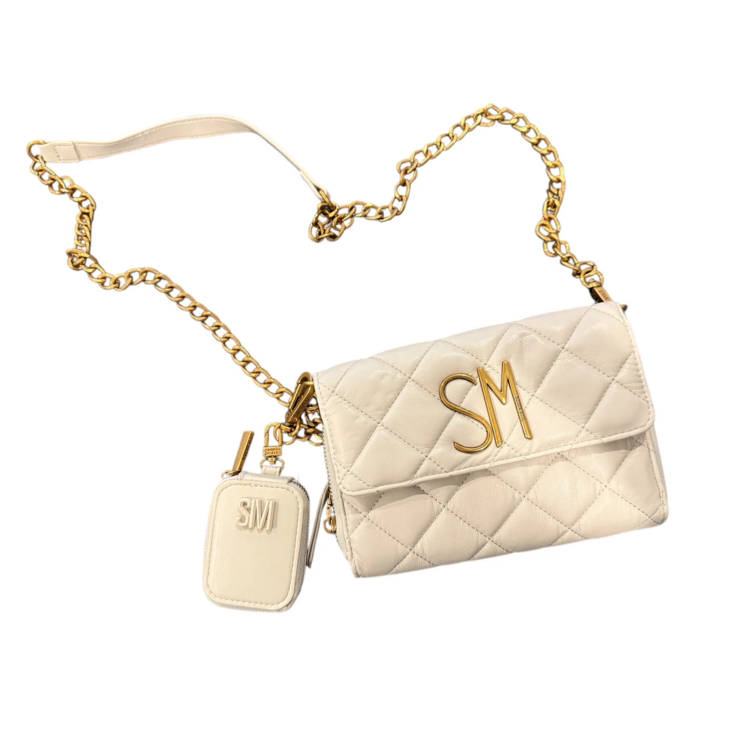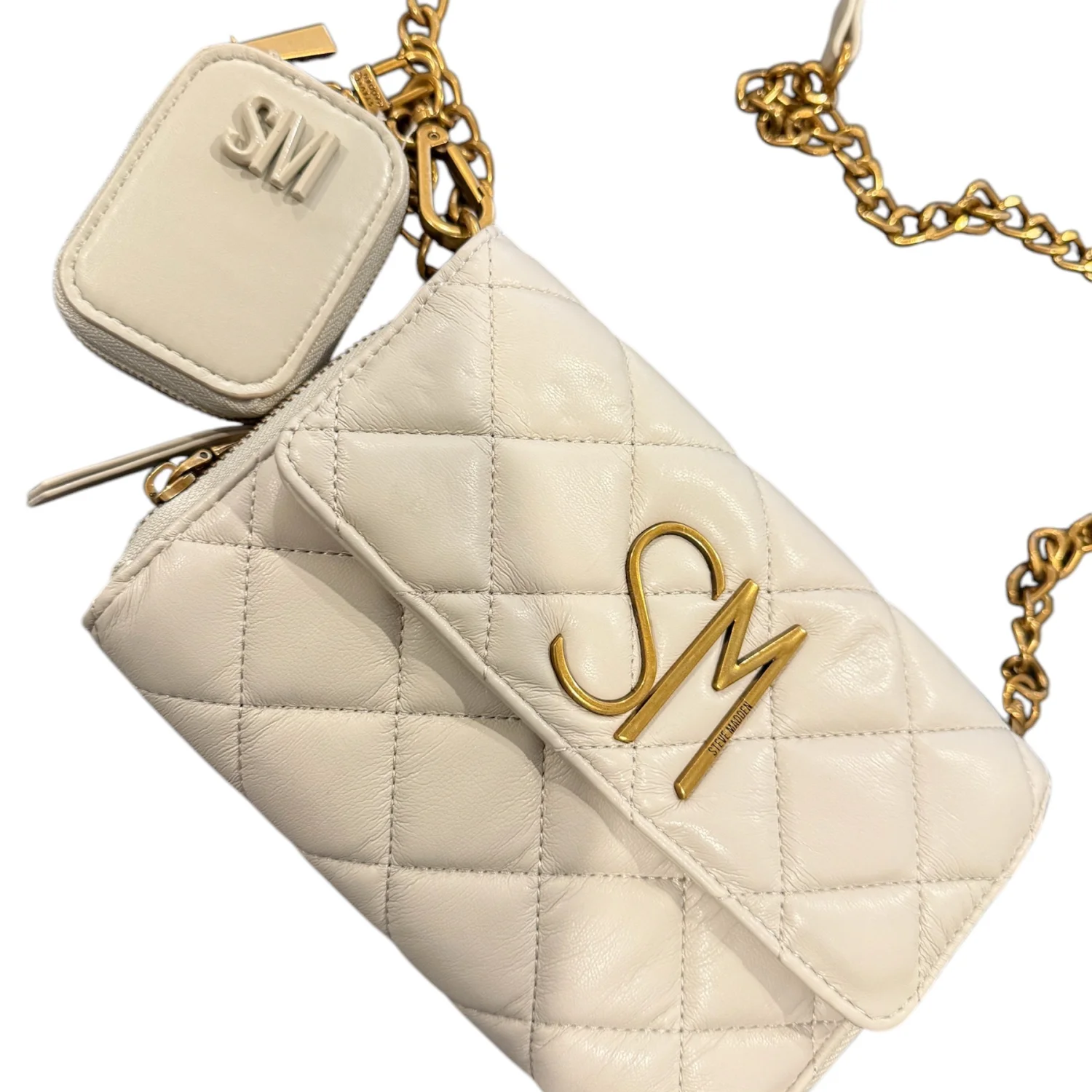 Indulge in the refined elegance of this cream quilted leather crossbody bag, distinguished by its plush texture and iconic SM logo in polished gold-tone hardware. The luxurious chain strap, accented with a leather shoulder pad, offers both comfort and a touch of opulence, making it an exquisite accessory for elevated day or evening wear. Crafted by Steve Madden, this bag features a detachable pouch with matching logo detail, perfect for small essentials. Its spacious interior and secure zip closure blend practicality with sophisticated design, ensuring you carry your essentials in style. • Color: Cream • Material: Quilted leather • Hardware: Gold-tone • Strap: Chain with leather pad • Closure: Zip • Brand: Steve Madden • Includes: Detachable pouch • Measurements: 8”L x 5”H • REASONABLE OFFERS ARE WELCOMED•