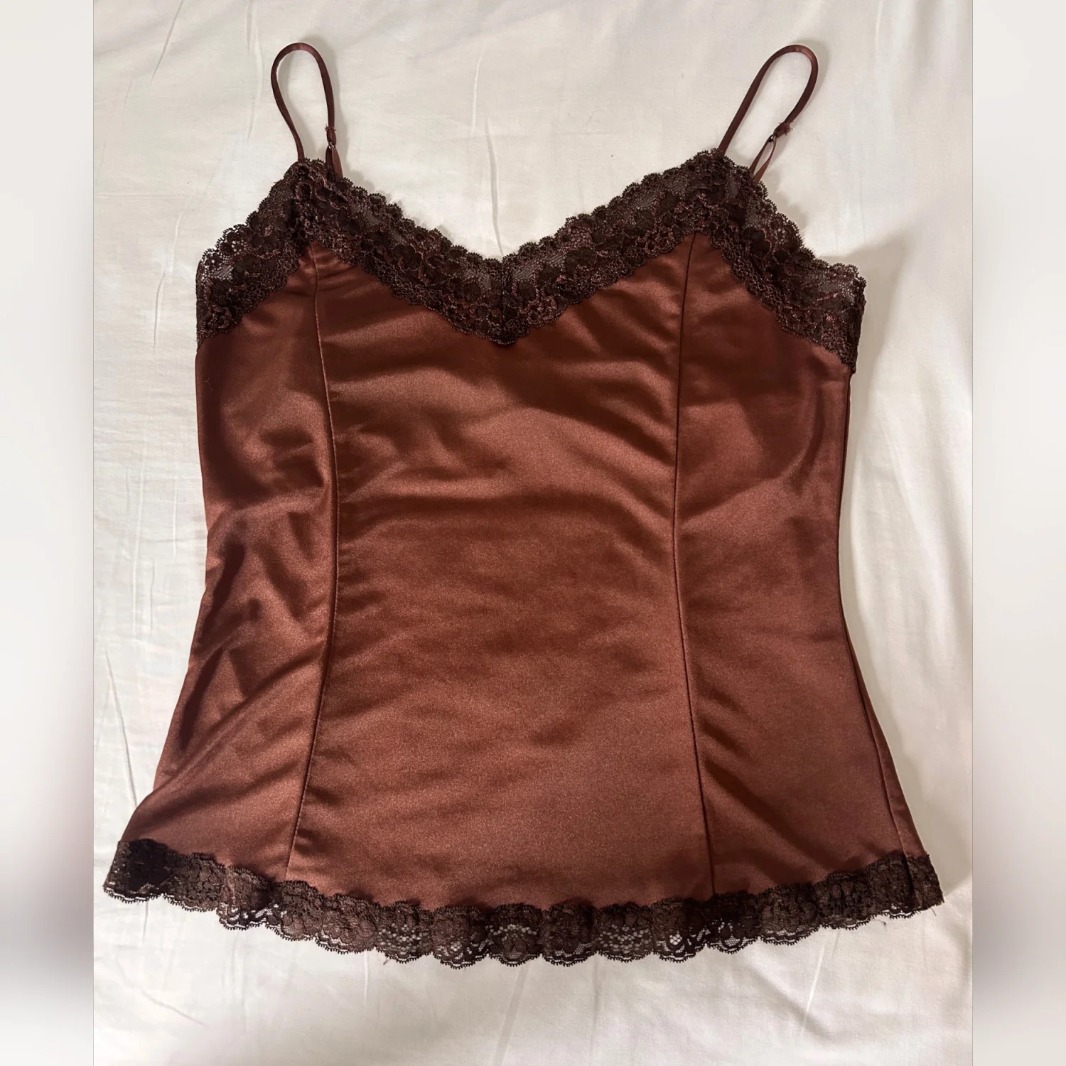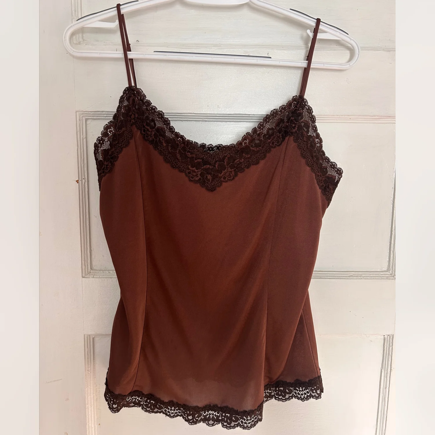 This is a thrifted brown tank top with lace trim detailing. It’s true to size (US L). Very cute just doesn’t fit anymore! No flaws