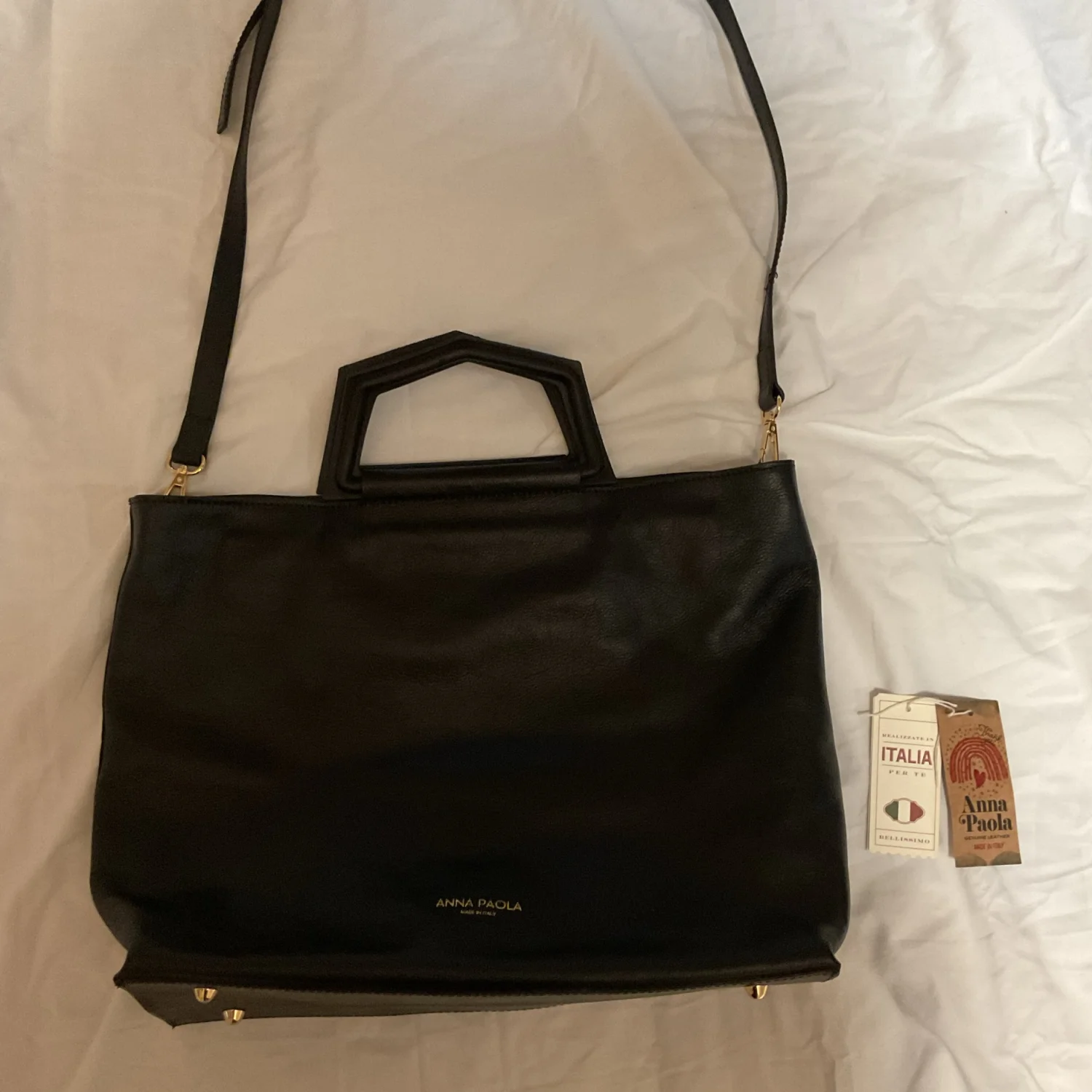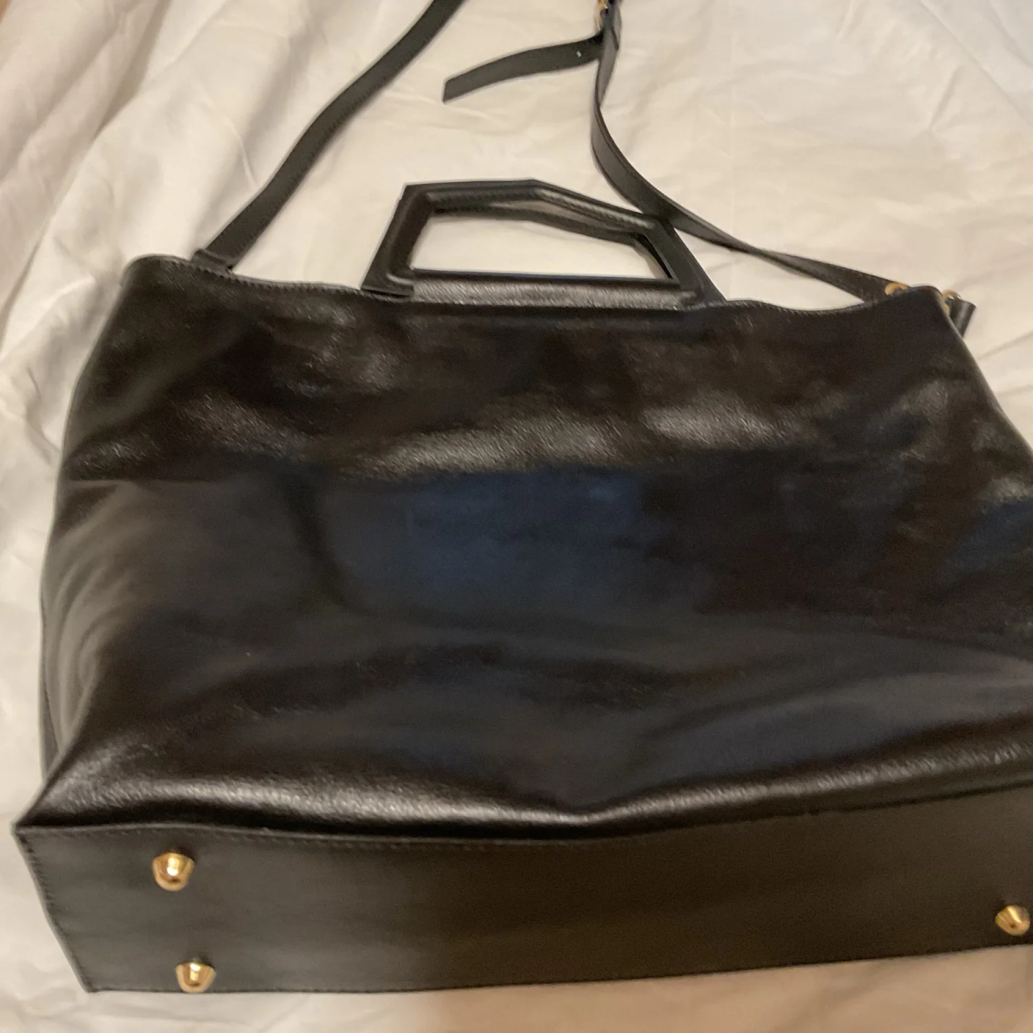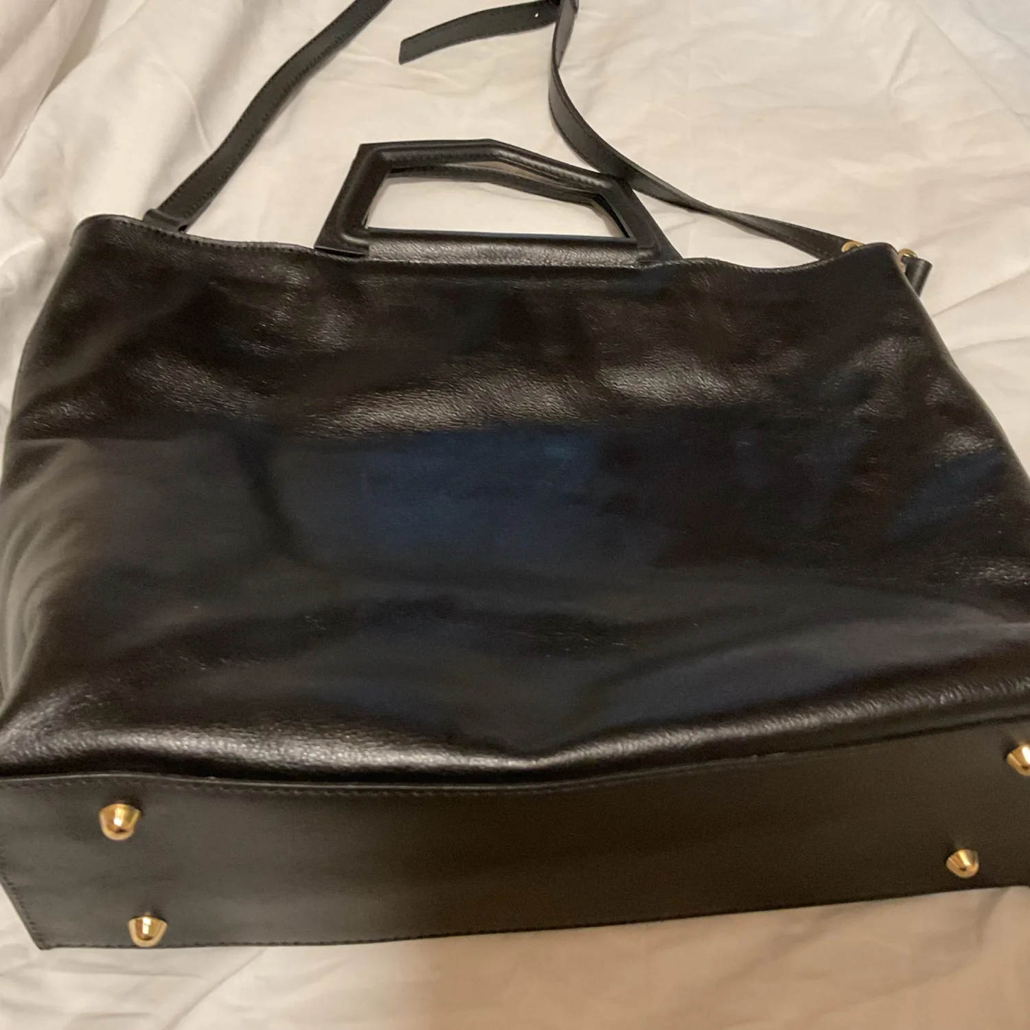 Chic functional and gorgeous NWT black leather tote from your girl Ana P. Bag dimensions are 16”Lx2.8Wx11.5H. This tote features a zipper top zip closure, inside zipper pocket, and gold tone “feet” on the bottom