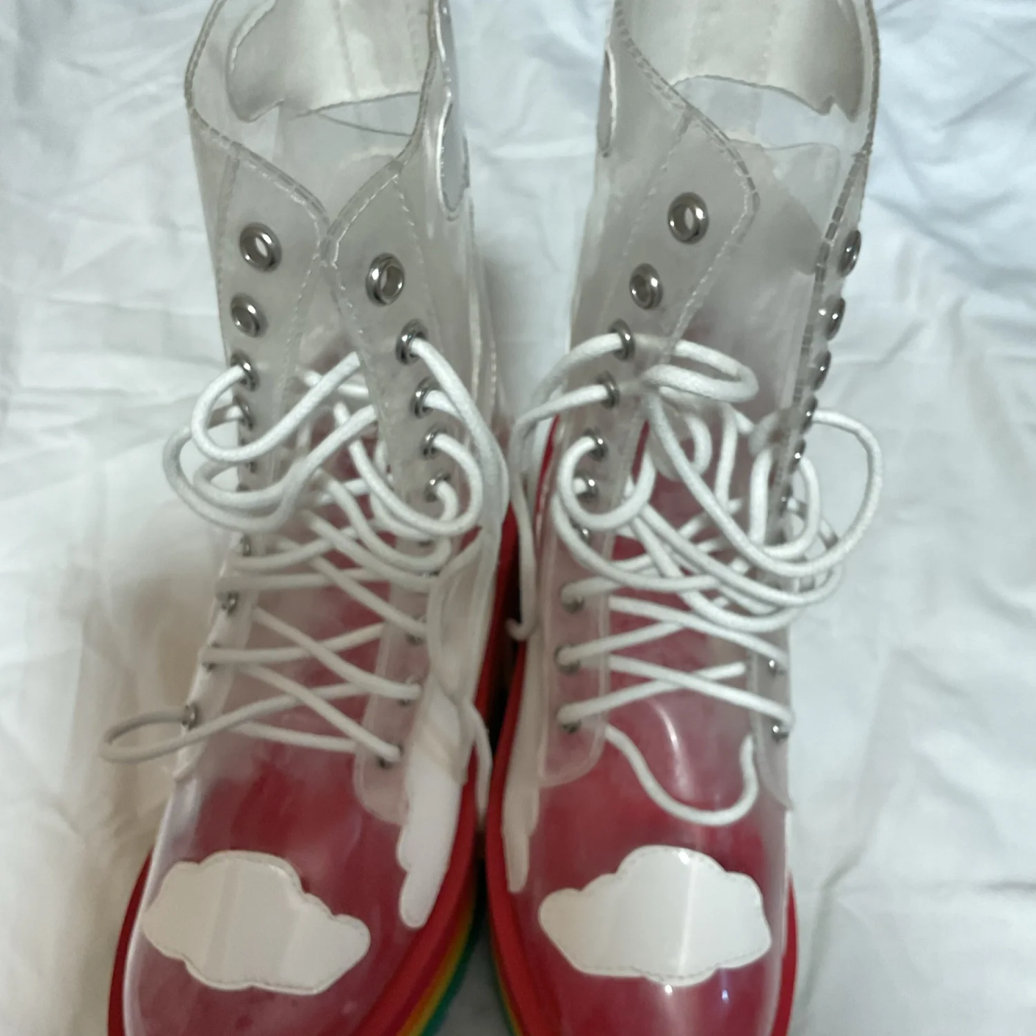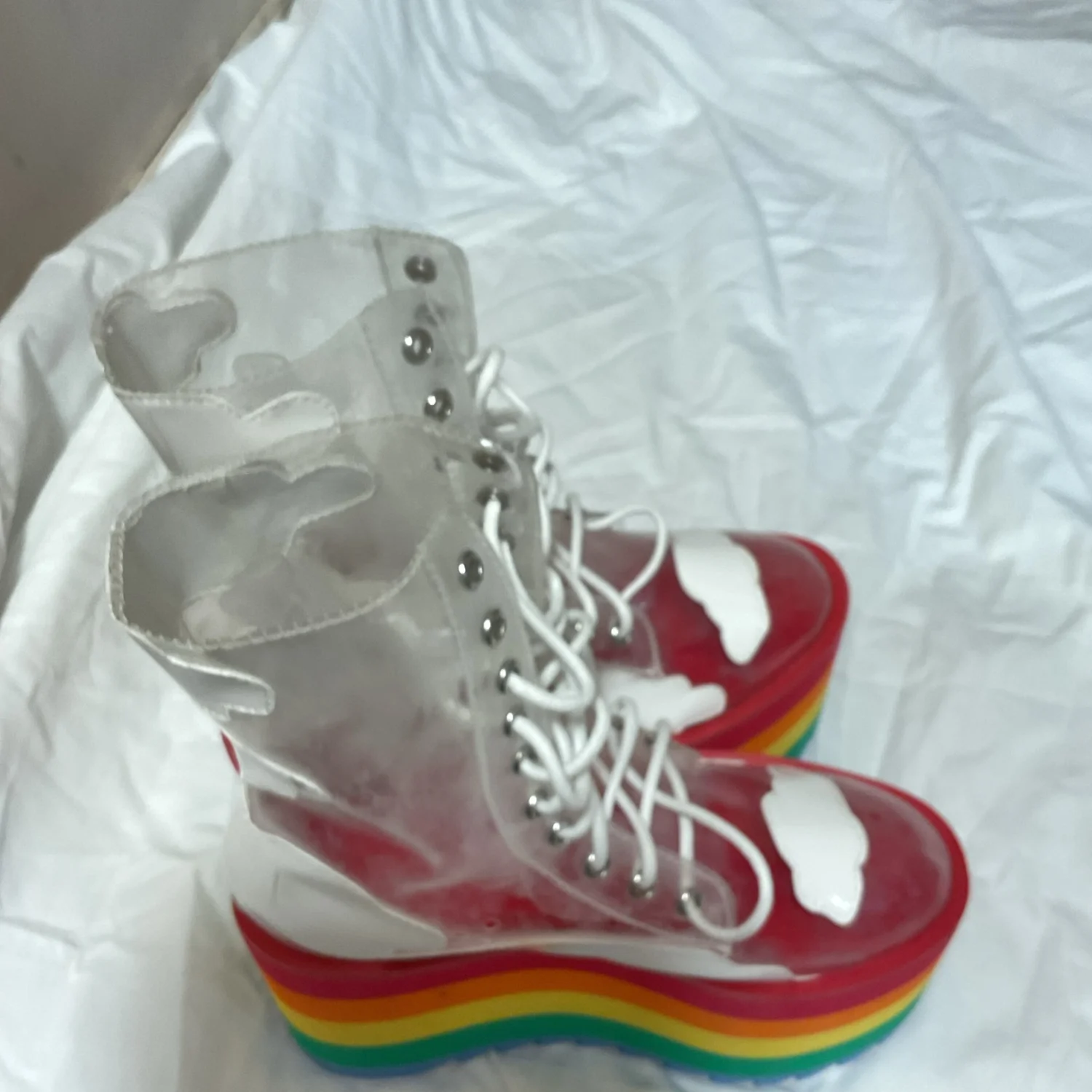 A very cool collab from Dolls Kill and Current mood. These clear “cloud” boots with a rainbow chunky platform heel are the epitome of rave, festival, and PRIDE culture. Get your happy on.