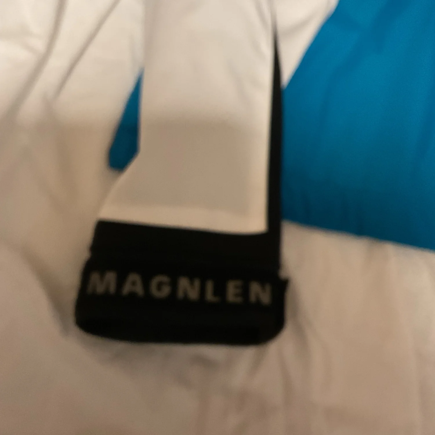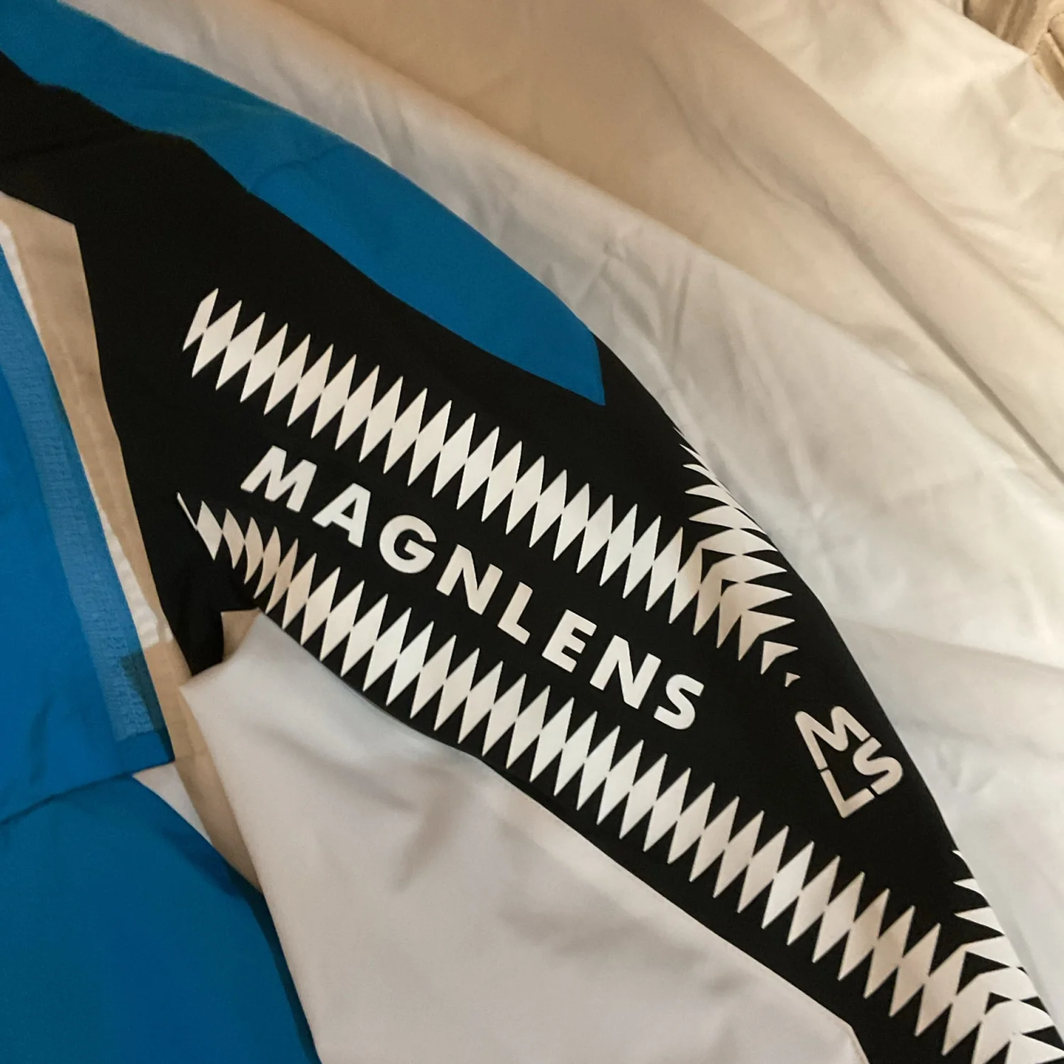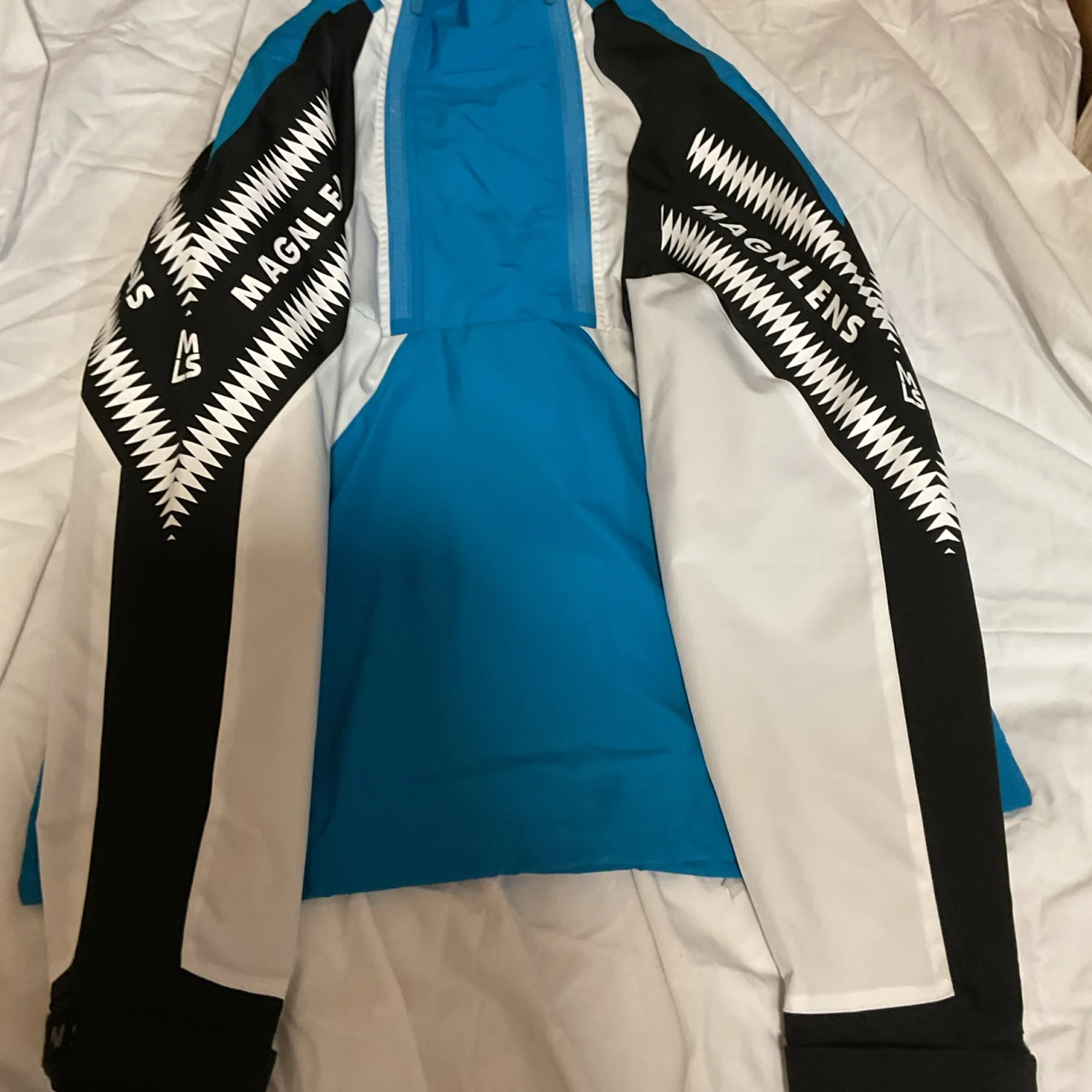Magnlens blue, black, and white cycling jacket designed for athletic performance. Features full front zip closure and stylish graphic elements on the sleeves. Lightweight with breathable mesh lining ideal for cycling and outdoor activities. Made with quality materials to ensure comfort and durability. Size S. Perfect for those who enjoy cycling or an active lifestyle. #cycling #athleticwear #gorpcore