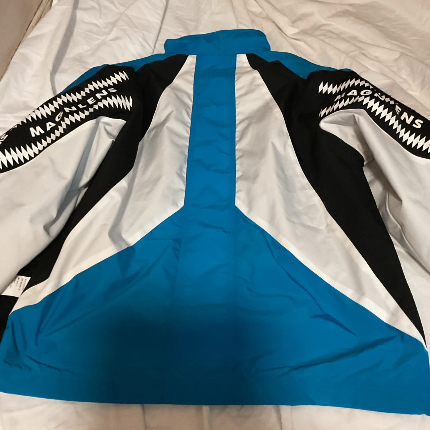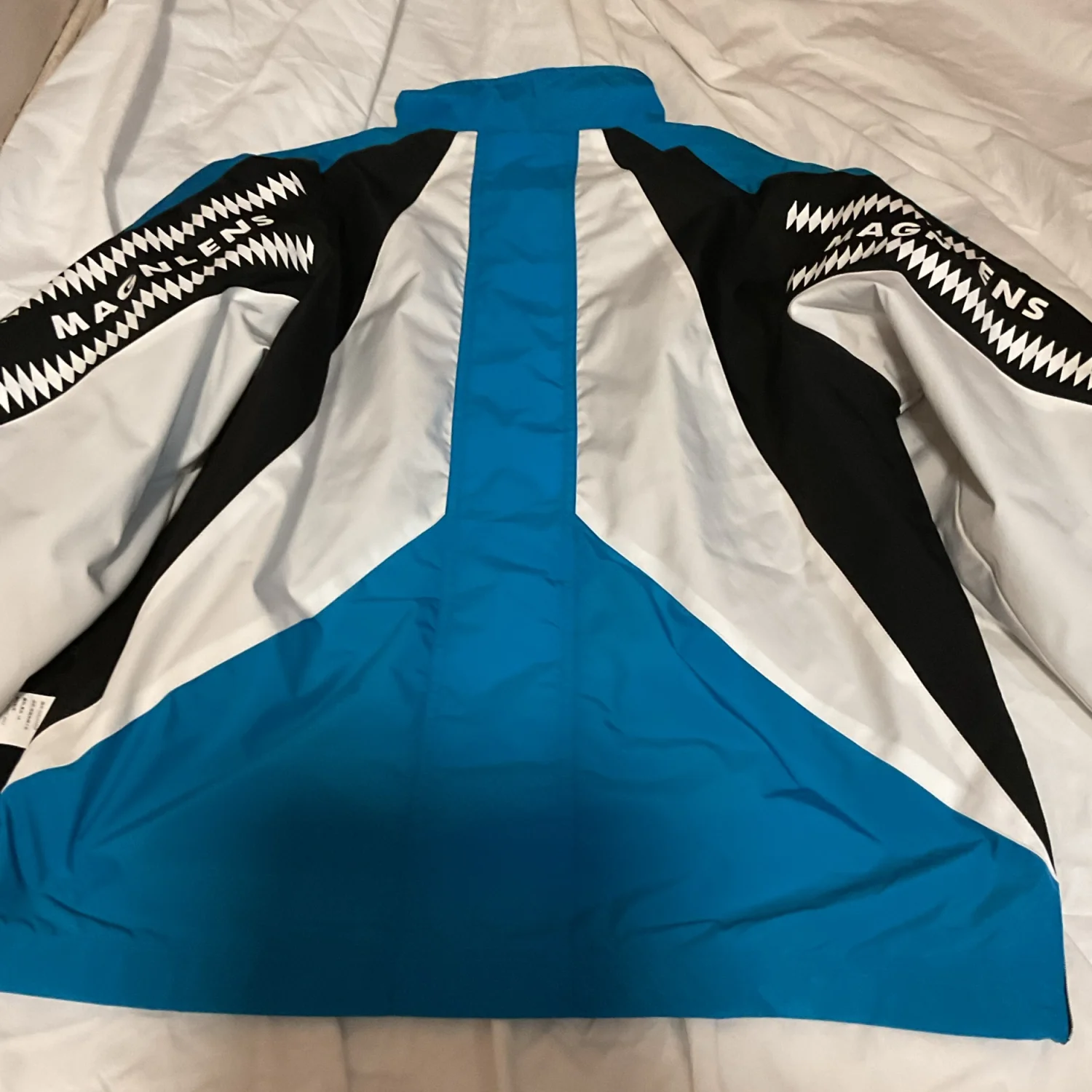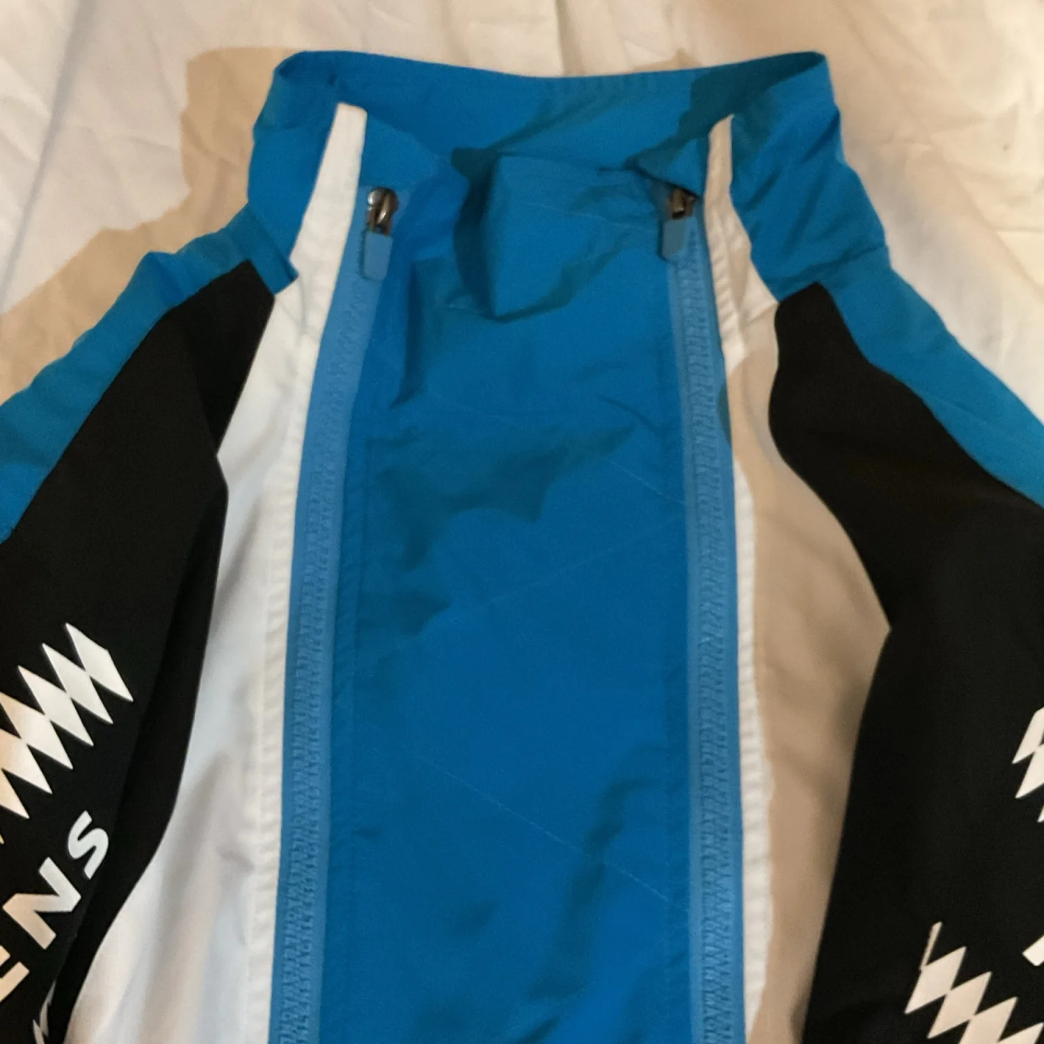 Magnlens blue, black, and white cycling jacket designed for athletic performance. Features full front zip closure and stylish graphic elements on the sleeves. Lightweight with breathable mesh lining ideal for cycling and outdoor activities. Made with quality materials to ensure comfort and durability. Size S. Perfect for those who enjoy cycling or an active lifestyle. #cycling #athleticwear #gorpcore