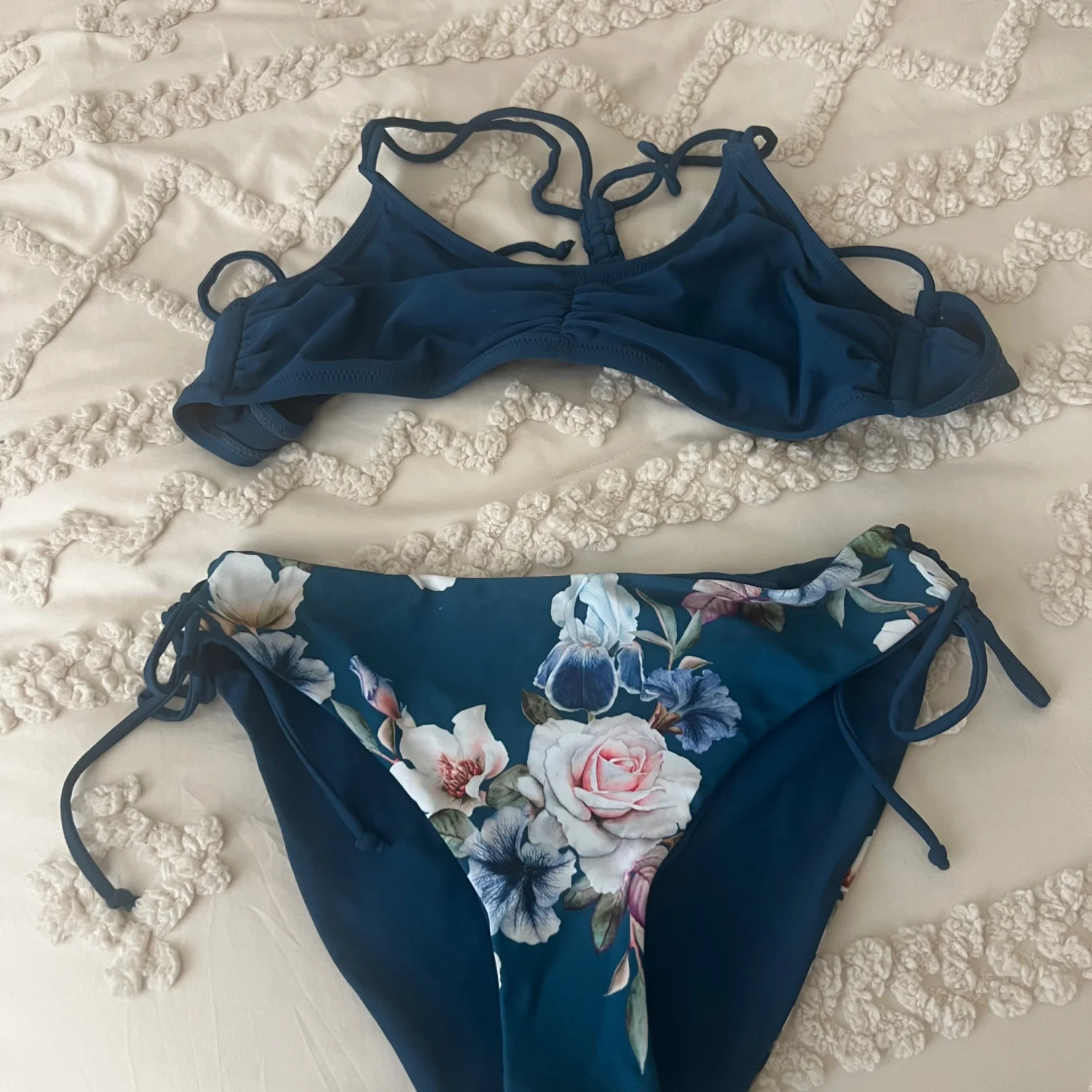 Never worn. Teal bathing suit with flowers on bottom.