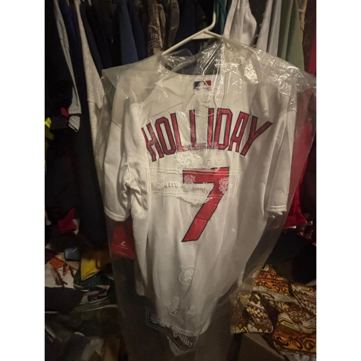 23.5W x 29L Celebrate the 2013 World Series with this authentic St. Louis Cardinals jersey. Featuring vibrant Cardinals logo and 'Holliday' with number 7 on the back, this Majestic jersey is perfect for fans and collectors alike. Made with breathable materials for comfort and durability. Tags are intact indicating it's unworn. Ideal for any baseball enthusiast or memorabilia collector. #WorldSeries #Cardinals #Majestic