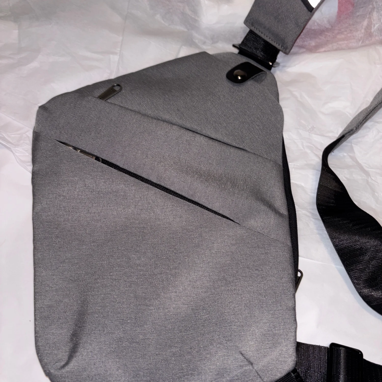 Unisex grey crossbody sling bag with a sleek and modern design. Features multiple zippered compartments for secure storage, an adjustable shoulder strap with a reflective stripe for added visibility, and a compact, durable construction. Ideal for everyday use or travel. #slingbag #crossbody #modern