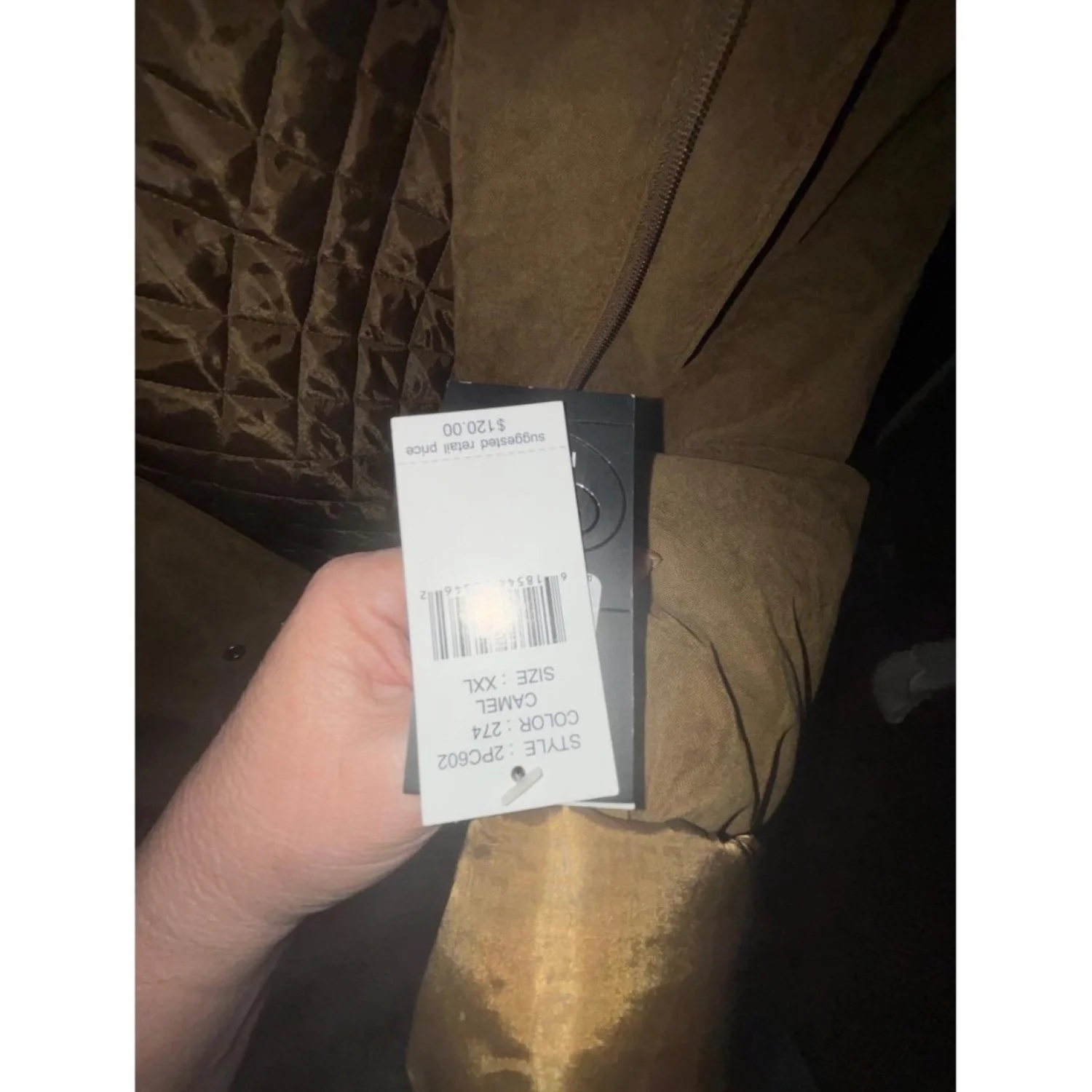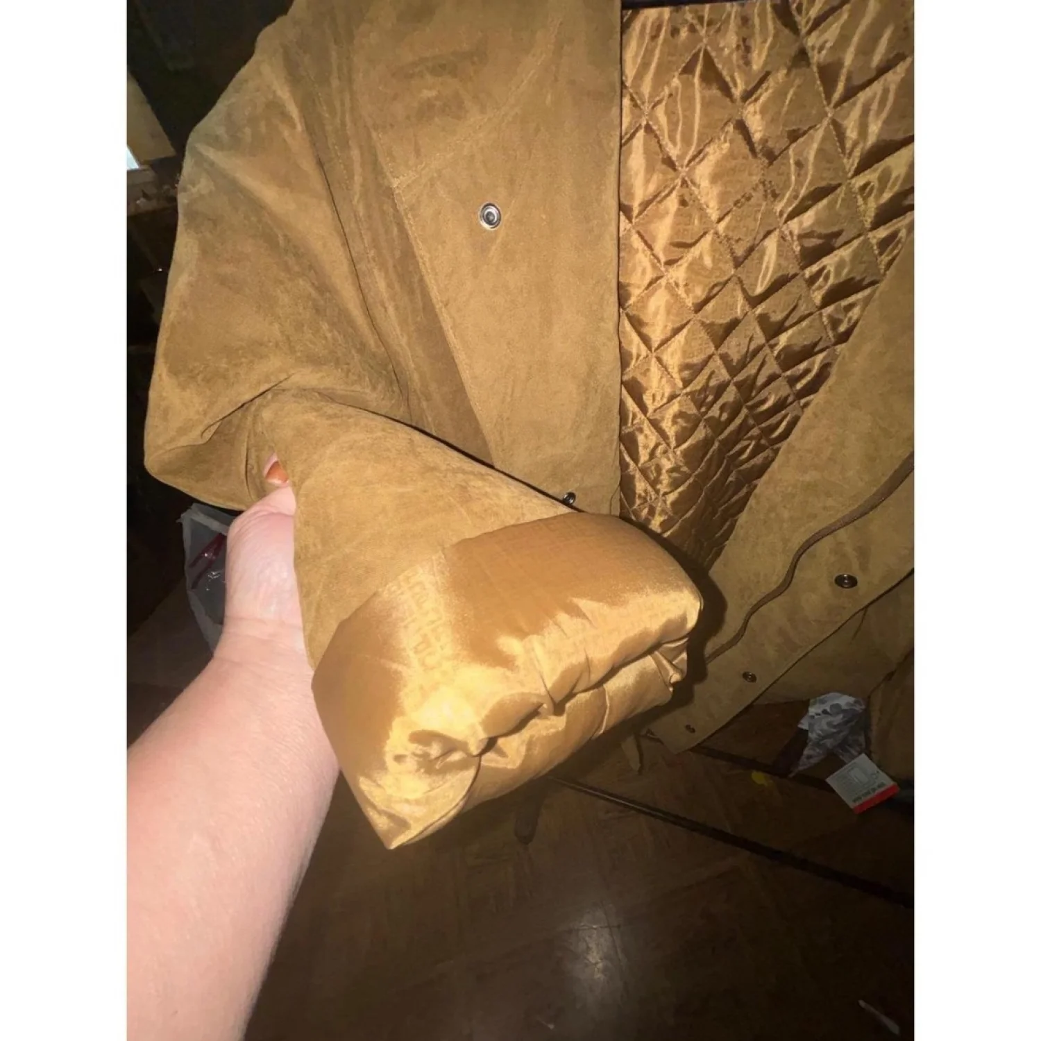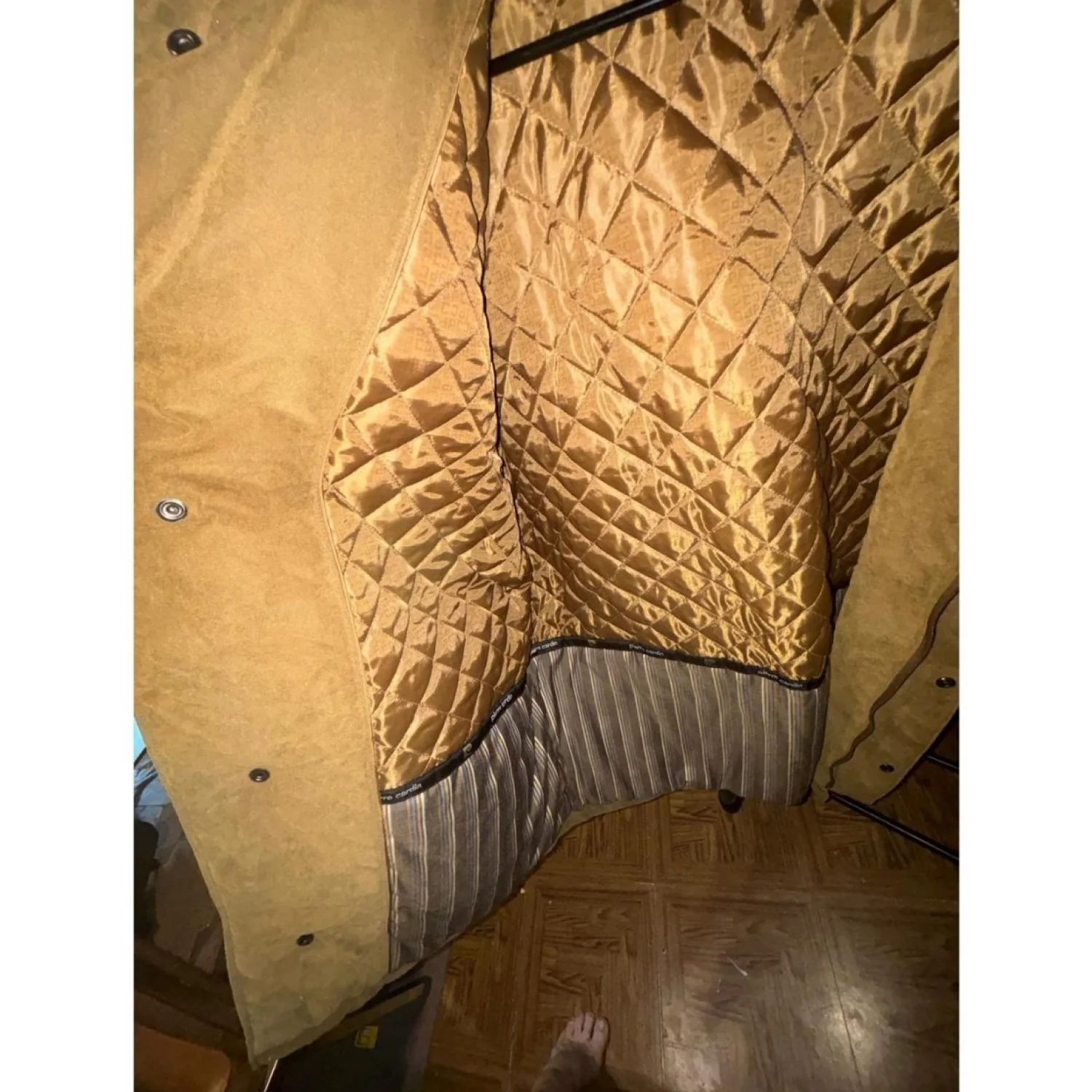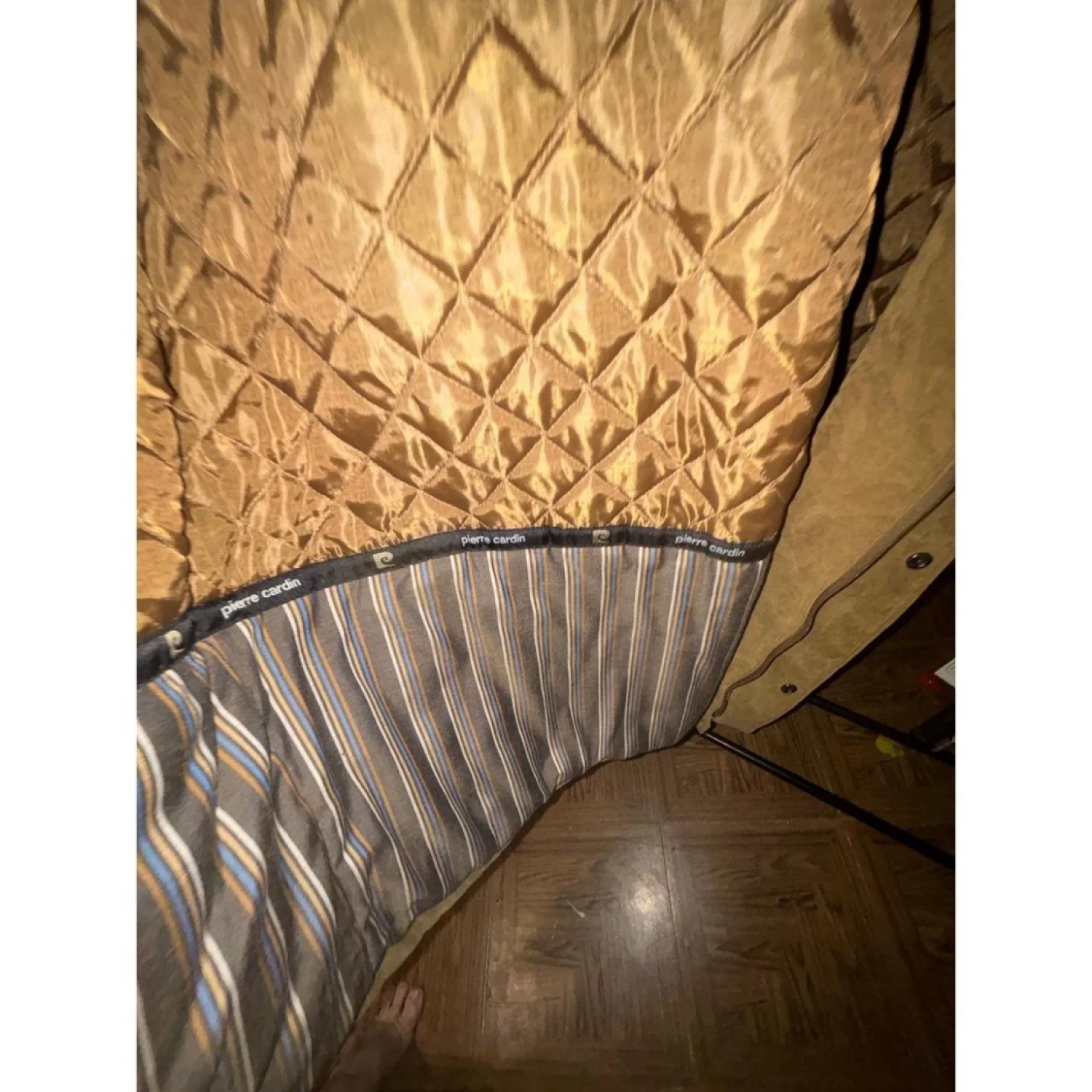 This Pierre Cardin jacket features a stylish tan exterior with a quilted design for added warmth and comfort. The jacket includes a snap button closure and a diamond-patterned lining with striped detailing at the bottom hem. Perfect for layering during cooler seasons. Made from durable materials with quality craftsmanship. Ideal for adding a touch of elegance to your wardrobe. #PierreCardin #Jacket #Quilted #Tan