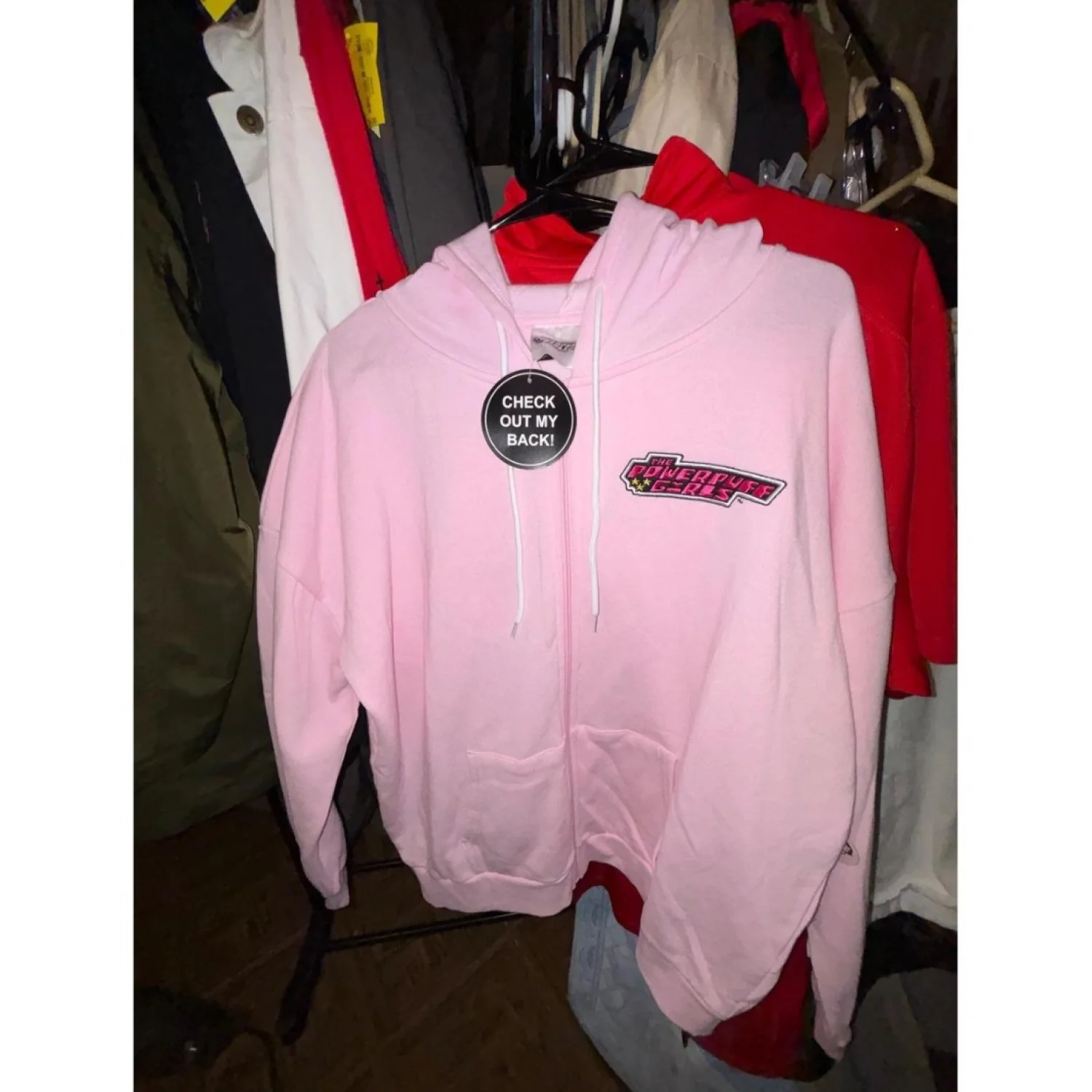 This pink hoodie features a vibrant Powerpuff Girls graphic on the back, adding a nostalgic and playful touch to your wardrobe. Made of a soft cotton-polyester blend, it is perfect for casual wear. The hoodie is equipped with a drawstring at the hood and ribbed cuffs for added comfort. Size XL. Perfect for fans of retro cartoons. #PowerpuffGirls #Hoodie #Cartoon