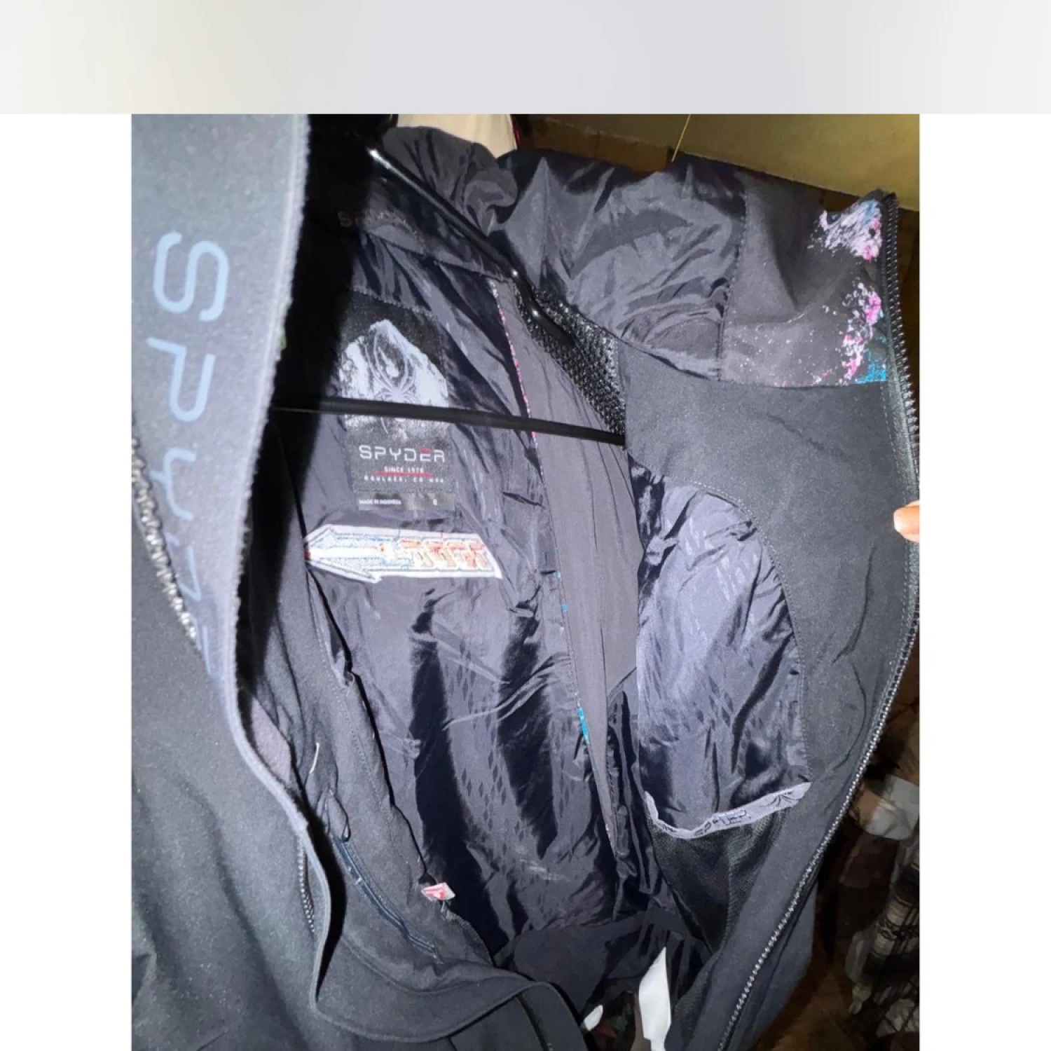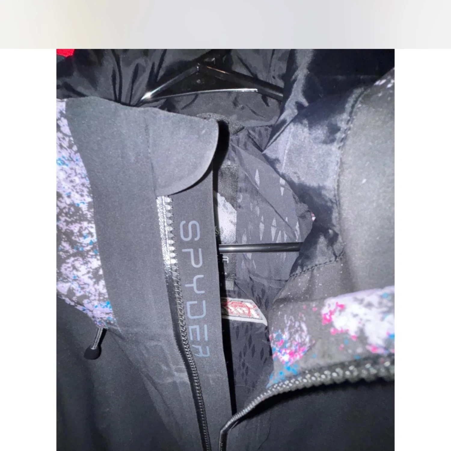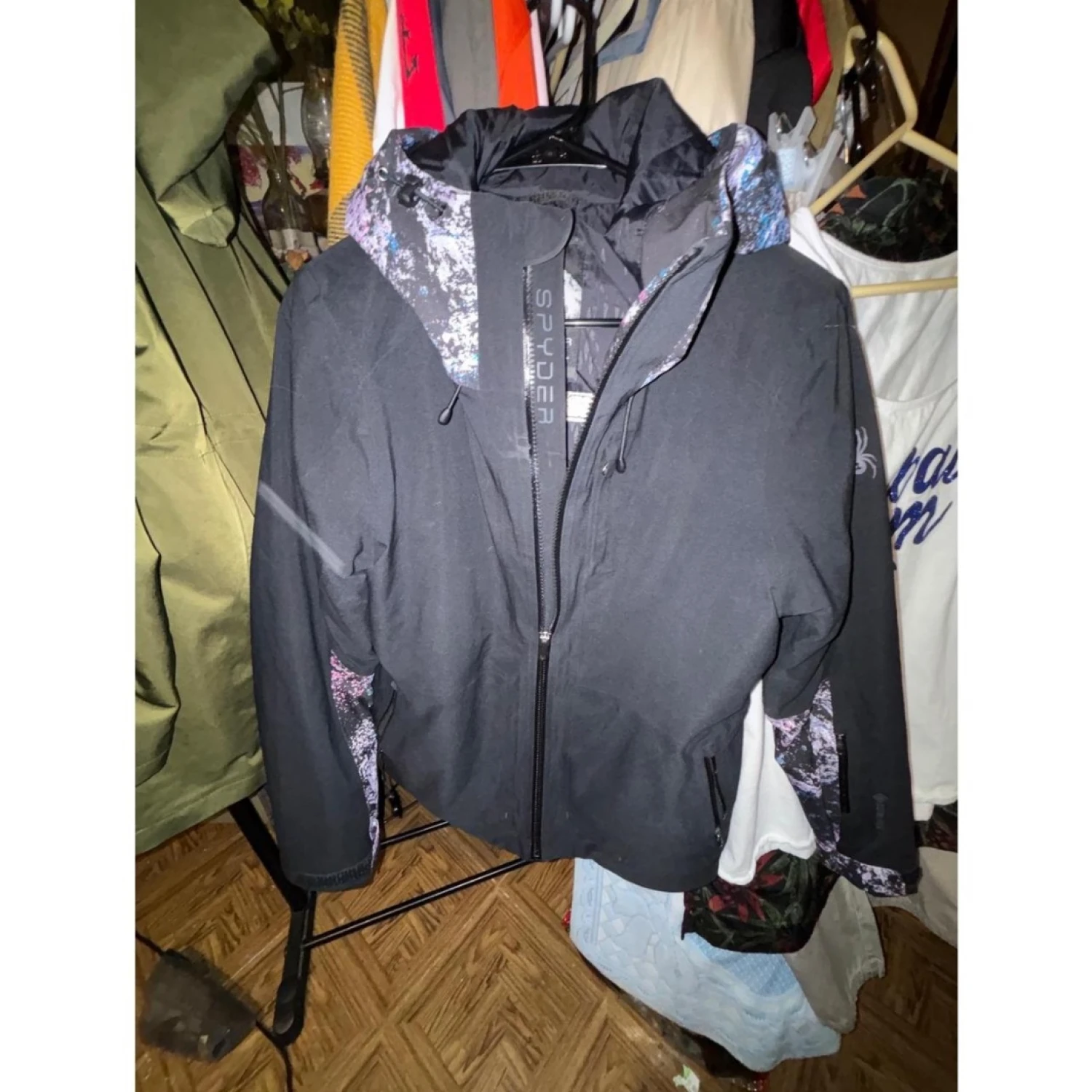 19L x 26W Spyder women's ski jacket in black with subtle graphic details. Made for outdoor activities, this jacket features a hood and is insulated for warmth. It includes multiple pockets for storage and has a zip fastening. Size M. Ideal for skiing and other winter sports. #ski #wintergear #Spyder