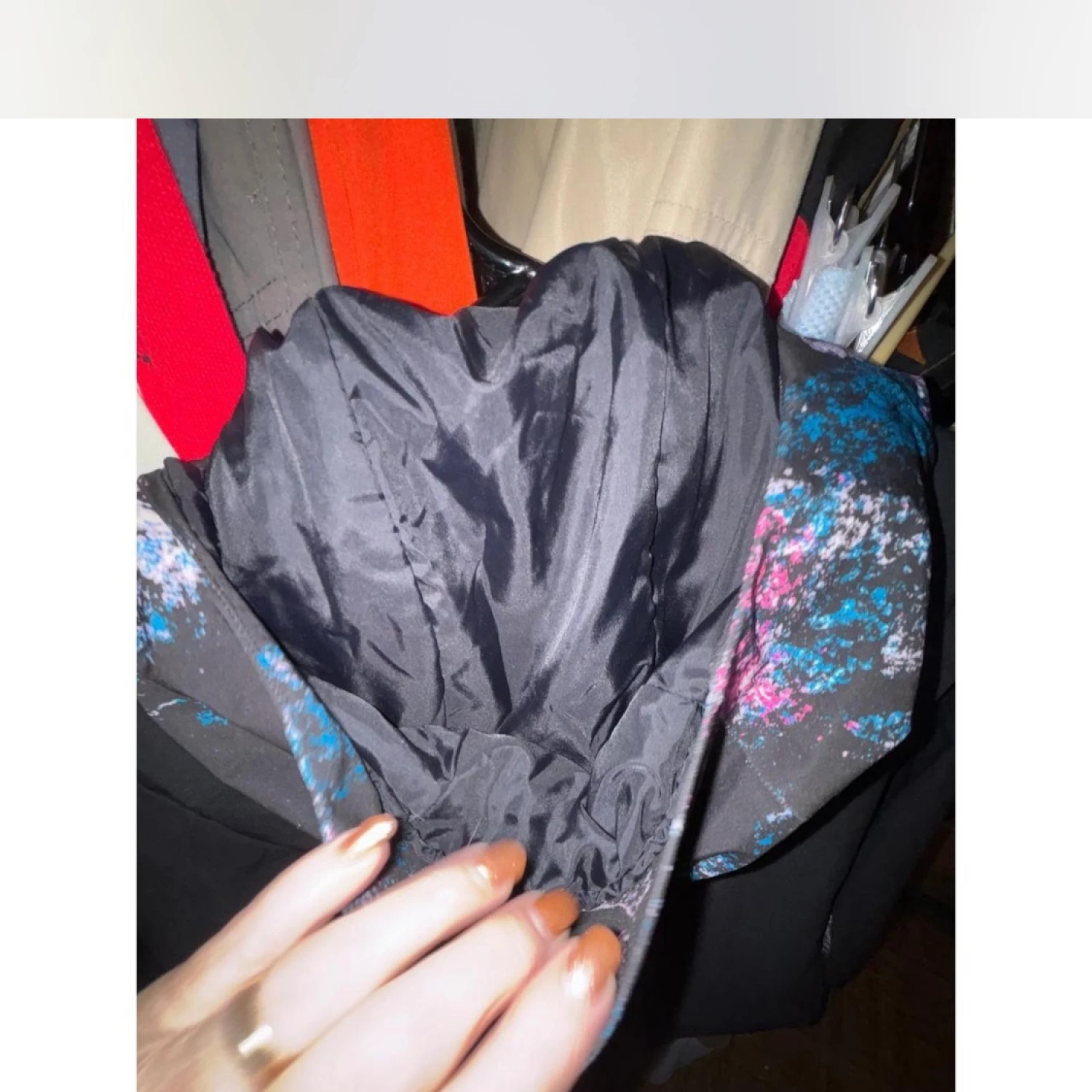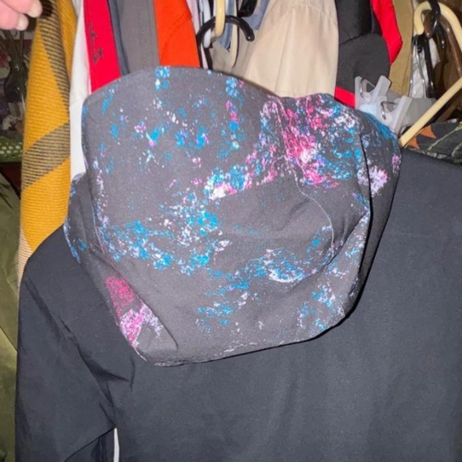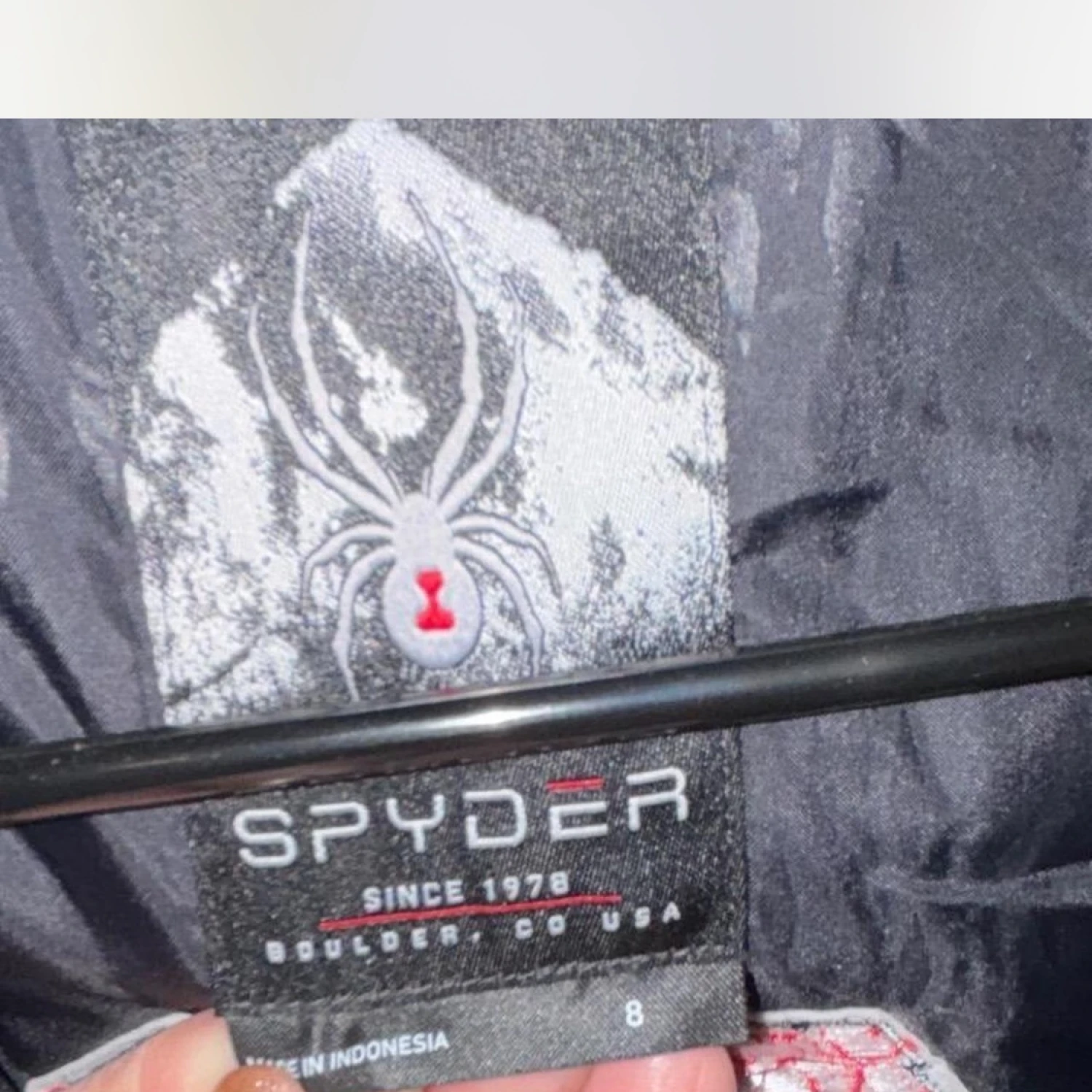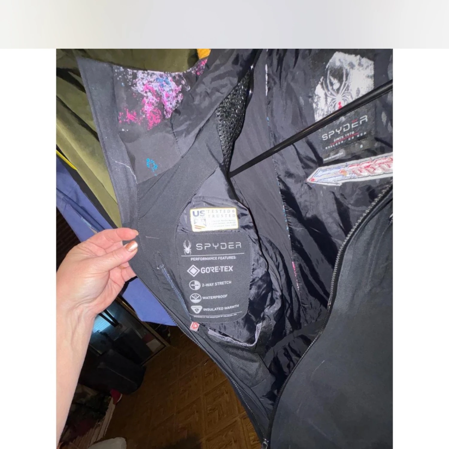 19L x 26W Spyder women's ski jacket in black with subtle graphic details. Made for outdoor activities, this jacket features a hood and is insulated for warmth. It includes multiple pockets for storage and has a zip fastening. Size M. Ideal for skiing and other winter sports. #ski #wintergear #Spyder