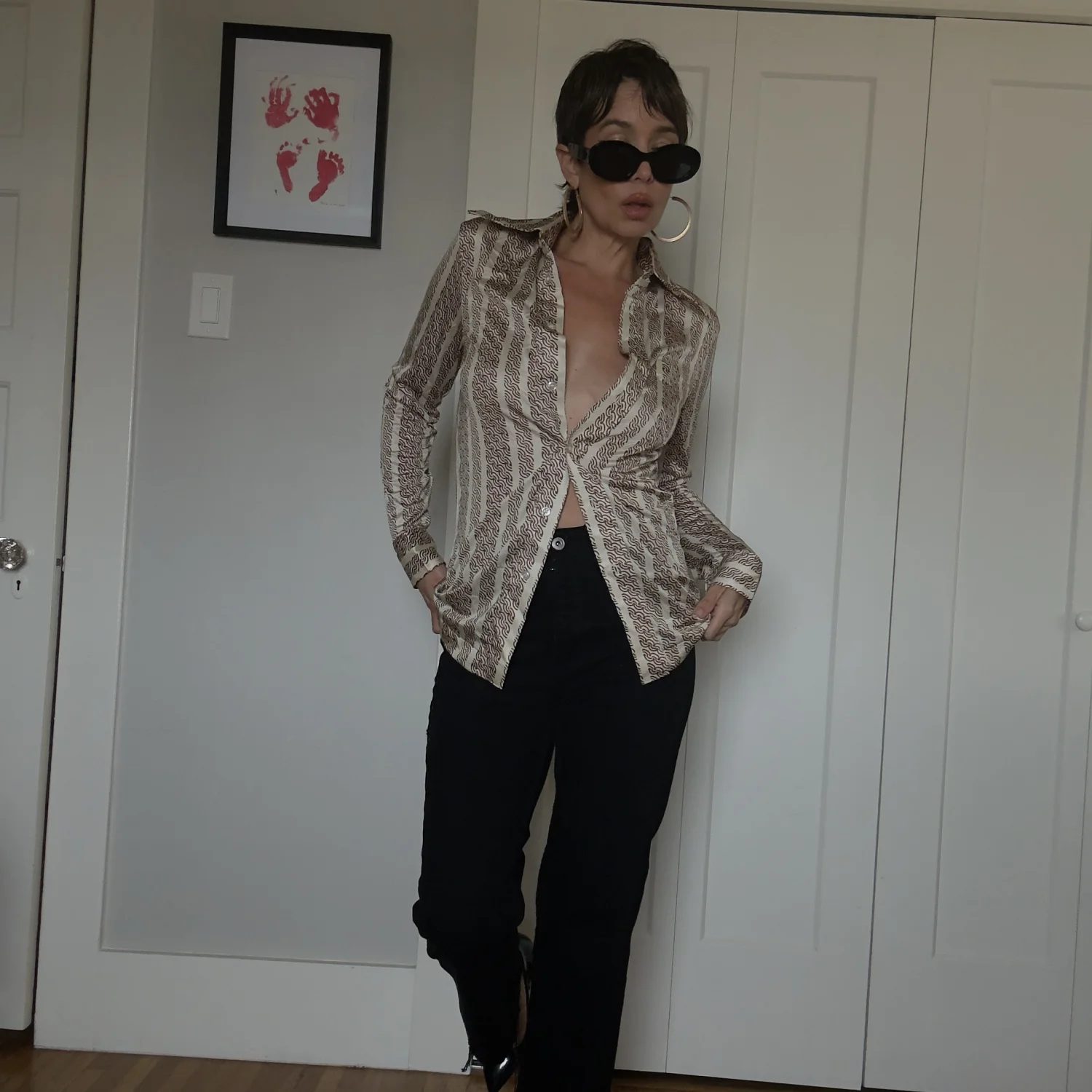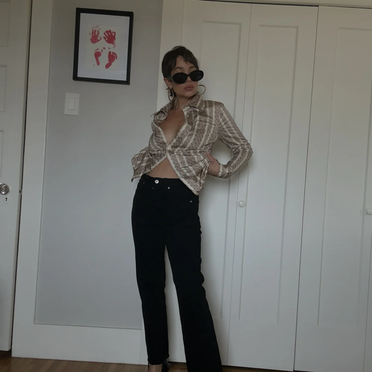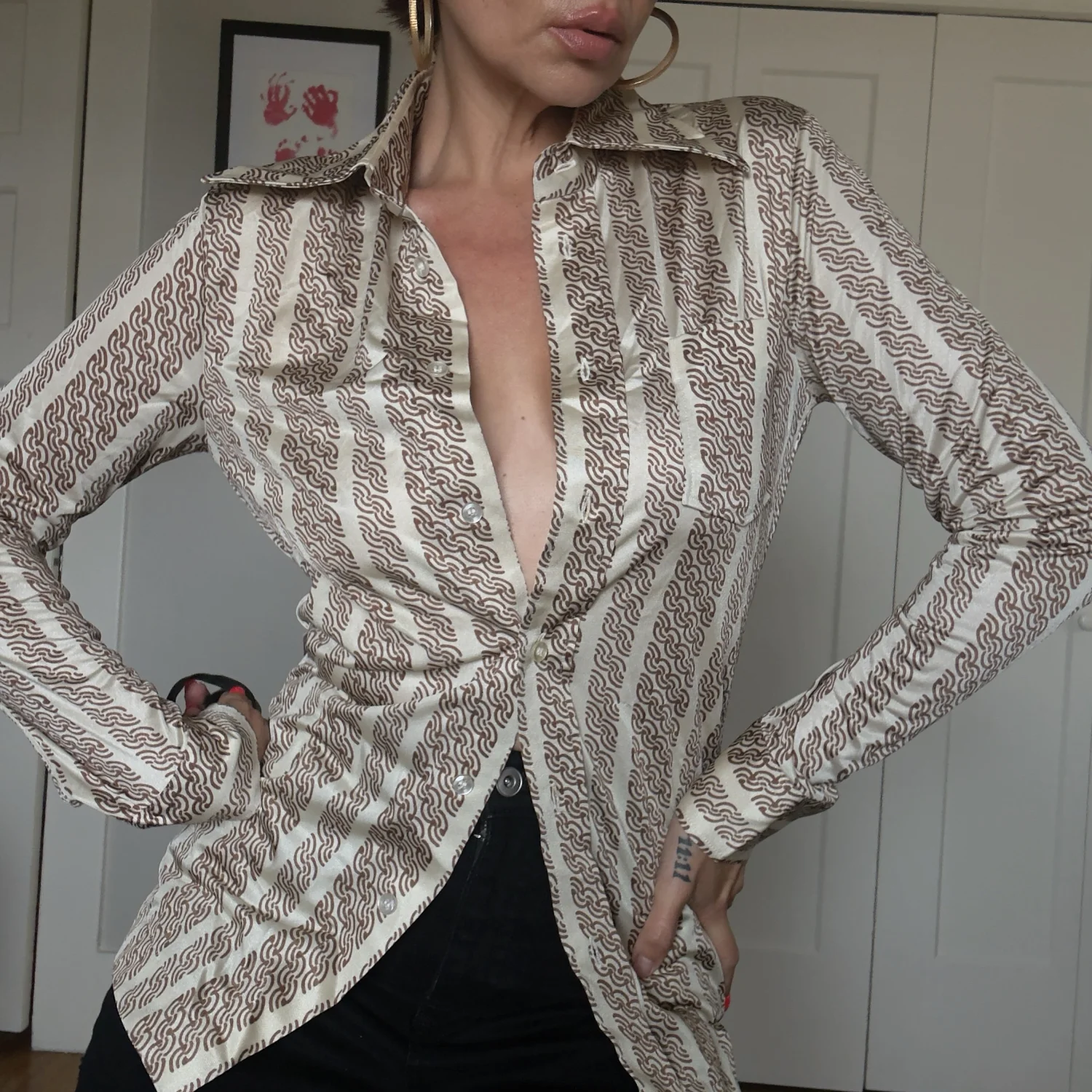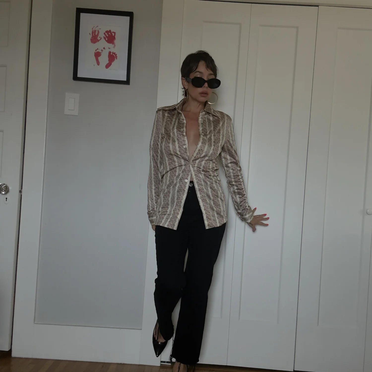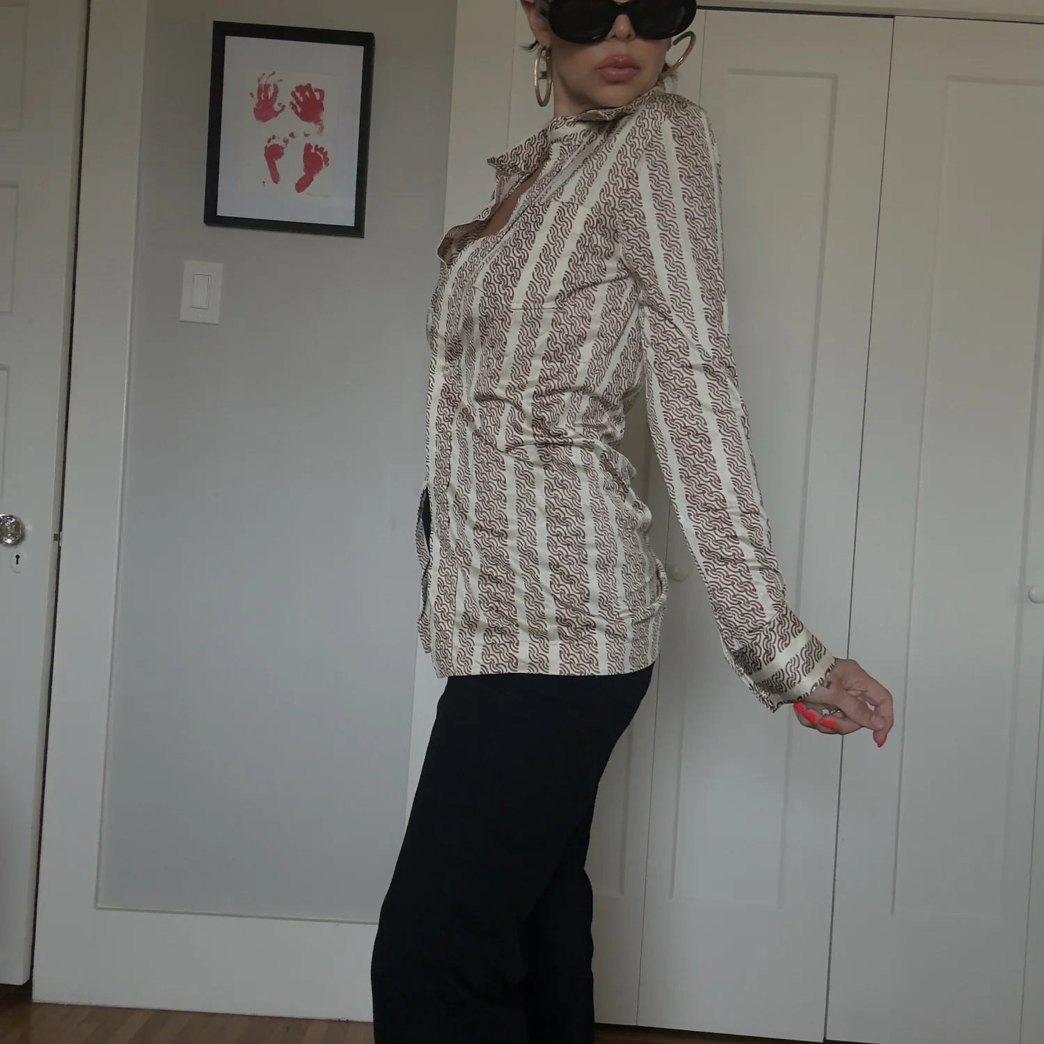 True vintage find — lightweight with a soft, effortless drape and that classic 70s boho feel. Earthy tones that pair perfectly with denim or skirts. Timeless, unique piece you won’t come across often Excellent condition ✨ No size tag Fits like XS Measurements: • Pit to pit: 15” • Length (pit to hem): 19” #vintage70s #bohostyle #vintageblouse #earthtones #retrostyle