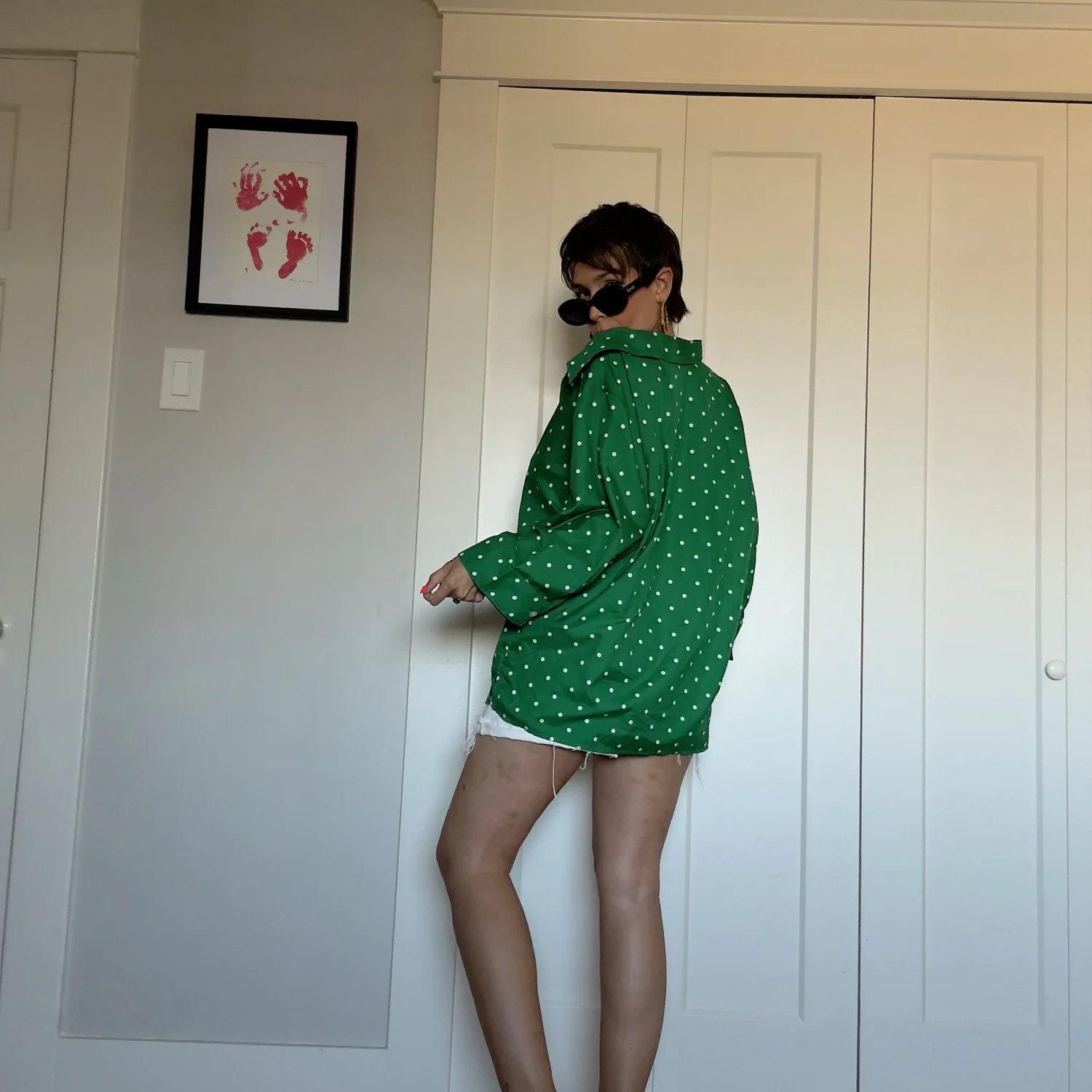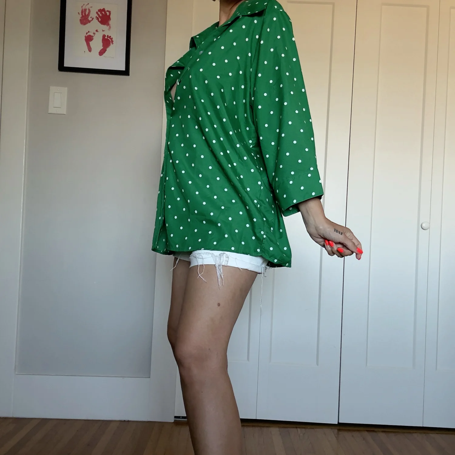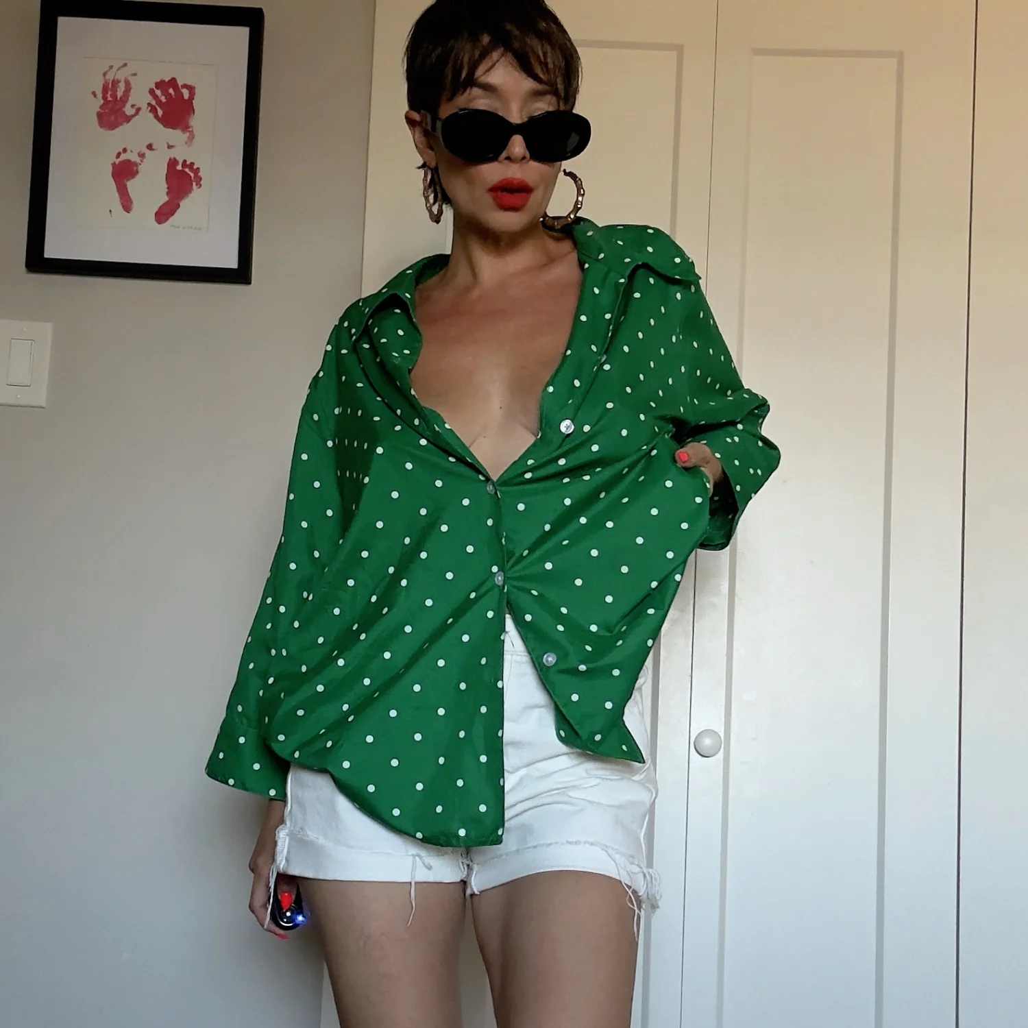 80s Kelly green polka dot blouse by National. Lightweight with a relaxed, slightly oversized fit that can be worn loose, tucked, or tied. Playful print with classic vintage charm. Easy to style year-round — from casual to dressed up. Tagged size: 1X — fits more like L (oversized on smaller frames) Excellent vintage condition, no flaws Measurements: Pit to pit: 23” Pit to hem: 16.5” Model: 5’3” (32-25-35)