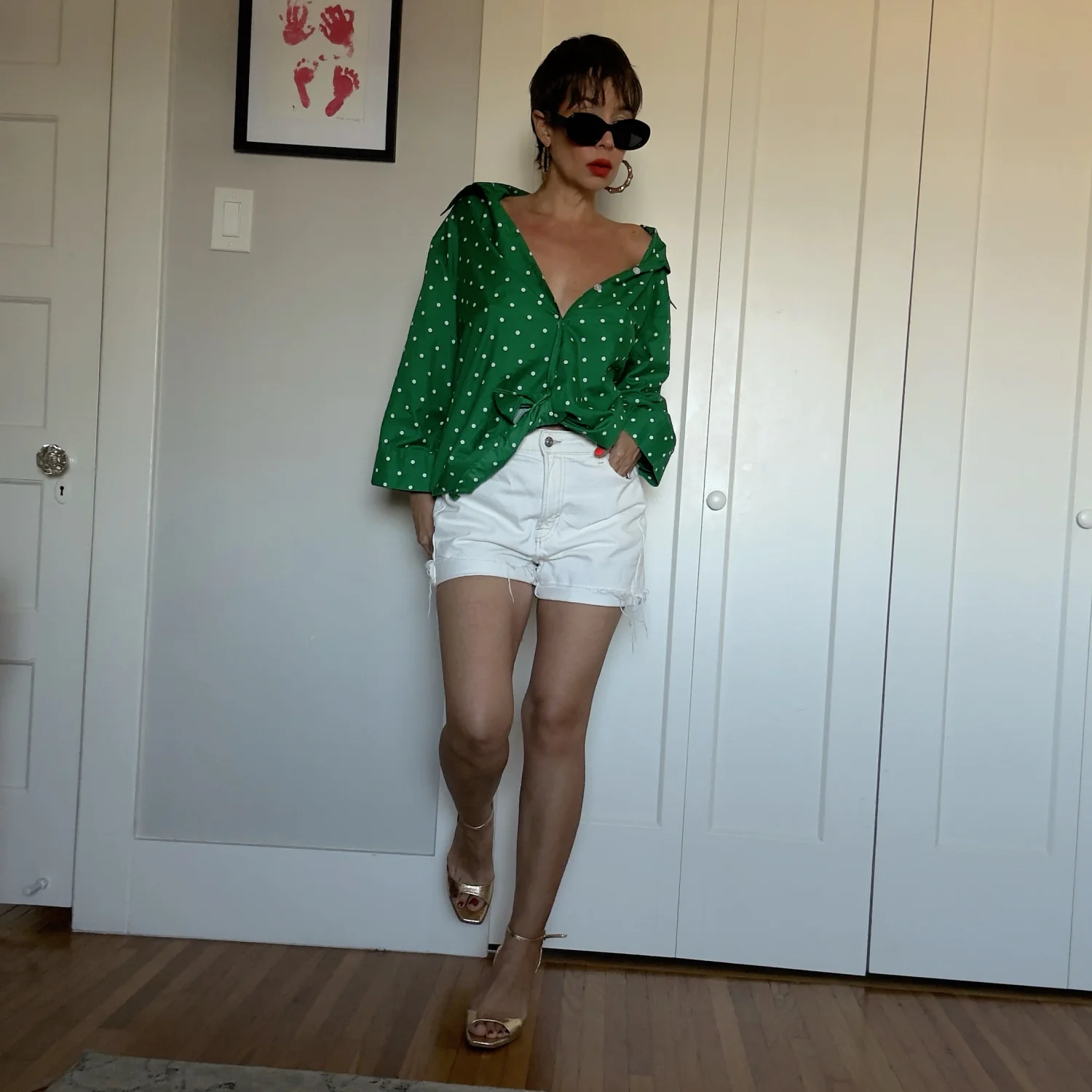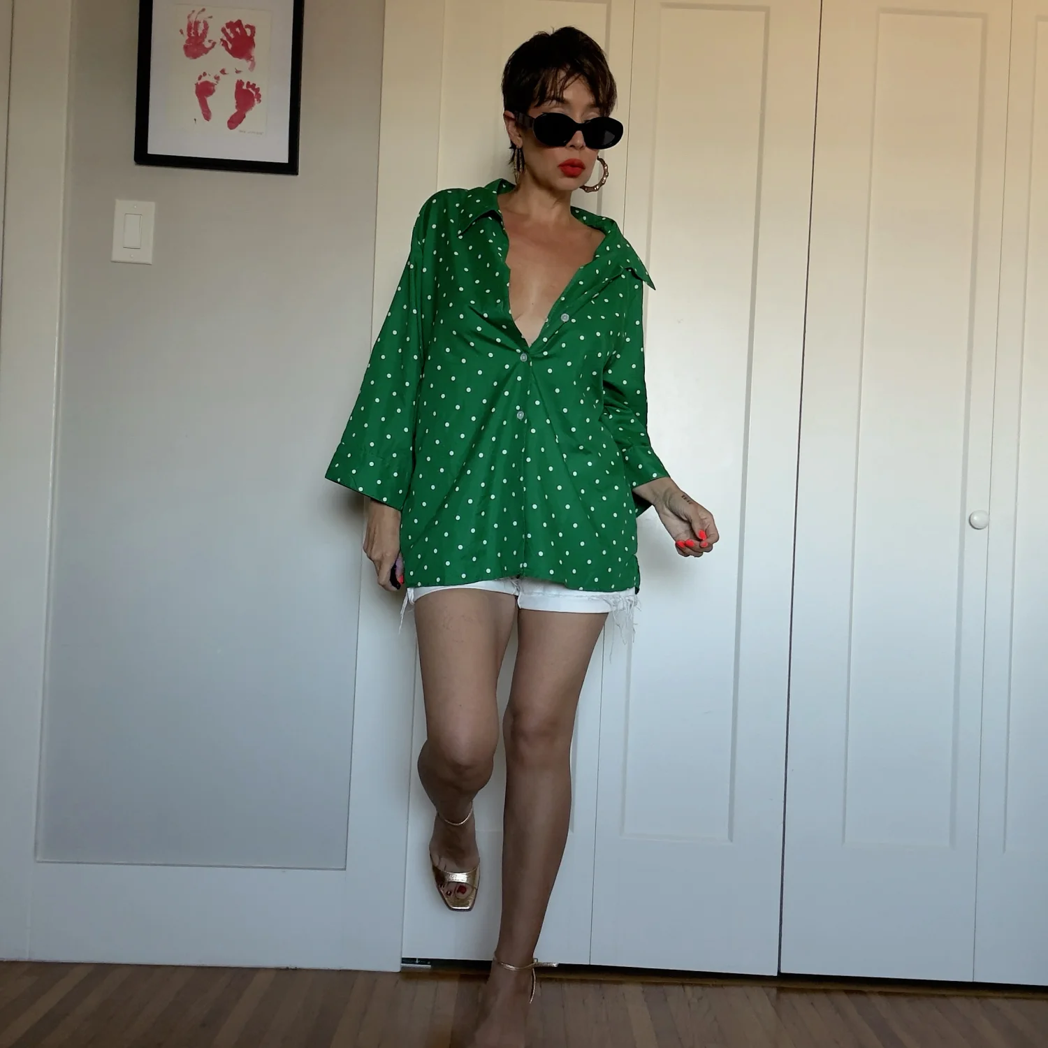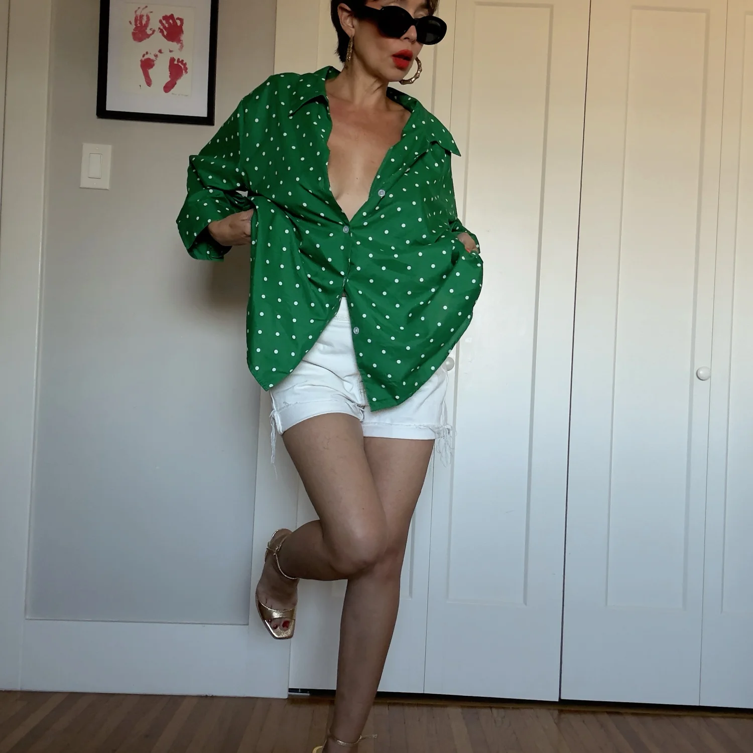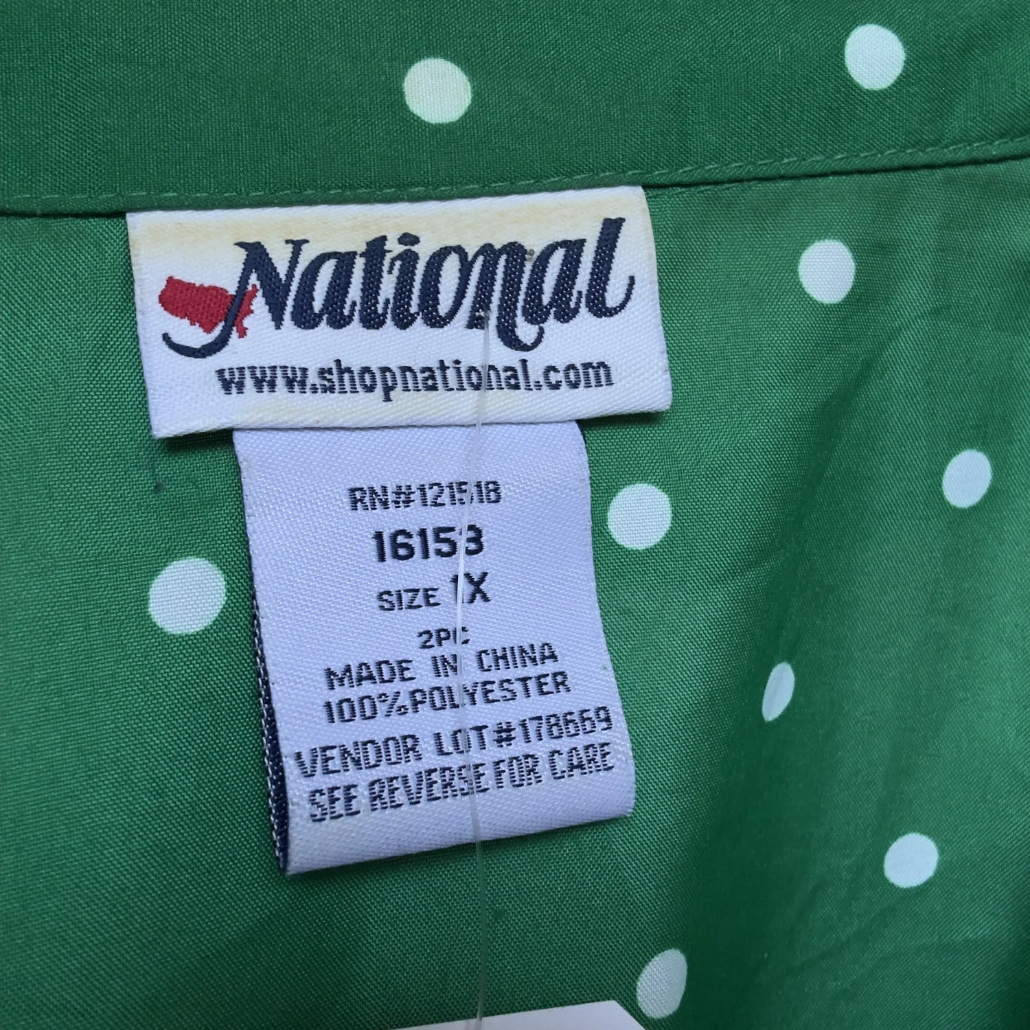 80s Kelly green polka dot blouse by National. Lightweight with a relaxed, slightly oversized fit that can be worn loose, tucked, or tied. Playful print with classic vintage charm. Easy to style year-round — from casual to dressed up. Tagged size: 1X — fits more like L (oversized on smaller frames) Excellent vintage condition, no flaws Measurements: Pit to pit: 23” Pit to hem: 16.5” Model: 5’3” (32-25-35)
