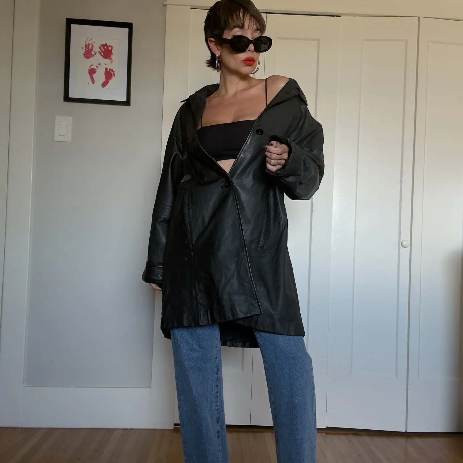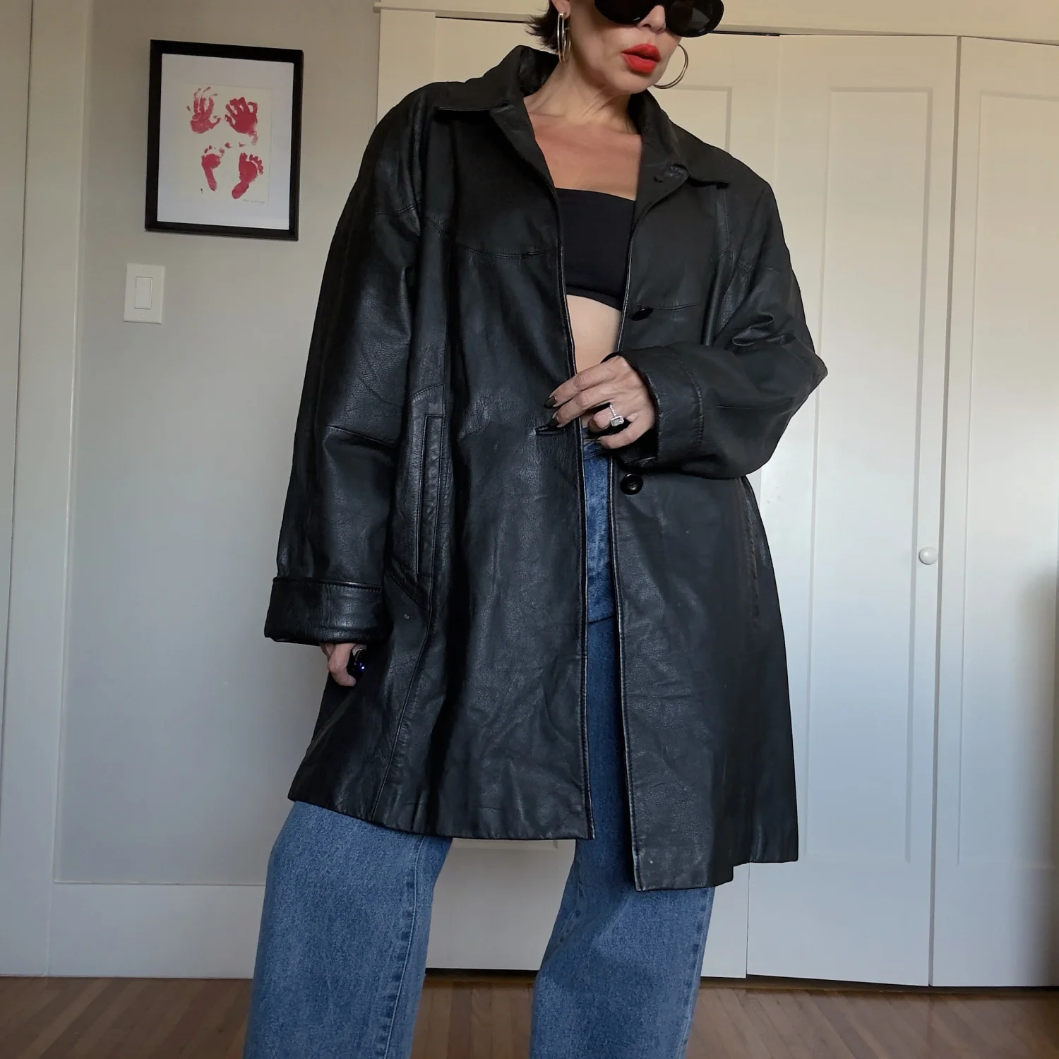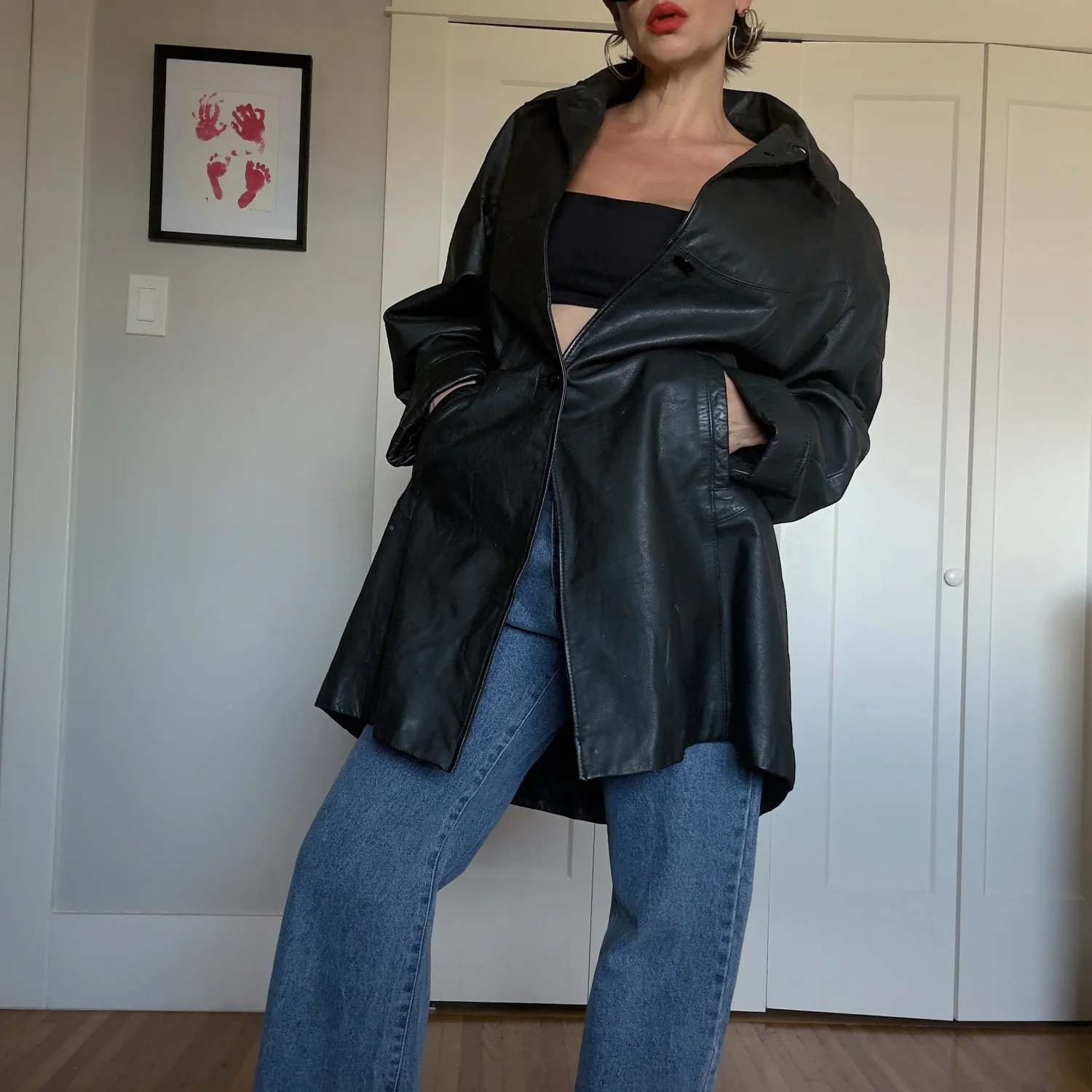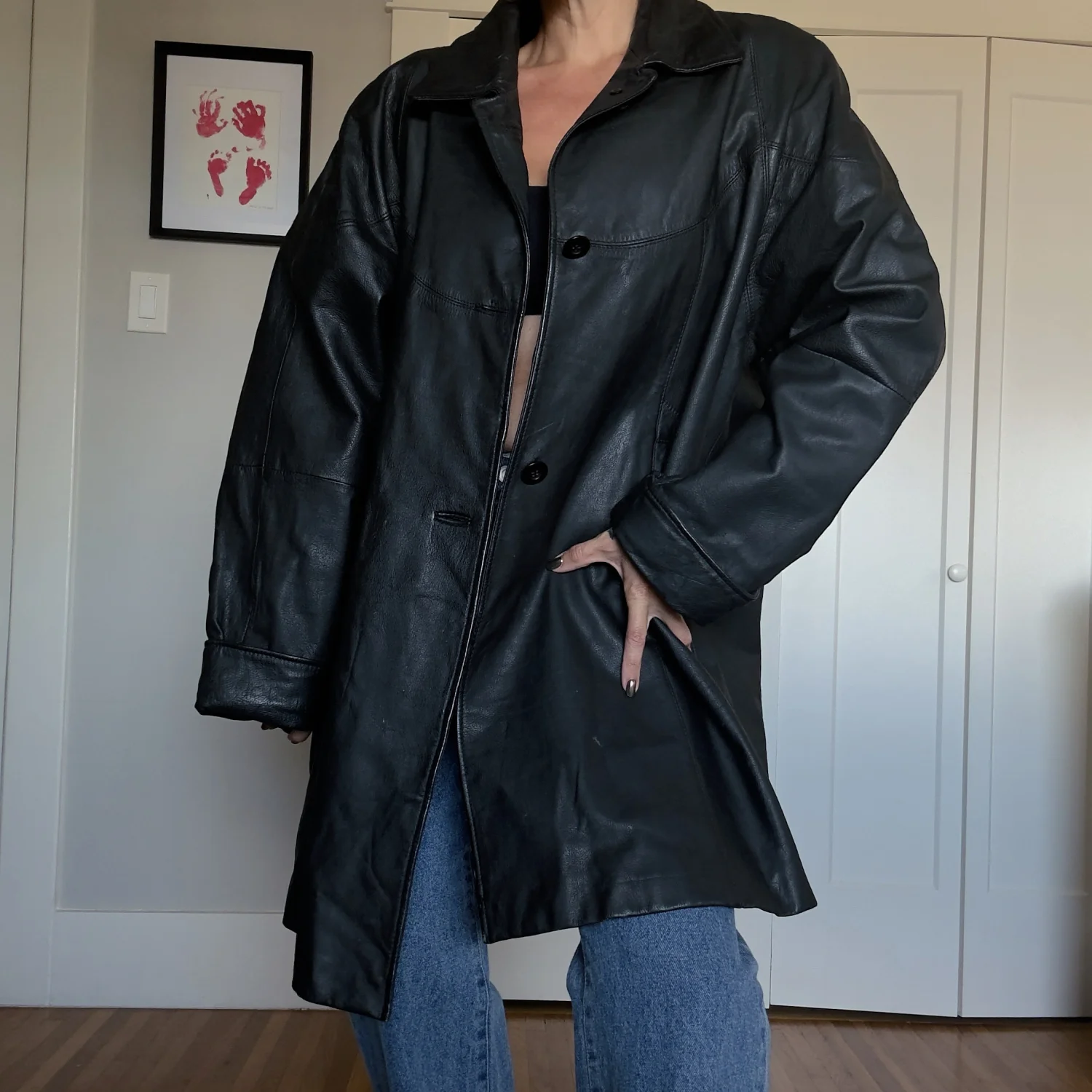 Black genuine leather jacket with a structured, oversized fit. Classic, edgy, and timeless with that cool matrix-inspired feel. Easy to style year-round — throw over anything to instantly elevate the look. Side pockets Two button front Excellent vintage condition-light signs of wear Estimated era: 1980s or 1990s Size: L (works oversized or more fitted depending on styling) 34” pit to hem 22.5” pit to pit Model: 5’3” (32-25-35.5)