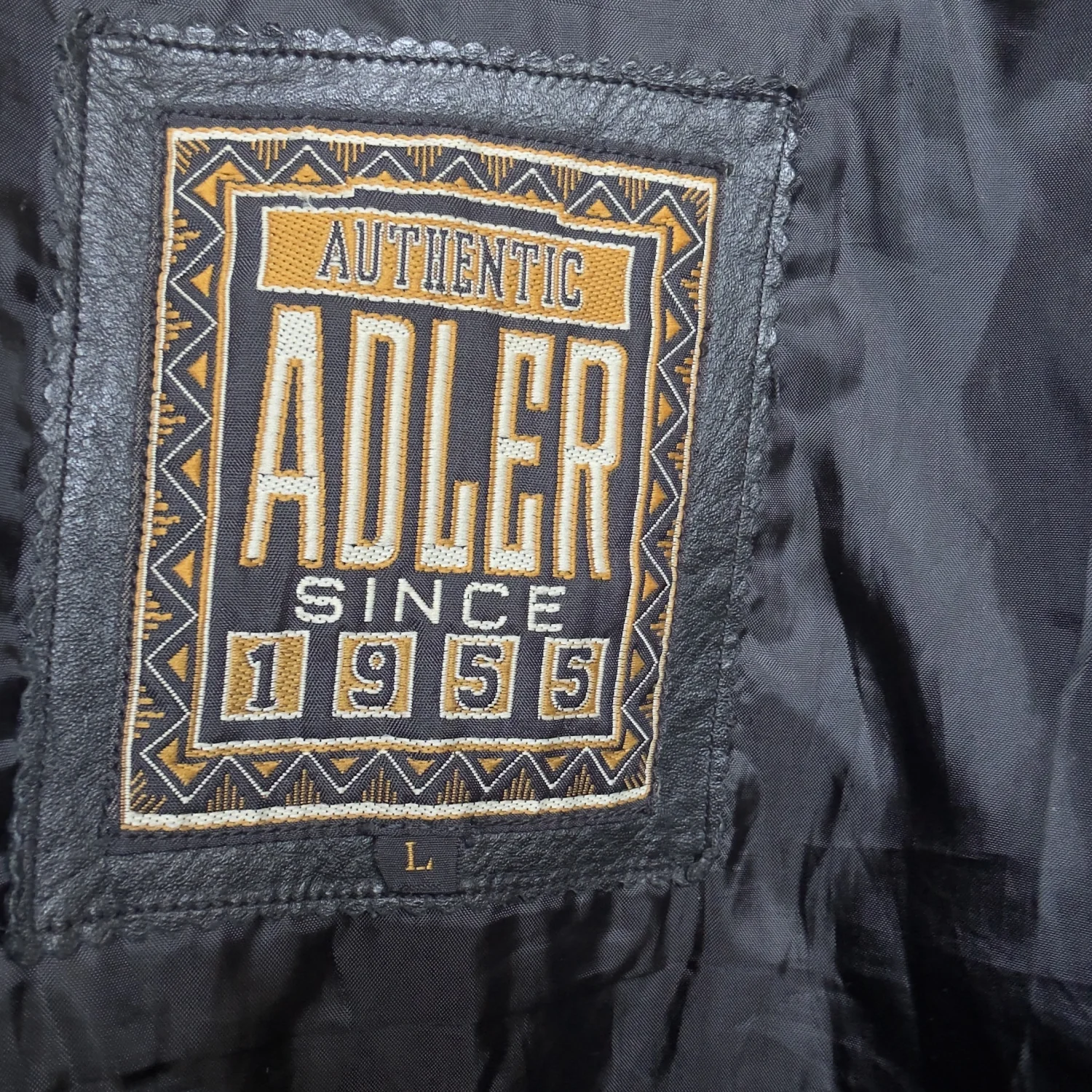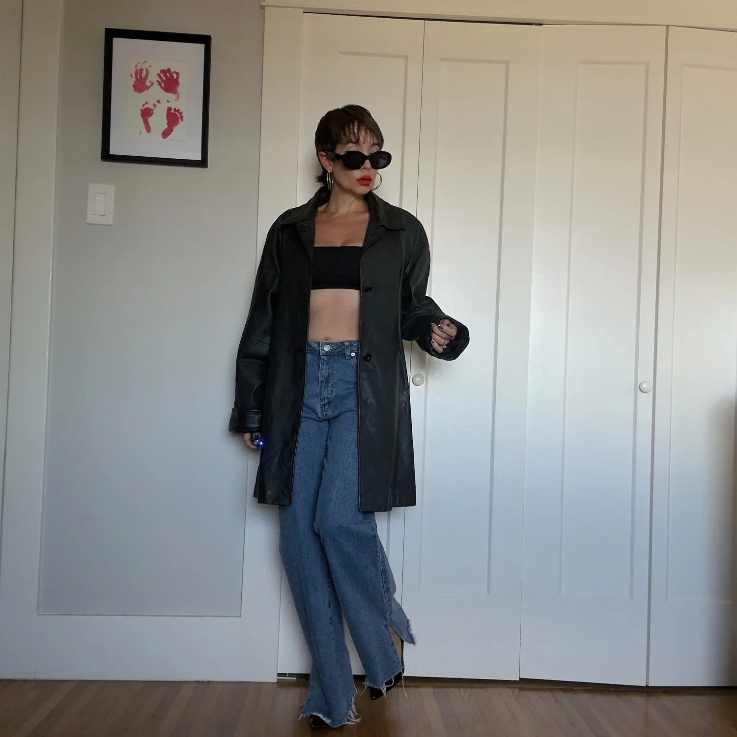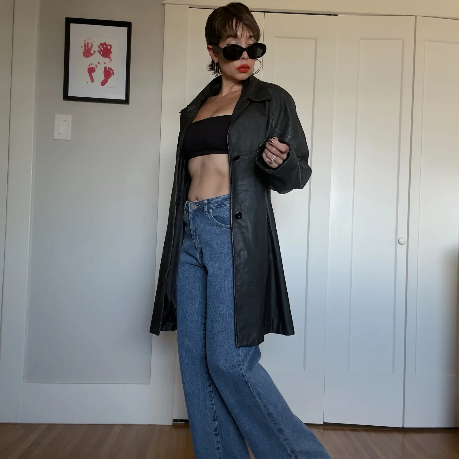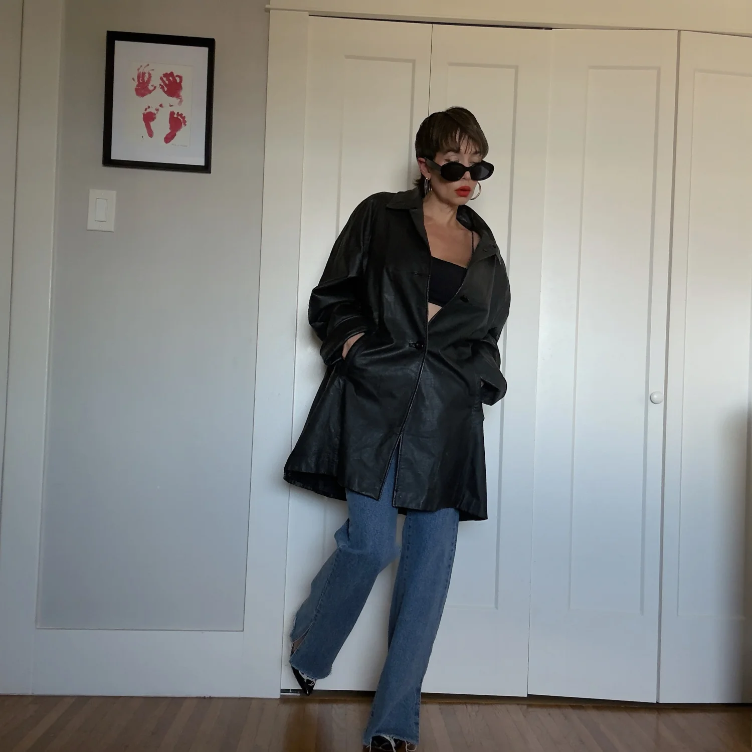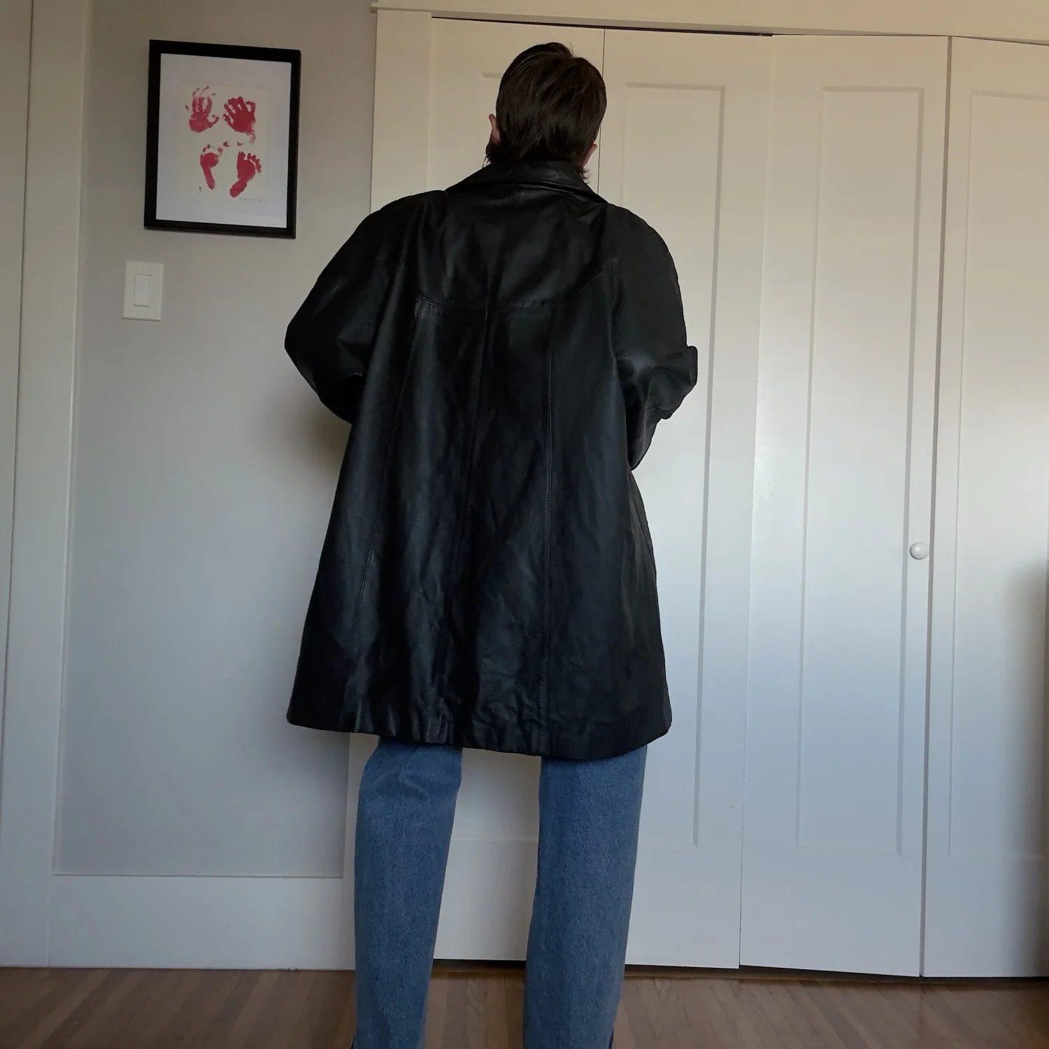 Black genuine leather jacket with a structured, oversized fit. Classic, edgy, and timeless with that cool matrix-inspired feel. Easy to style year-round — throw over anything to instantly elevate the look. Side pockets Two button front Excellent vintage condition-light signs of wear Estimated era: 1980s or 1990s Size: L (works oversized or more fitted depending on styling) 34” pit to hem 22.5” pit to pit Model: 5’3” (32-25-35.5)