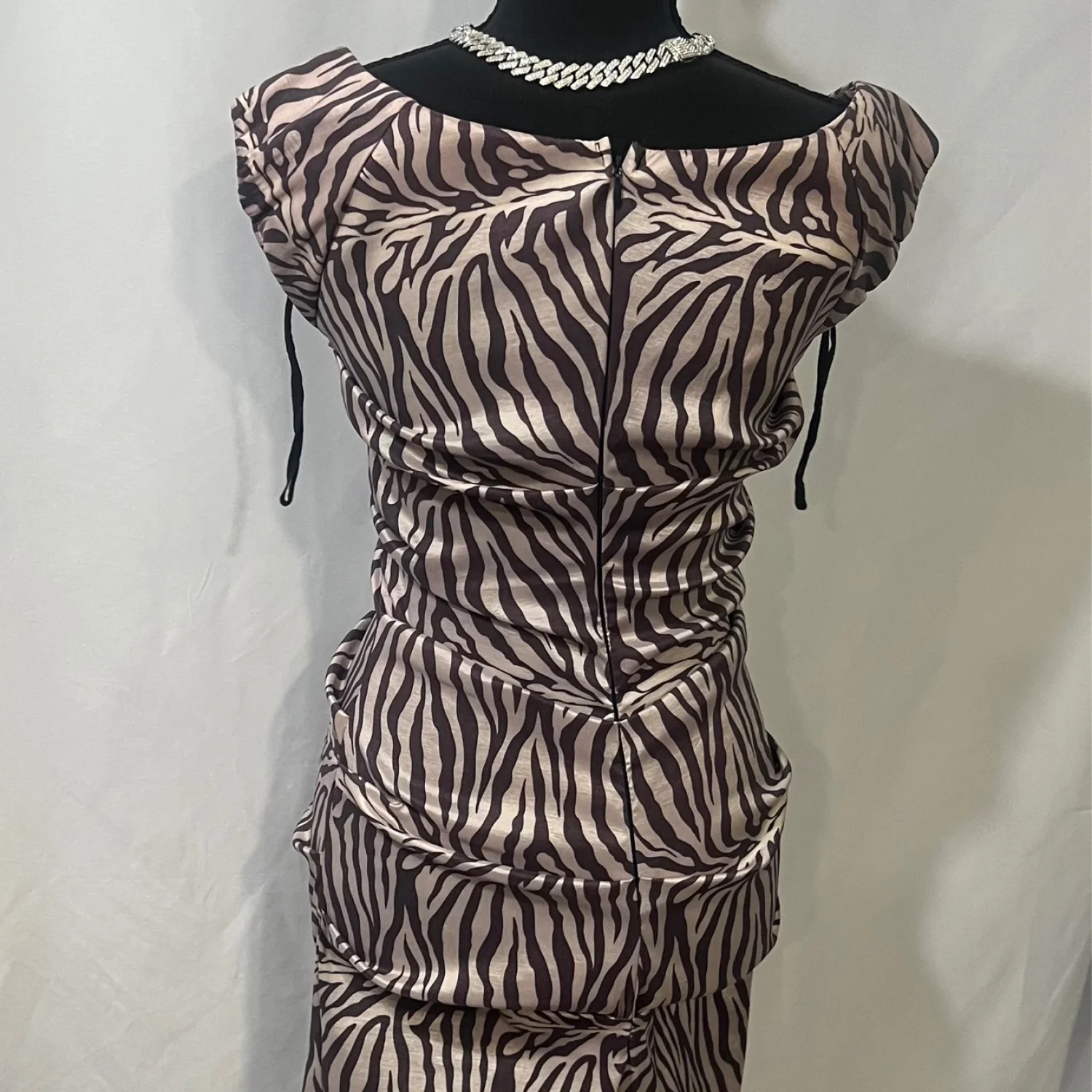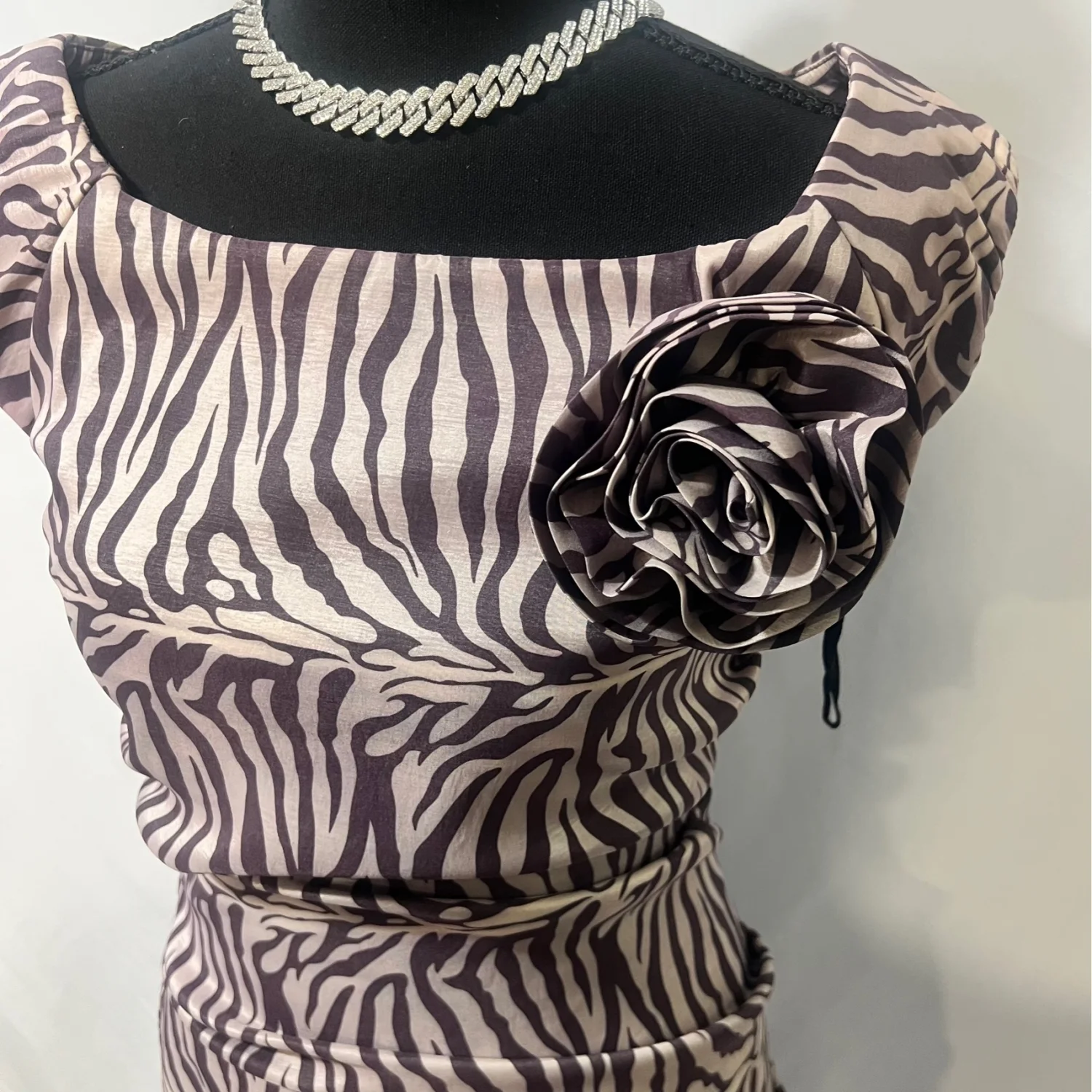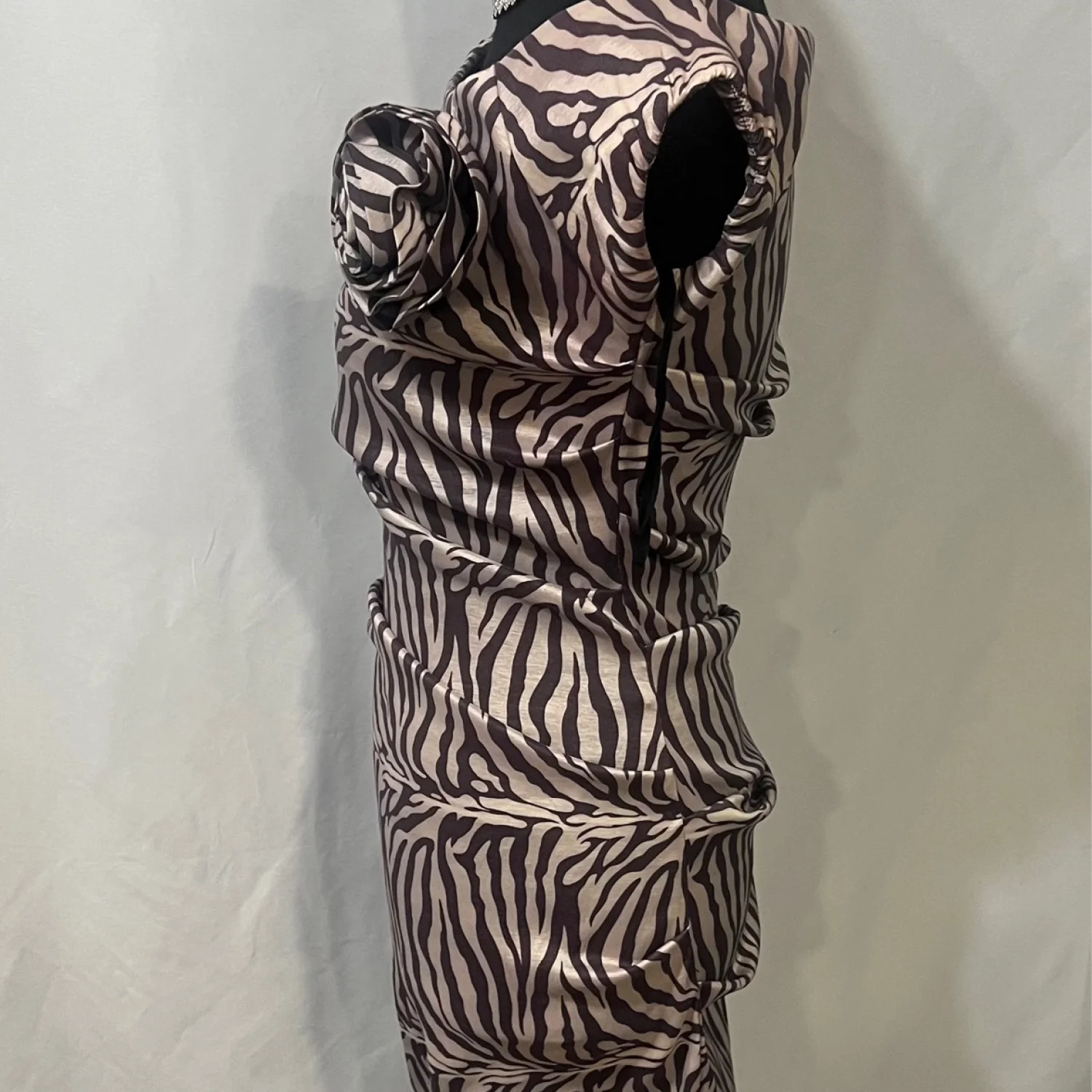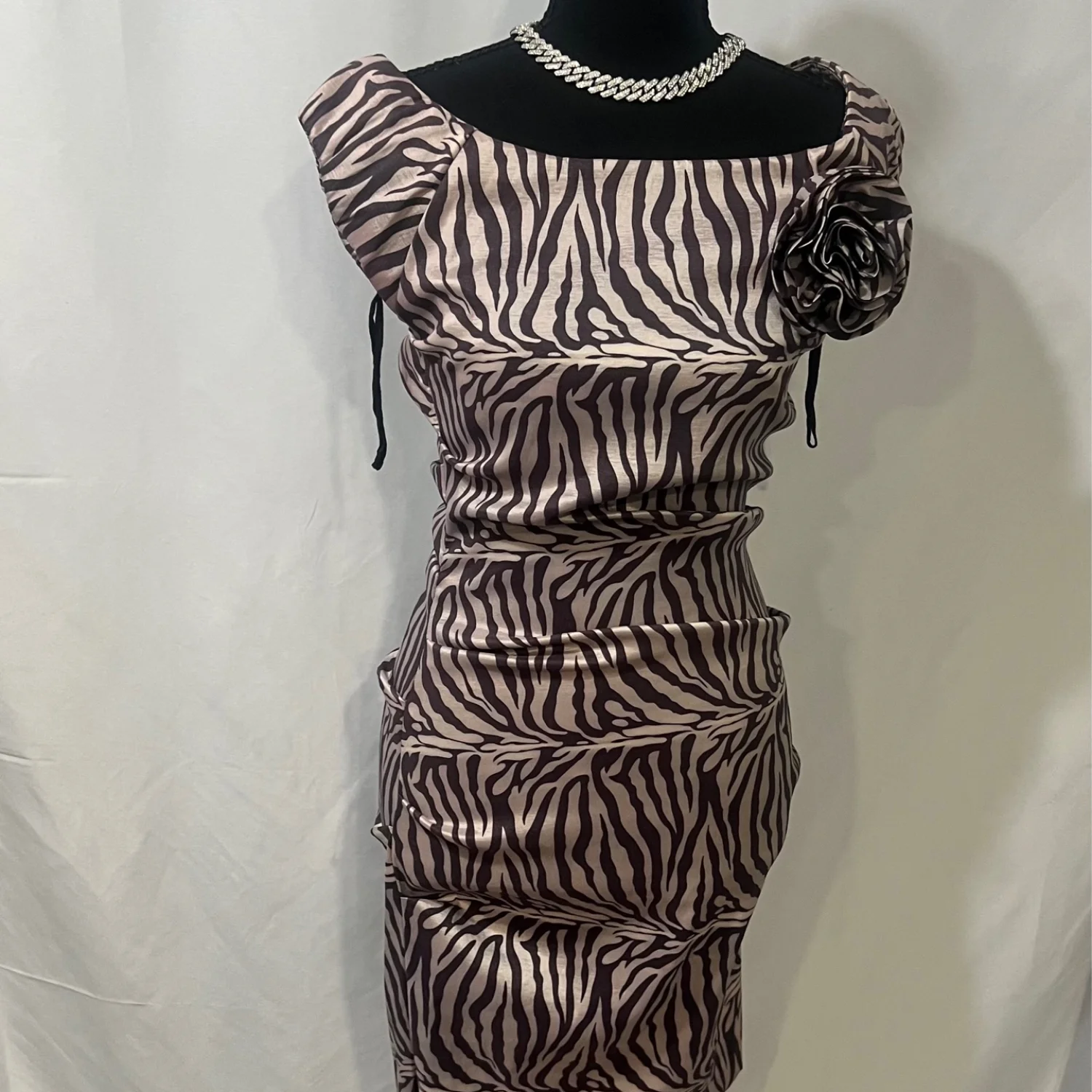 This striking Arden B cocktail dress features a bold zebra print in a form-fitting silhouette. It includes a stylish rosette embellishment on the shoulder and a classic round neckline, ideal for special occasions. Made from a comfortable fabric, this dress is perfect for making a statement. Tags: #ArdenB #ZebraPrint #CocktailDress #StatementFashion