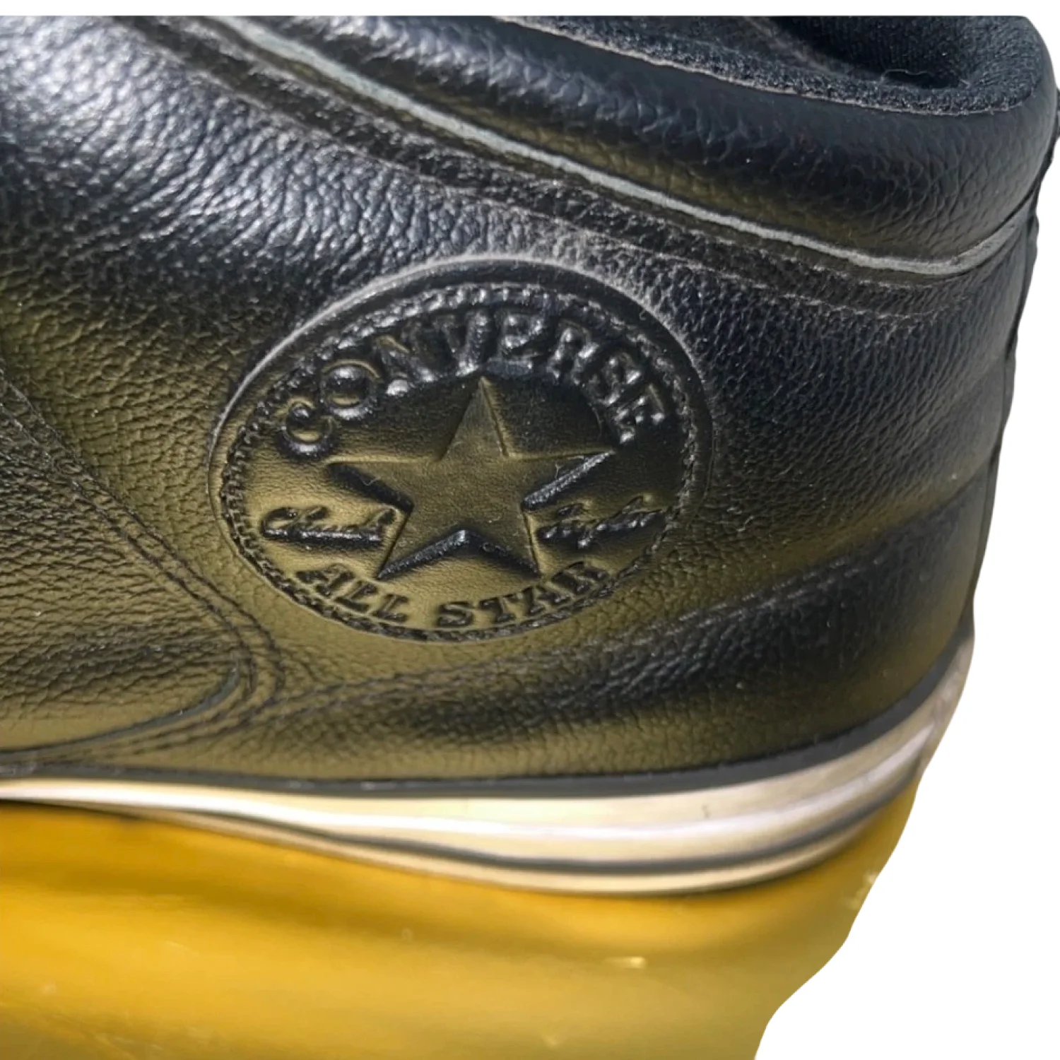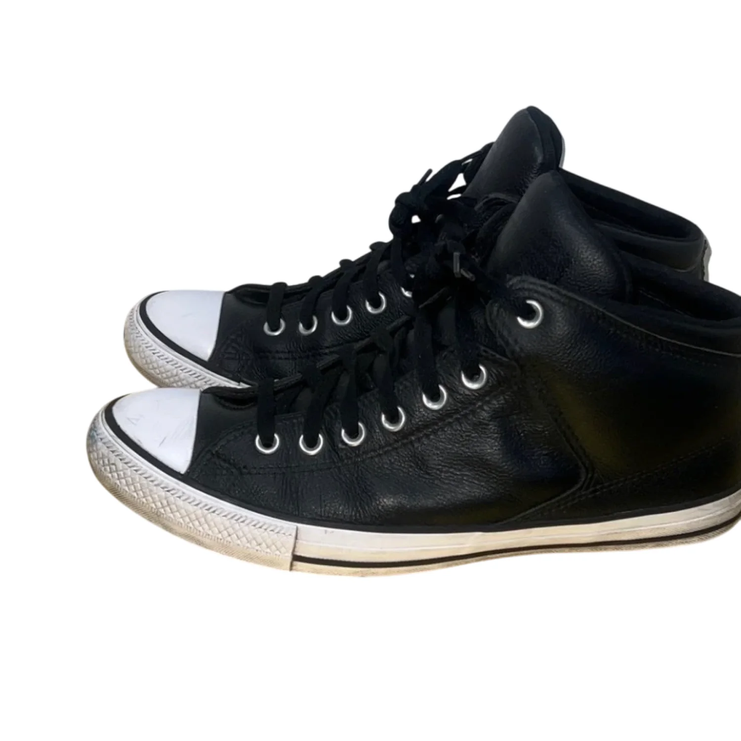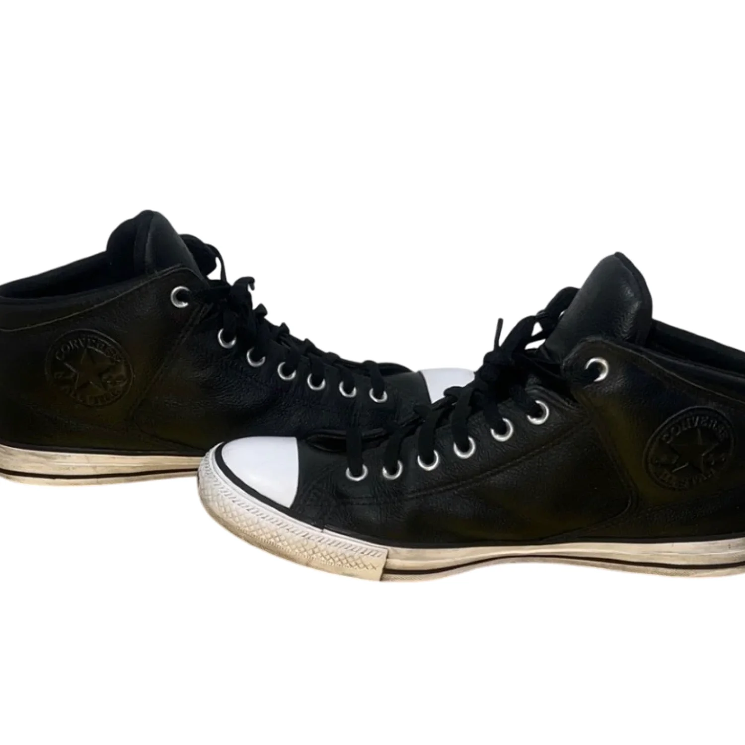Converse All Star black leather high top sneakers featuring a classic design. Made with leather uppers and textile lining, perfect for casual wear. Size US 11 for men or US 13 for women. Includes iconic Converse branding on the sides and soles. Condition is good with some wear on the soles. Ideal for adding a touch of classic style to any outfit. #Converse #Sneakers #HighTops