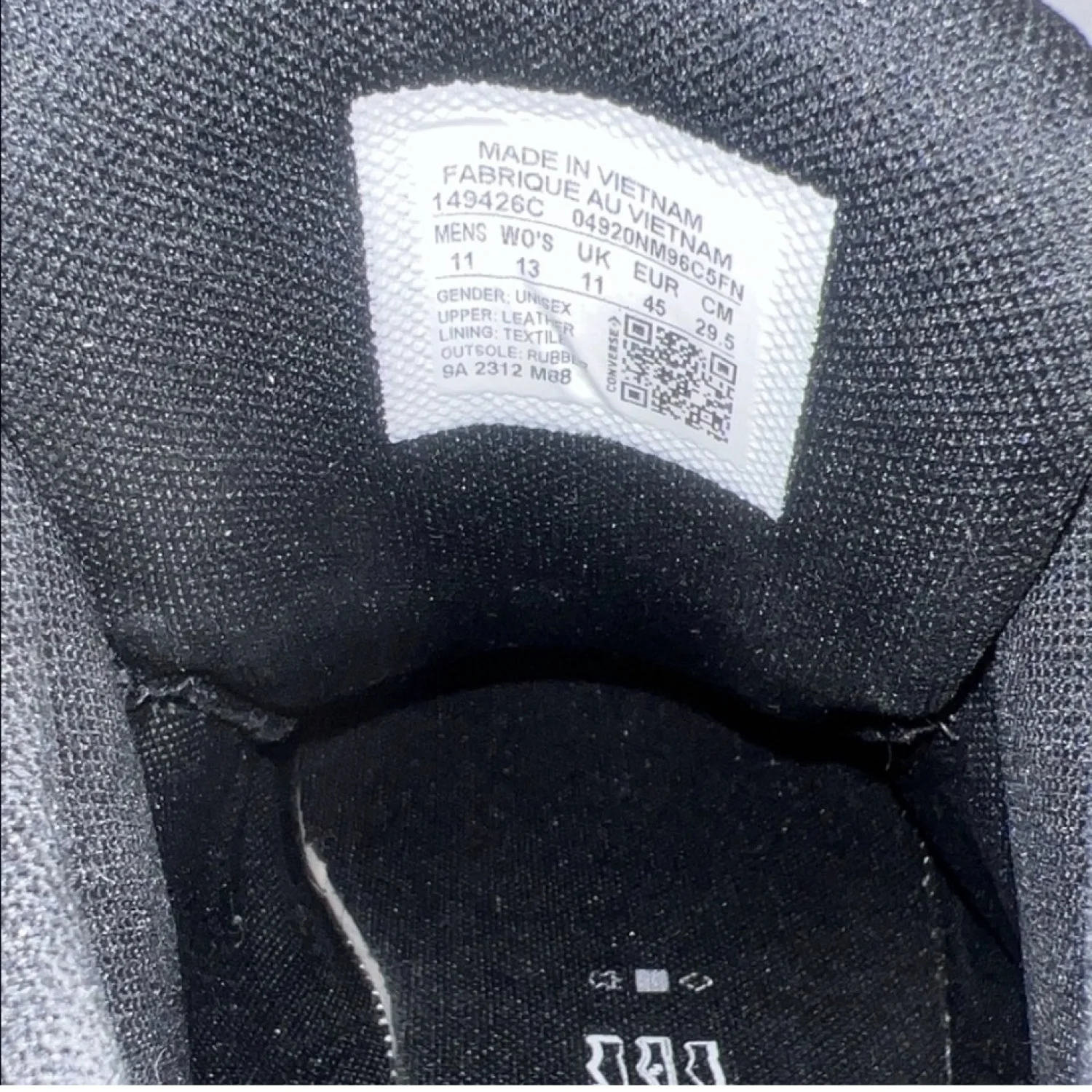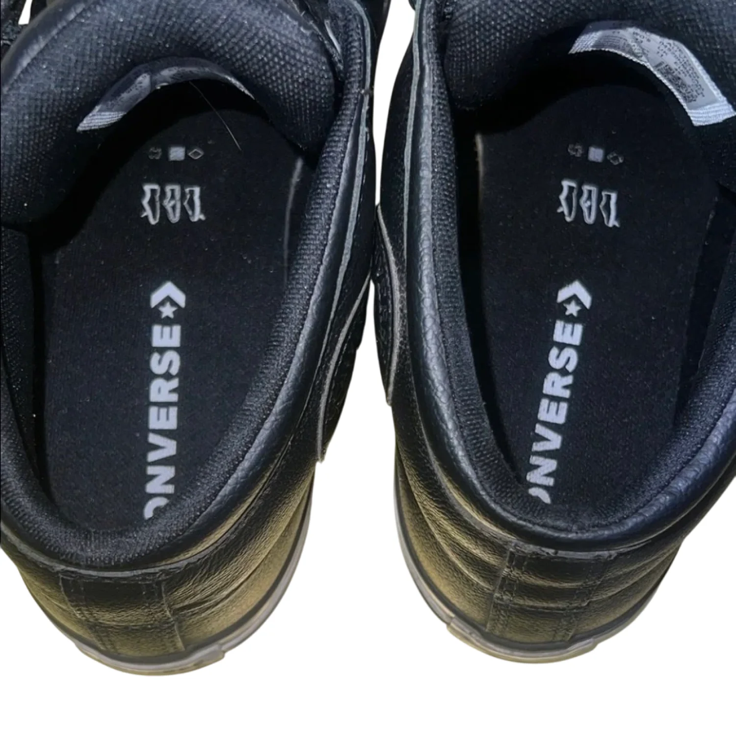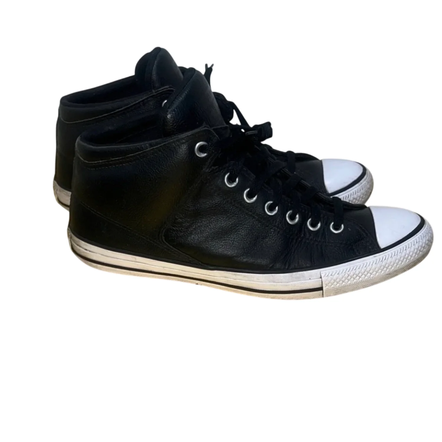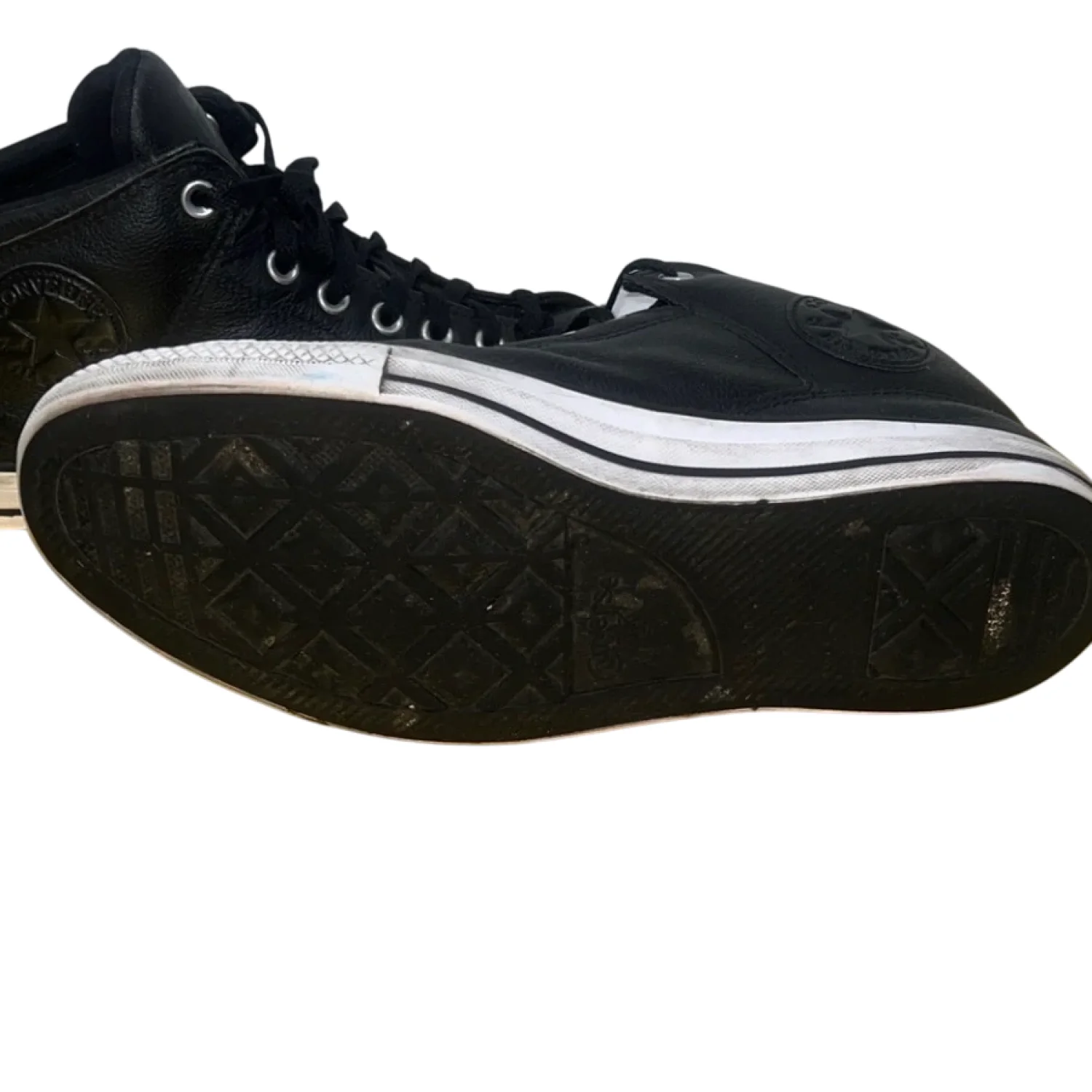 Converse All Star black leather high top sneakers featuring a classic design. Made with leather uppers and textile lining, perfect for casual wear. Size US 11 for men or US 13 for women. Includes iconic Converse branding on the sides and soles. Condition is good with some wear on the soles. Ideal for adding a touch of classic style to any outfit. #Converse #Sneakers #HighTops