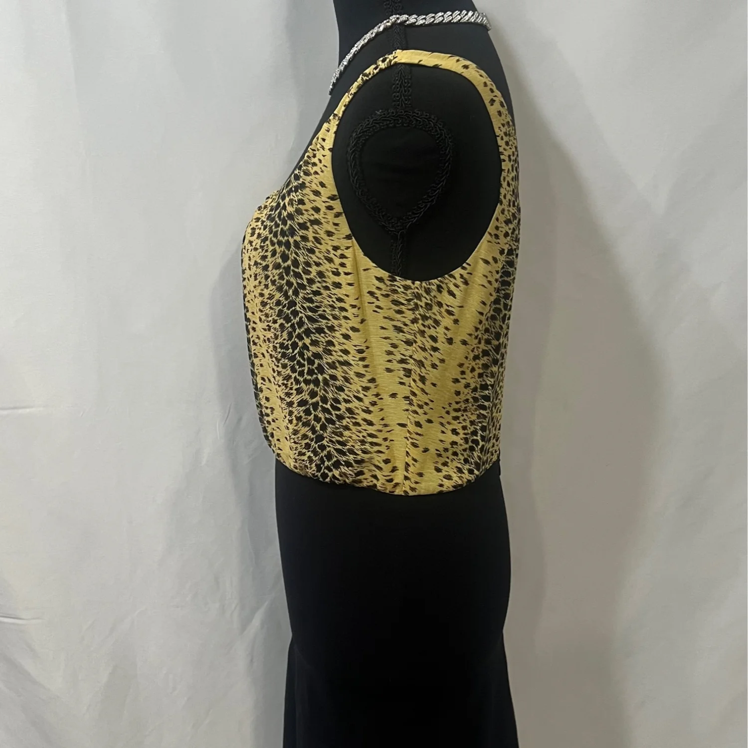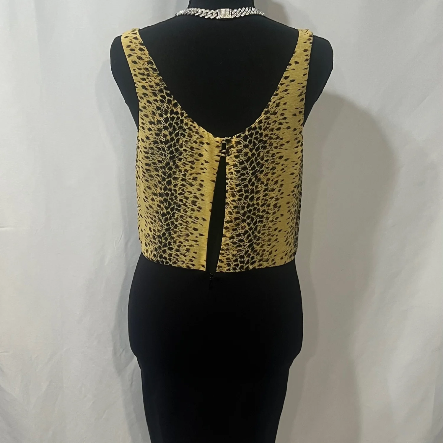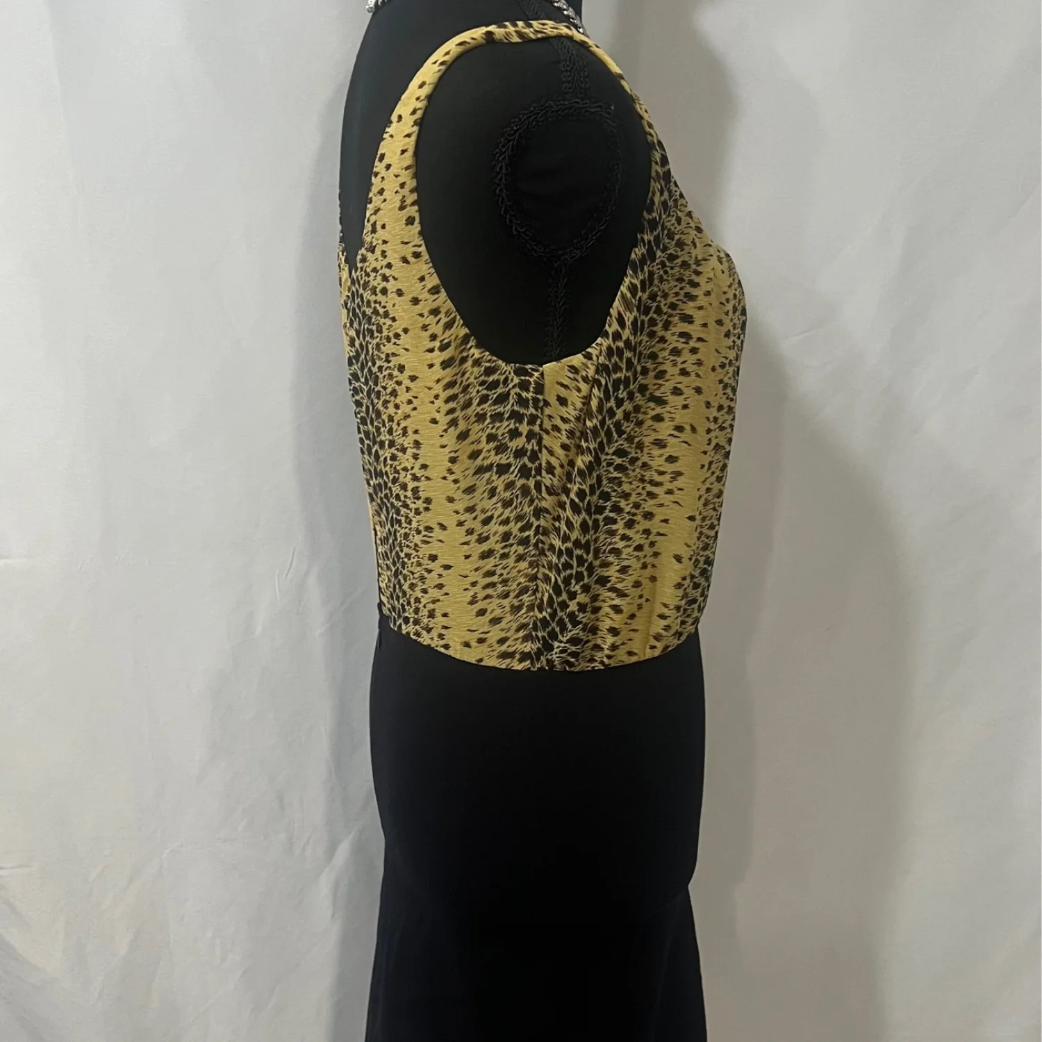This Guess dress features a stylish leopard print upper contrasted with a sleek black skirt. The dress is sleeveless and perfect for a night out or a stylish day event. Made of comfortable fabric, it ensures both style and comfort. Tags: #Guess #LeopardPrint #SleevelessDress #BlackAndGold #Fashion