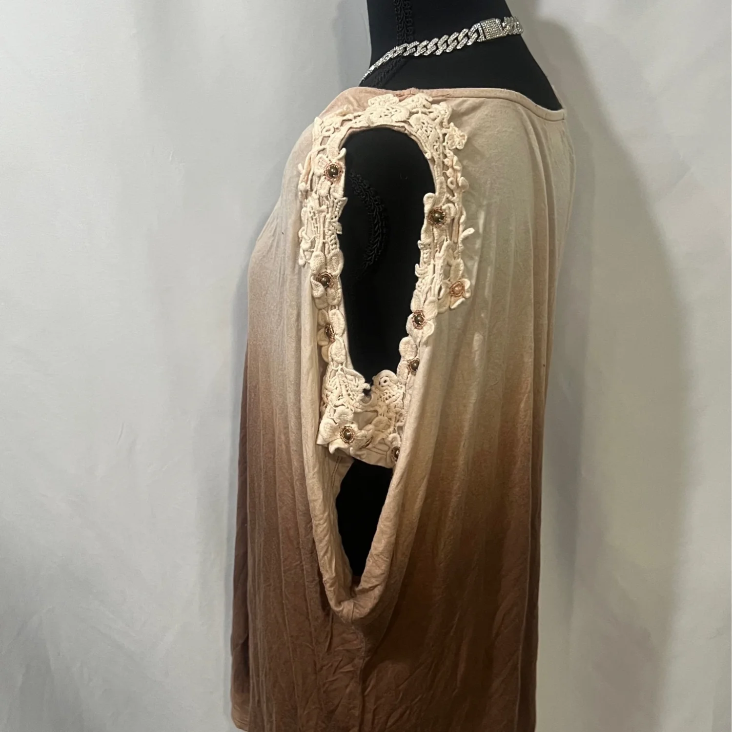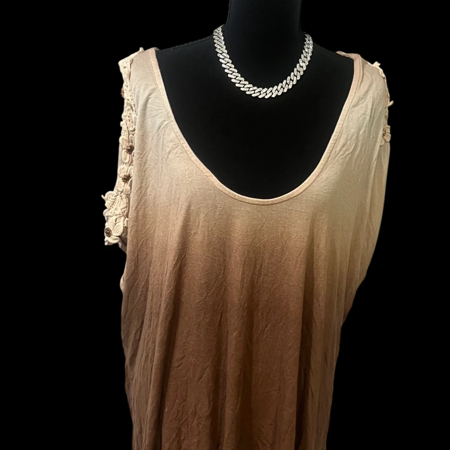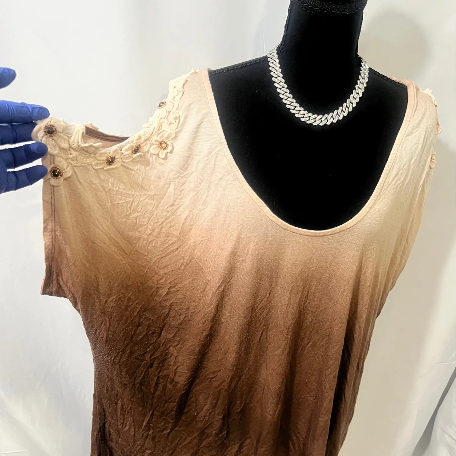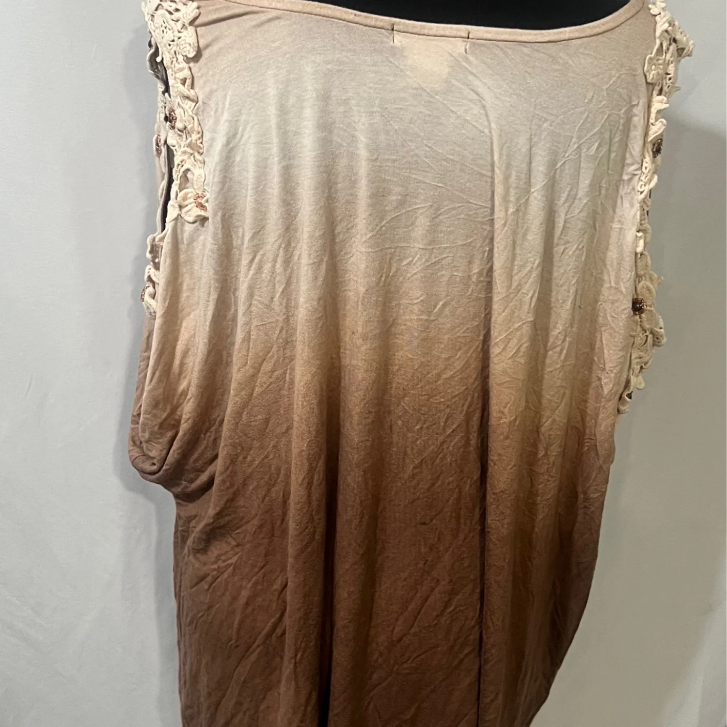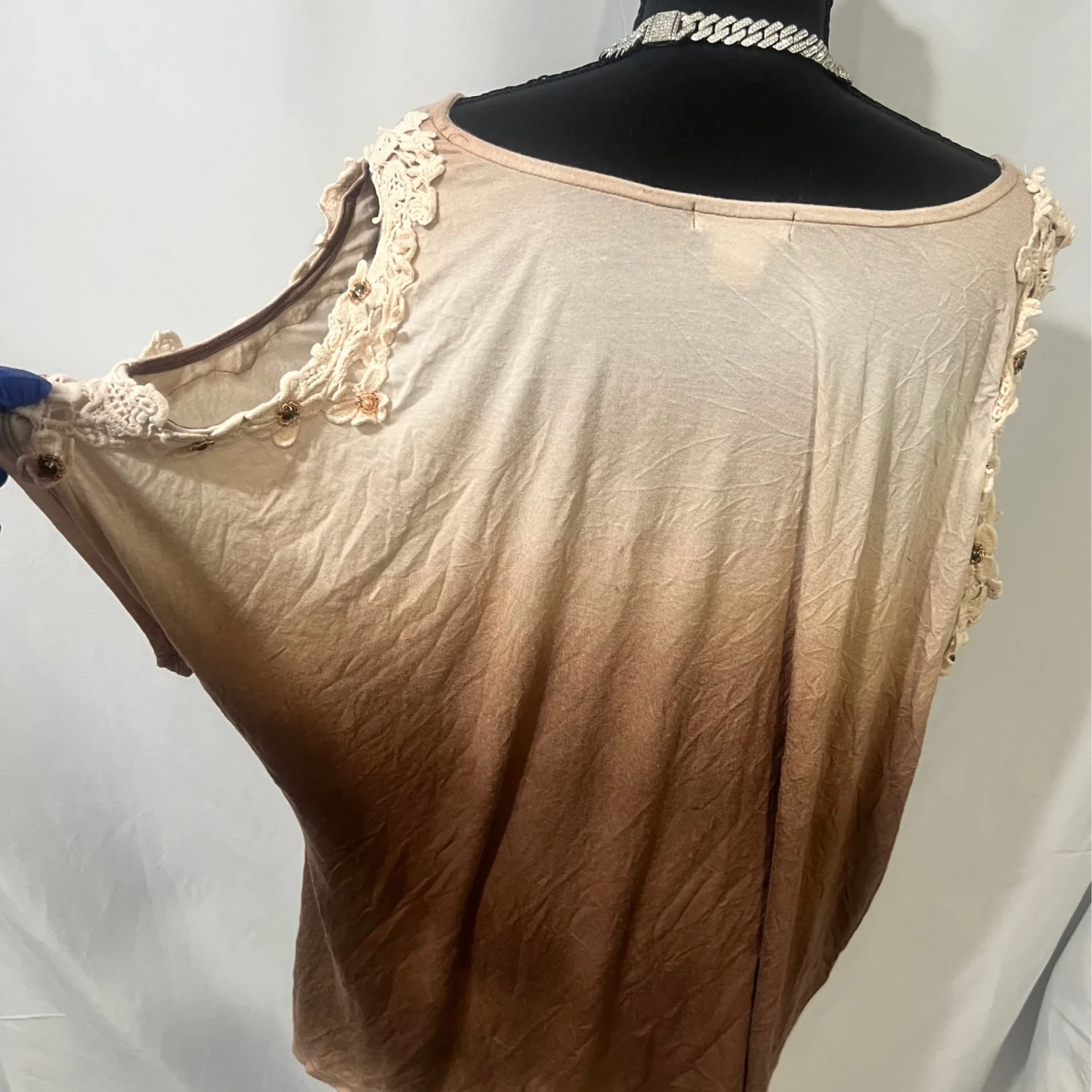 This is a Venus brand ombre sleeveless top, featuring a gradient from beige to brown. The shoulders are accented with lace details. Made of lightweight fabric, this top is perfect for a casual look. The size is 3X, and it is in good condition with minor signs of wear. Ideal for adding a touch of elegance with a relaxed fit. #Ombre #Lace #CasualTop
