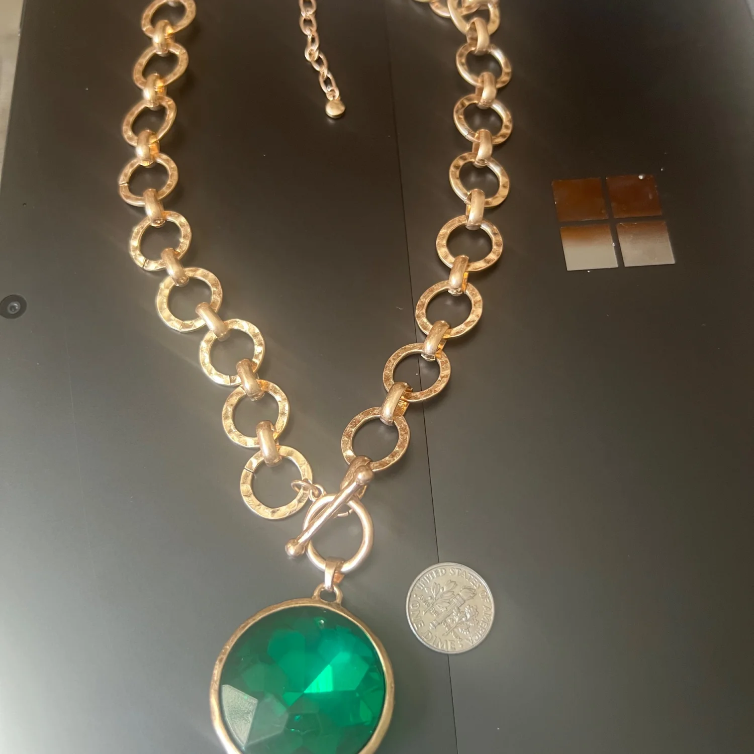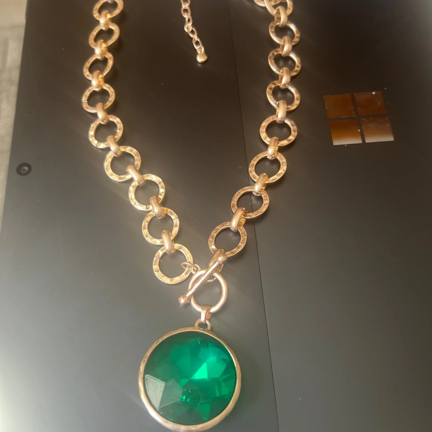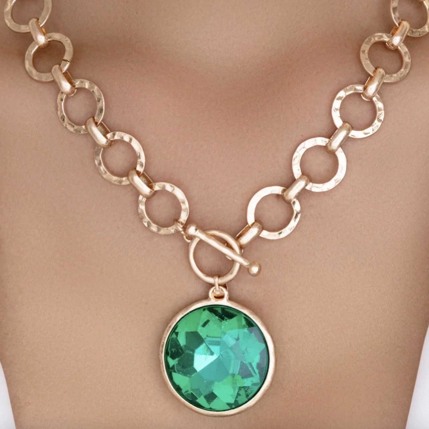 This beautiful necklace is a hammered matte gold plated with a toggle front detail. The chain adjusts 18-21 inches. The center is a bright faceted emerald crystal. This has a very vintage look and feel but is actually new in box. Retail $79