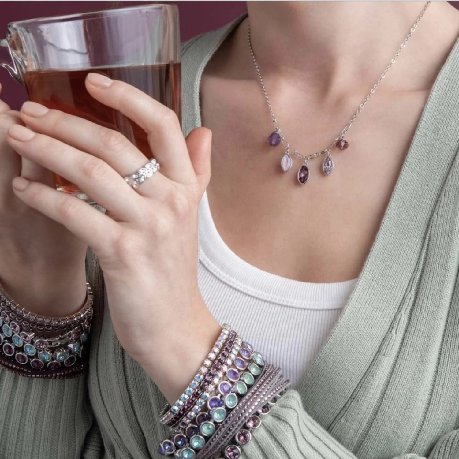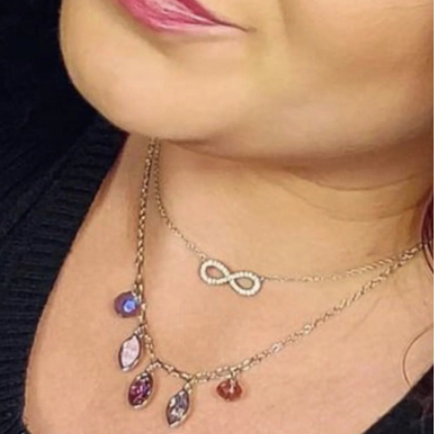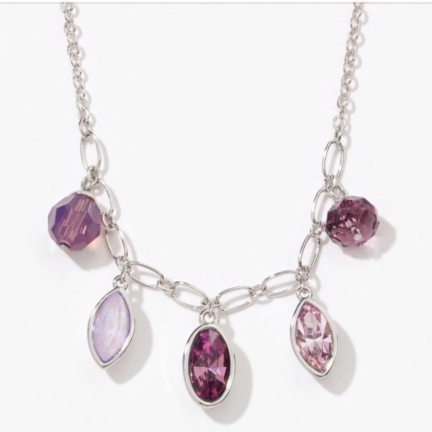 This gorgeous necklace is made of rhodium plated silver with an adjustable chain 15-18 inches. It has beautiful Swarovski dangling crystals in Iris, Lavender Delite and Pink. This is brand new in the box with care instructions. Retail $79.00