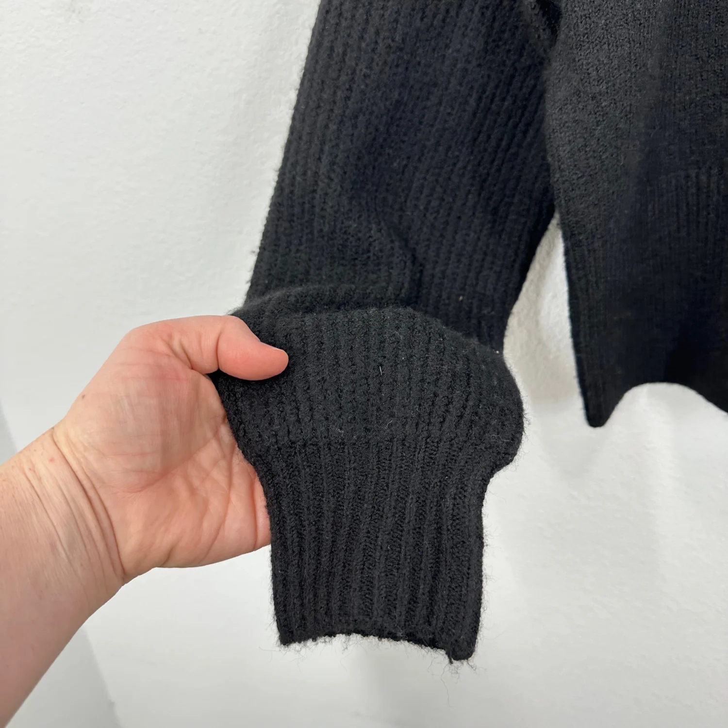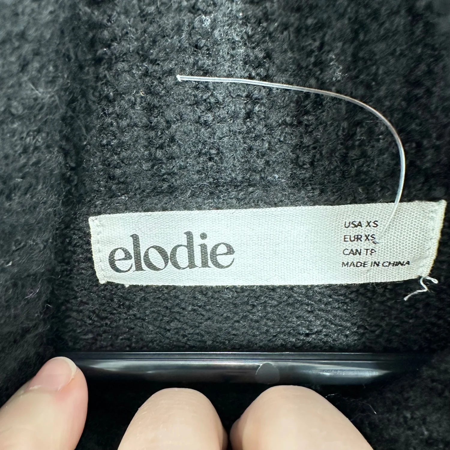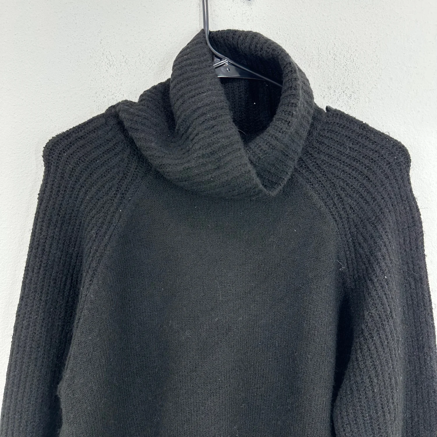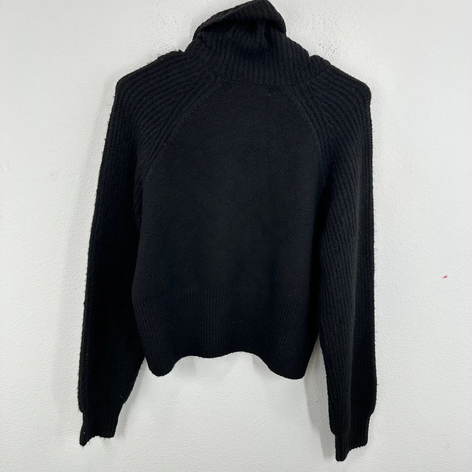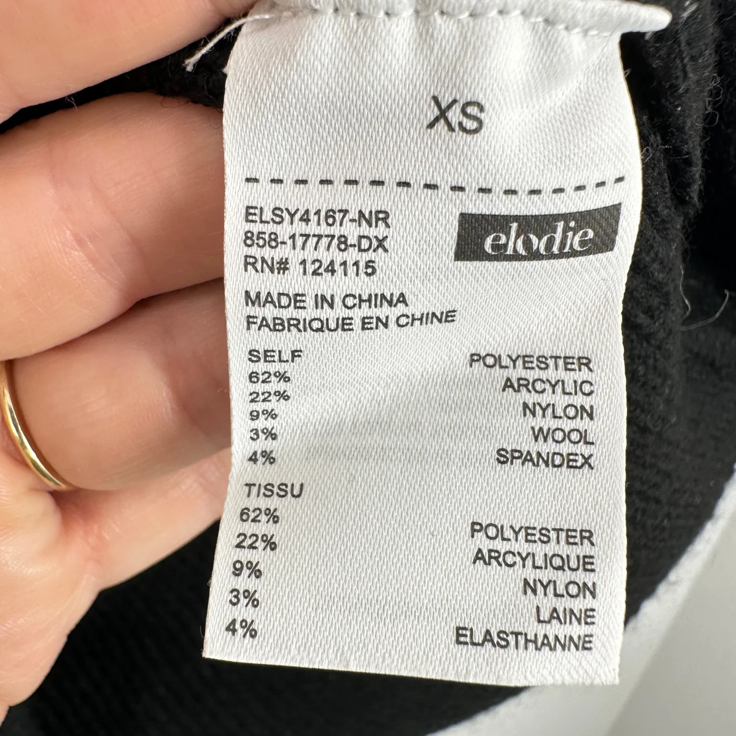 This Elodie black cowl neck sweater is crafted from a blend of polyester, acrylic, nylon, wool, and spandex, offering a comfortable and slightly stretchy fit. Featuring ribbed sleeves and a cozy cowl neckline, this sweater is perfect for layering during cooler months. Size XS. Materials: 62% polyester, 29% acrylic, 4% nylon, 3% wool, 2% spandex. Ideal for a minimalist or winter wardrobe. #black #cowlneck #sweater