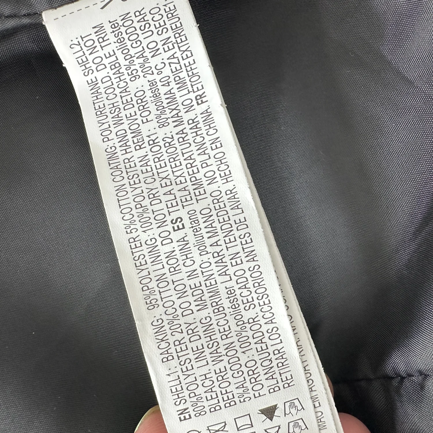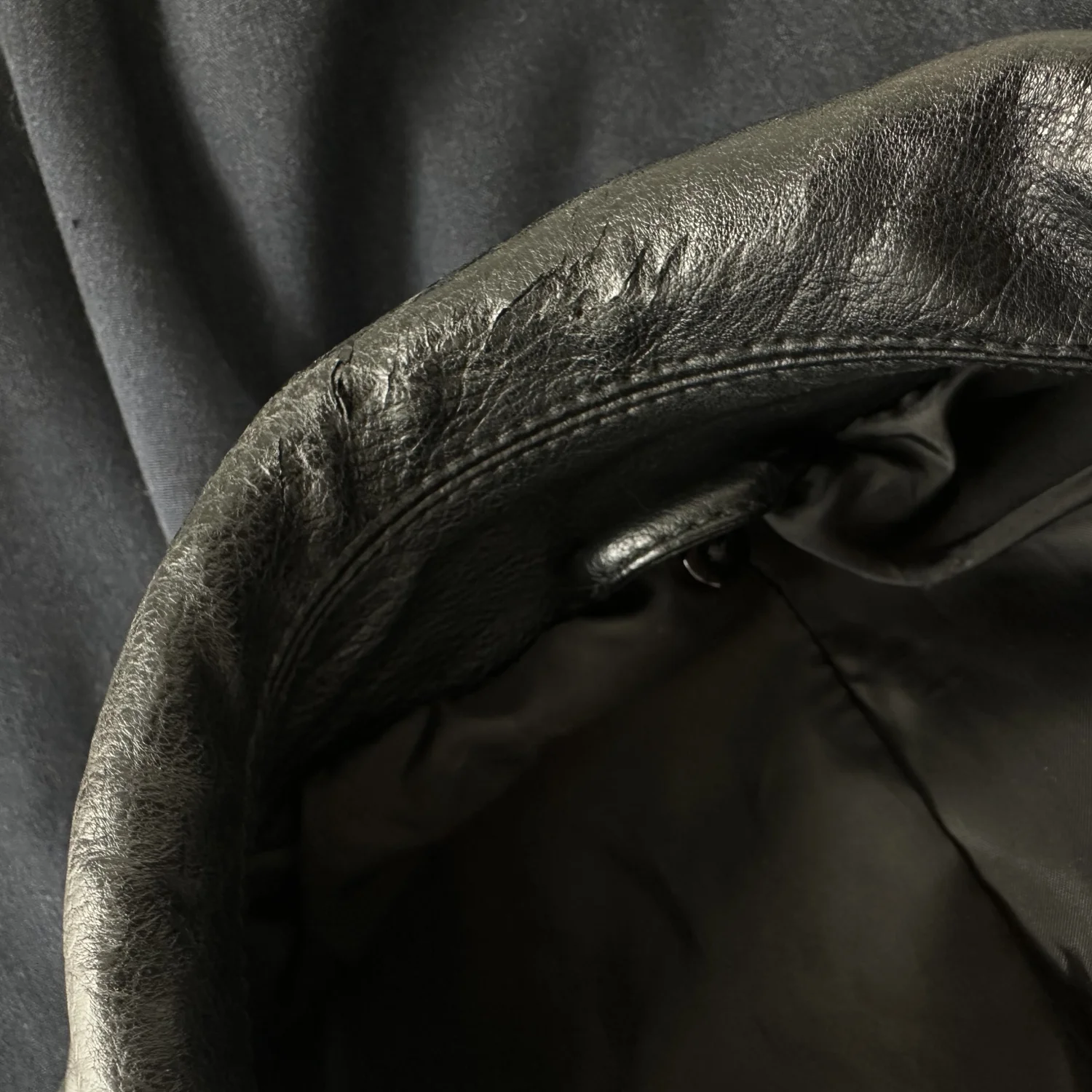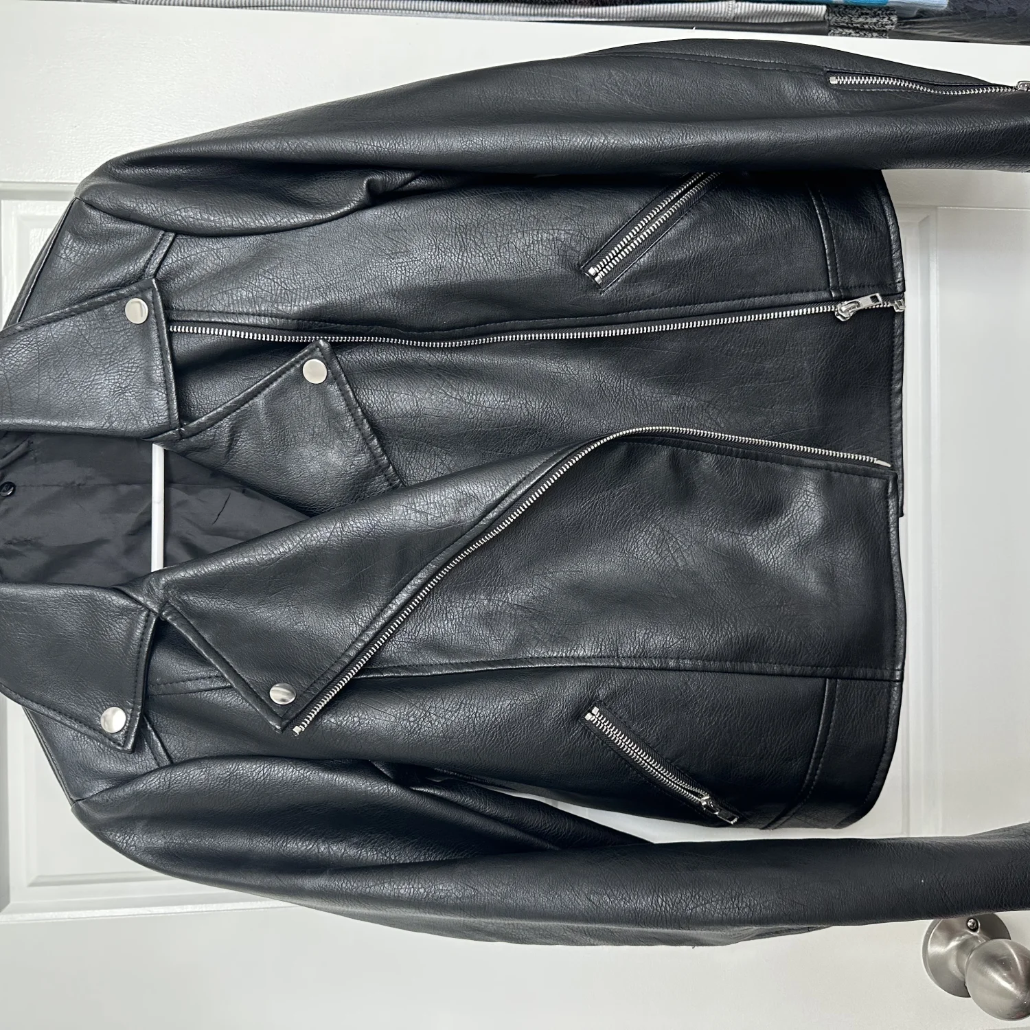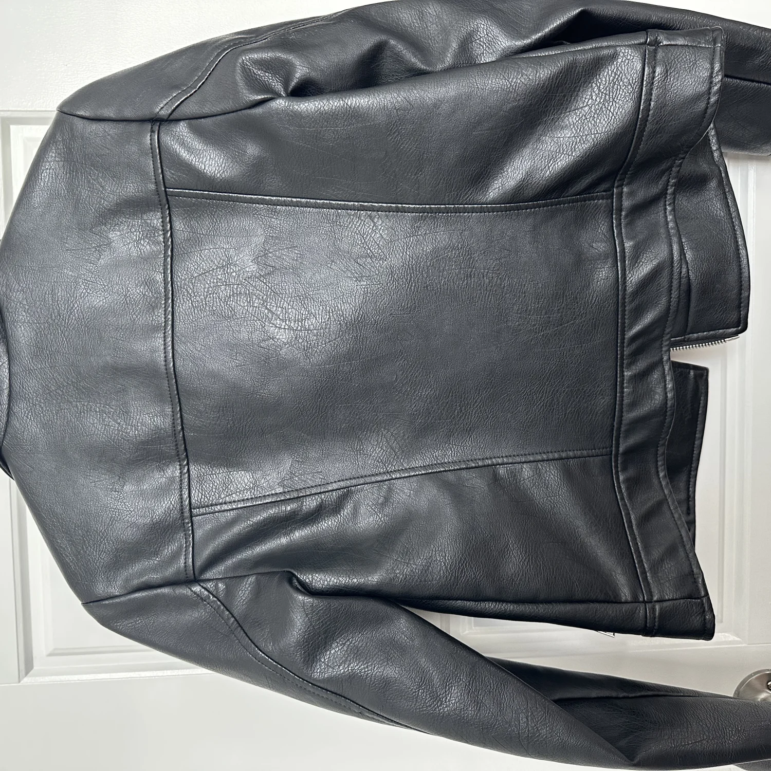 A black faux leather biker jacket with a shiny finish, featuring a front zipper closure, a collared neckline, and multiple pockets. The jacket has a slightly oversized fit with a cropped length. It is made of a blend of polyester and cotton lining. The jacket appears to be in excellent condition with no visible damage.