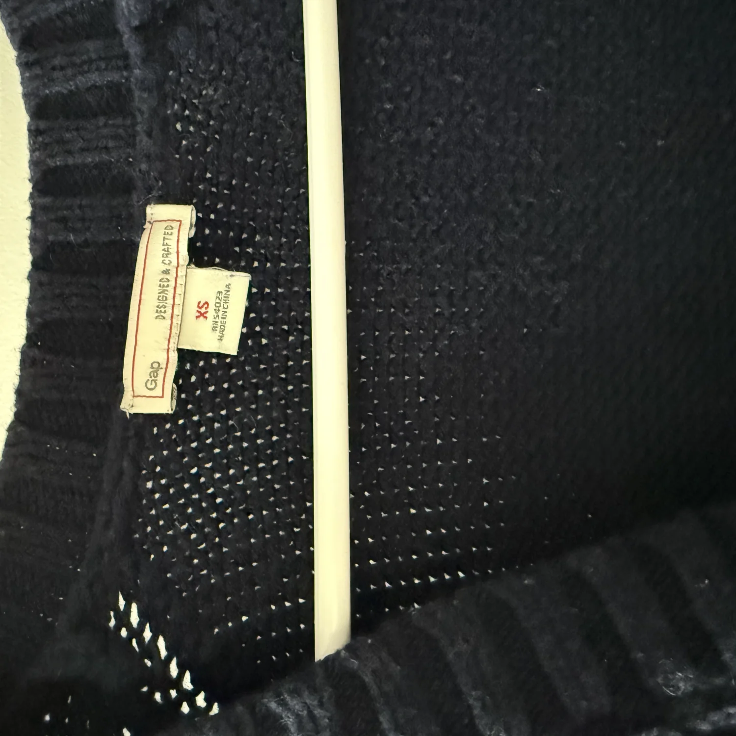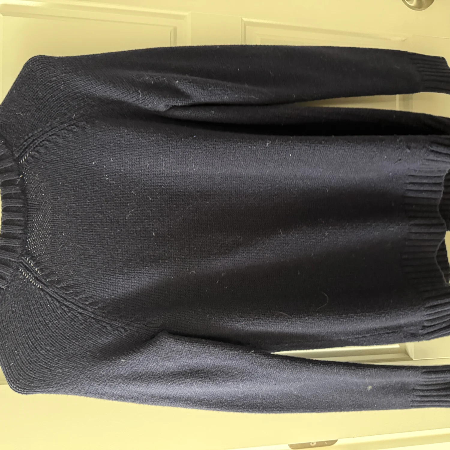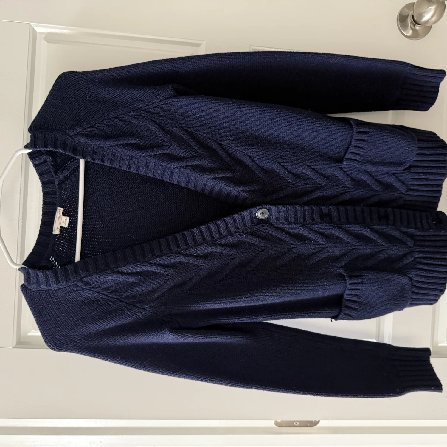 A navy blue cable knit cardigan with two pockets. The cardigan has a round neck and long sleeves. The cardigan appears to be in excellent condition.