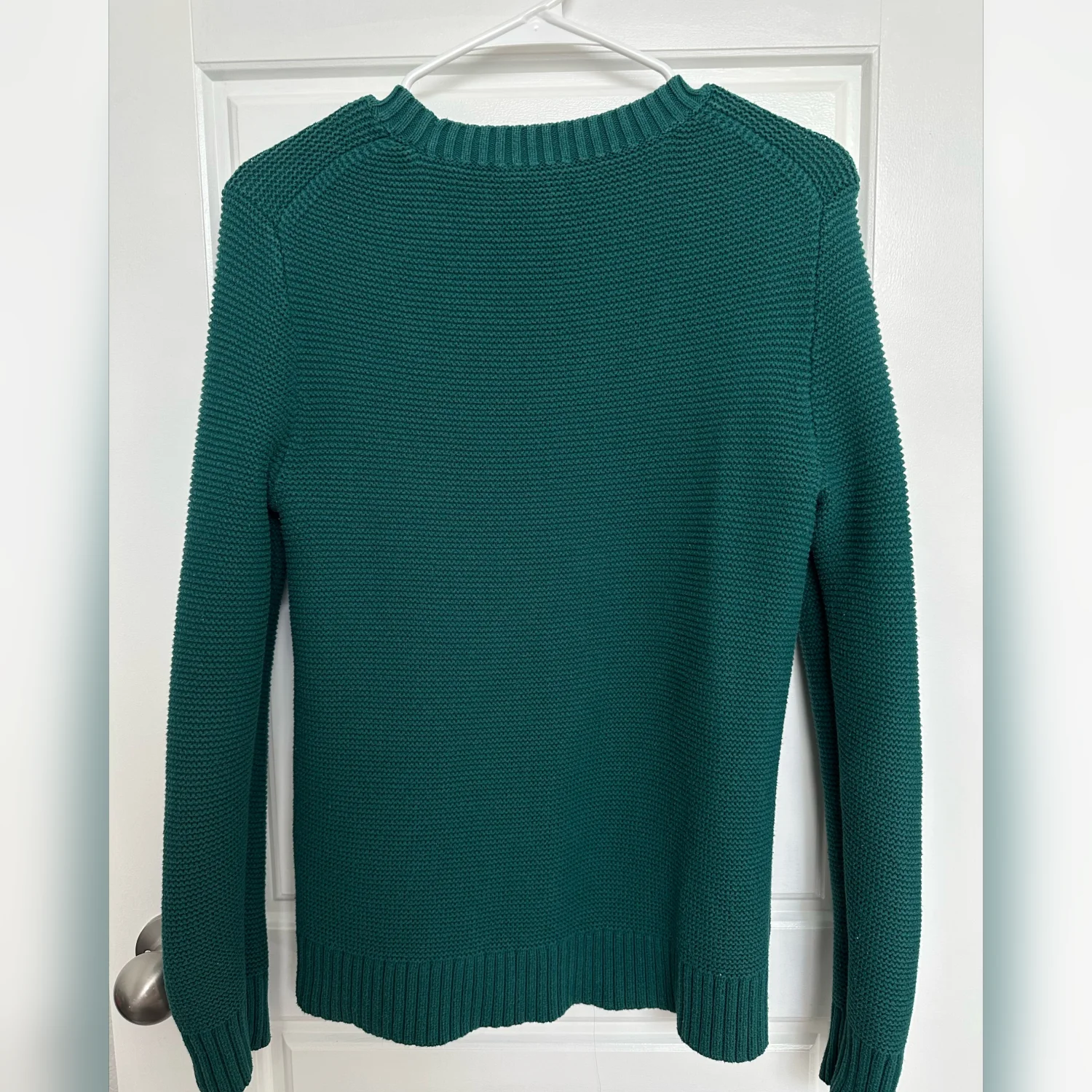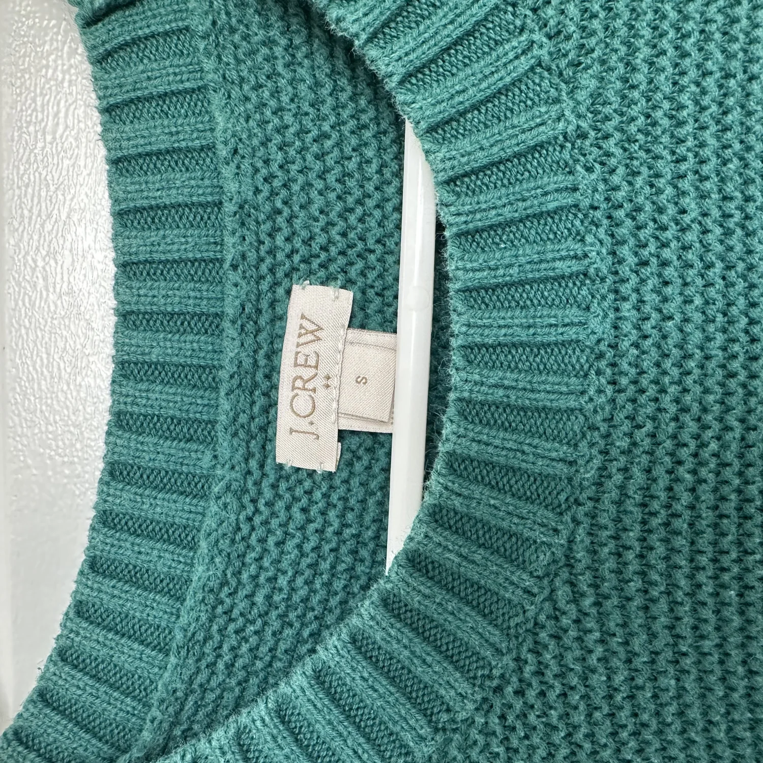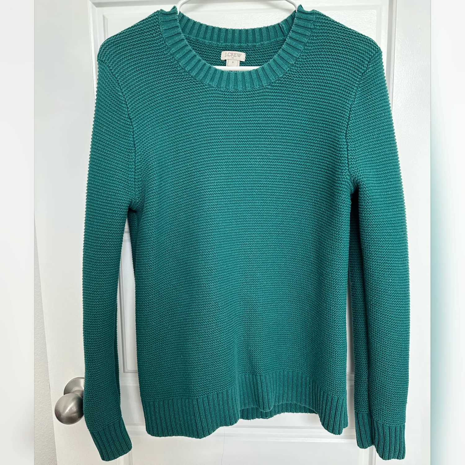 A teal-colored crewneck sweater with a round neckline and long sleeves. The sweater is made of a soft, knitted material and has a slightly textured appearance. There are no visible signs of damage or wear. J. crew - size small.