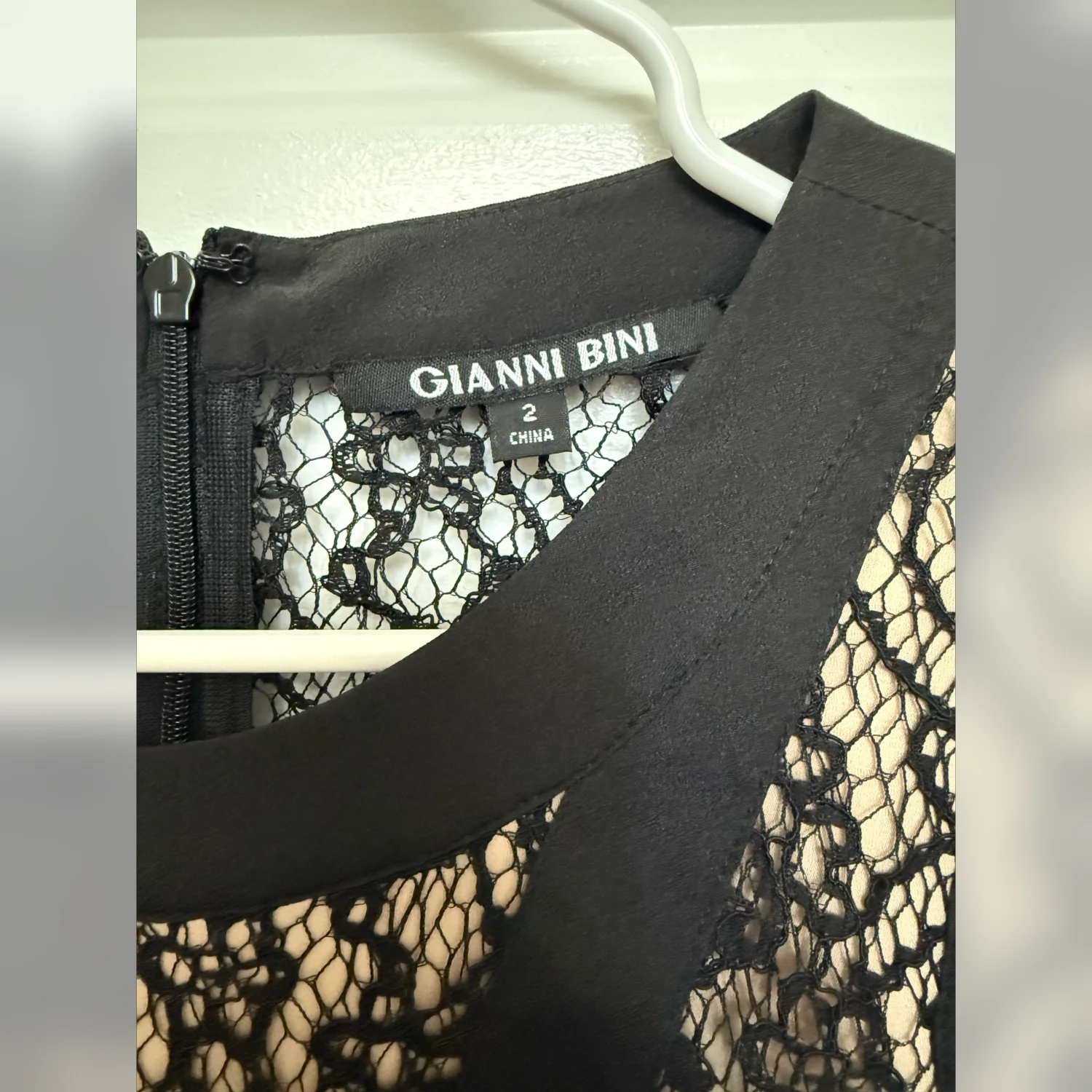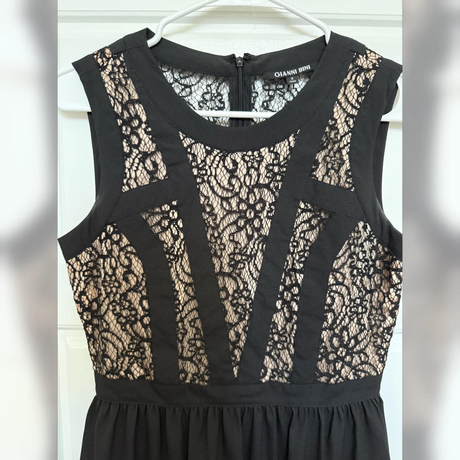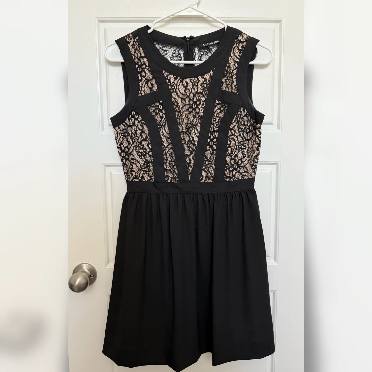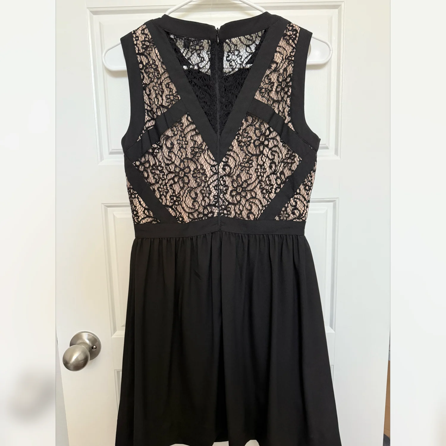 A black dress with lace detailing and a zipper closure. The dress appears to be in excellent condition with no visible damage.