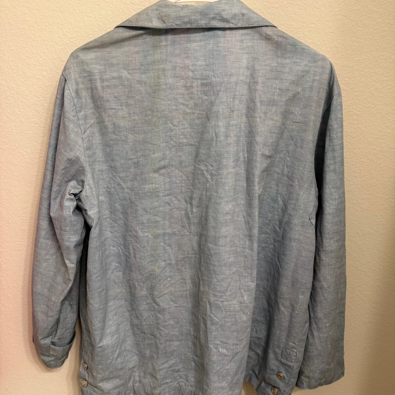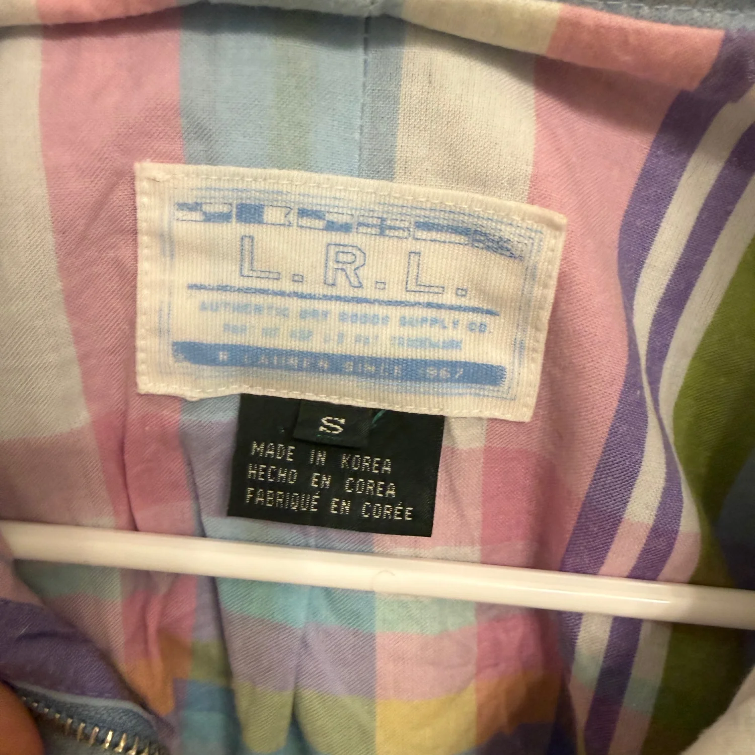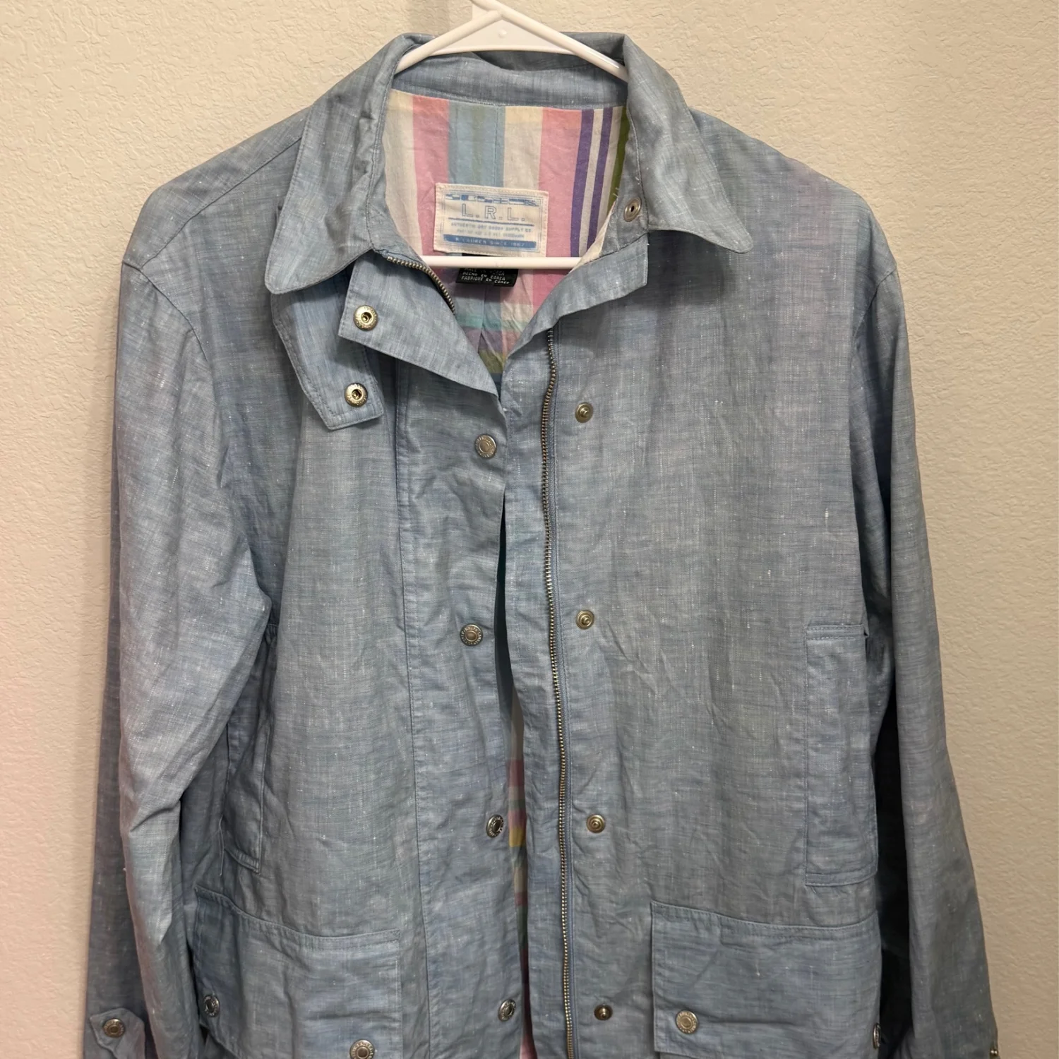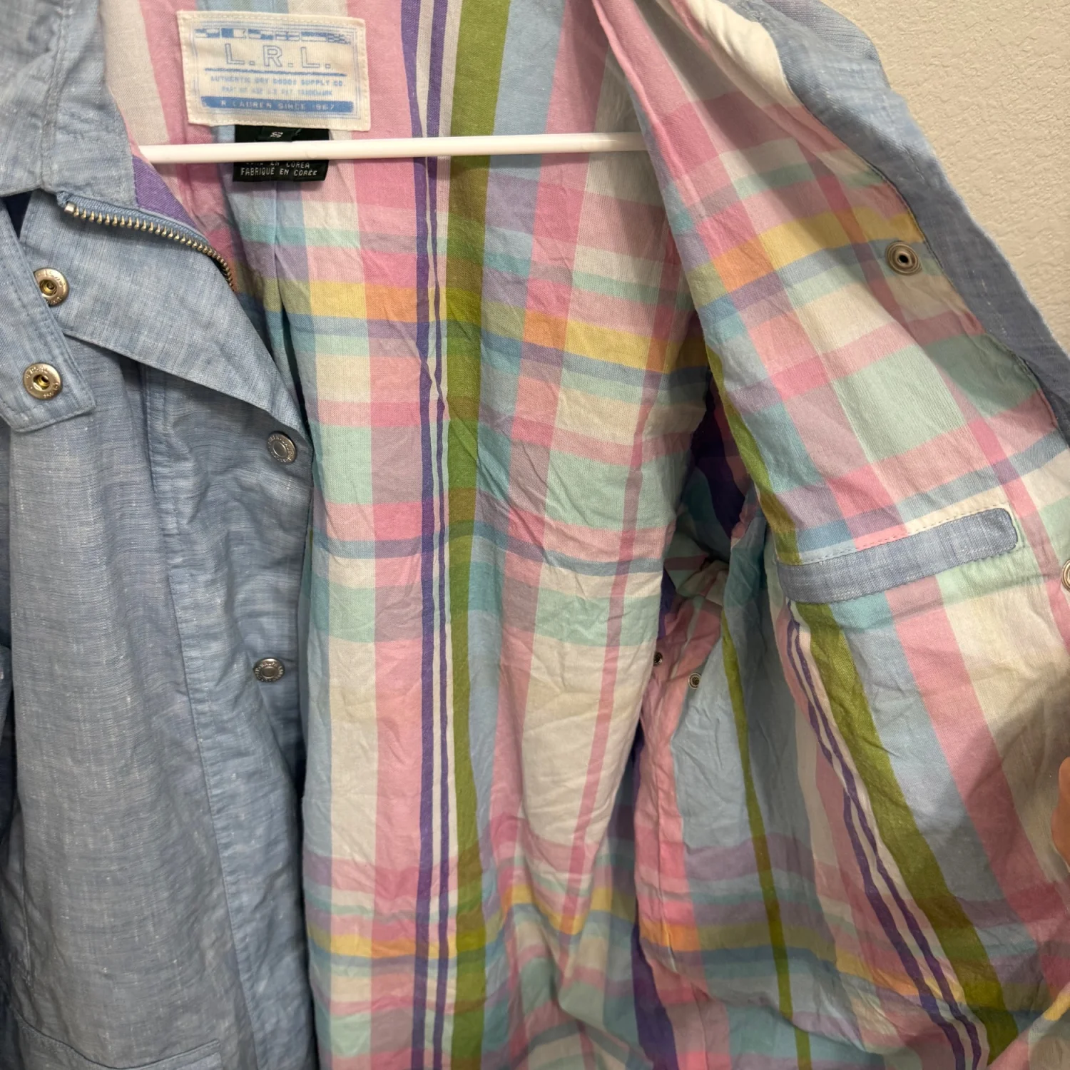 Lauren Ralph Lauren light blue jacket featuring a button-up front with snap buttons. The interior is a multicolor pastel plaid pattern, providing a stylish contrast. Made in Korea, with two front pockets for functionality. Ideal for layering in light weather. #casual #pastel #spring #outerwear