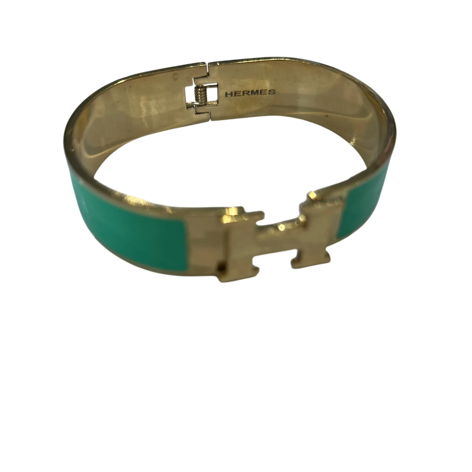 Authentic Hermès Clic H bracelet featuring a striking green enamel finish with gold-tone metal accents. This iconic piece showcases the signature 'H' closure, offering both elegance and versatility to any outfit. Perfect for daily wear or special occasions. Includes original packaging.