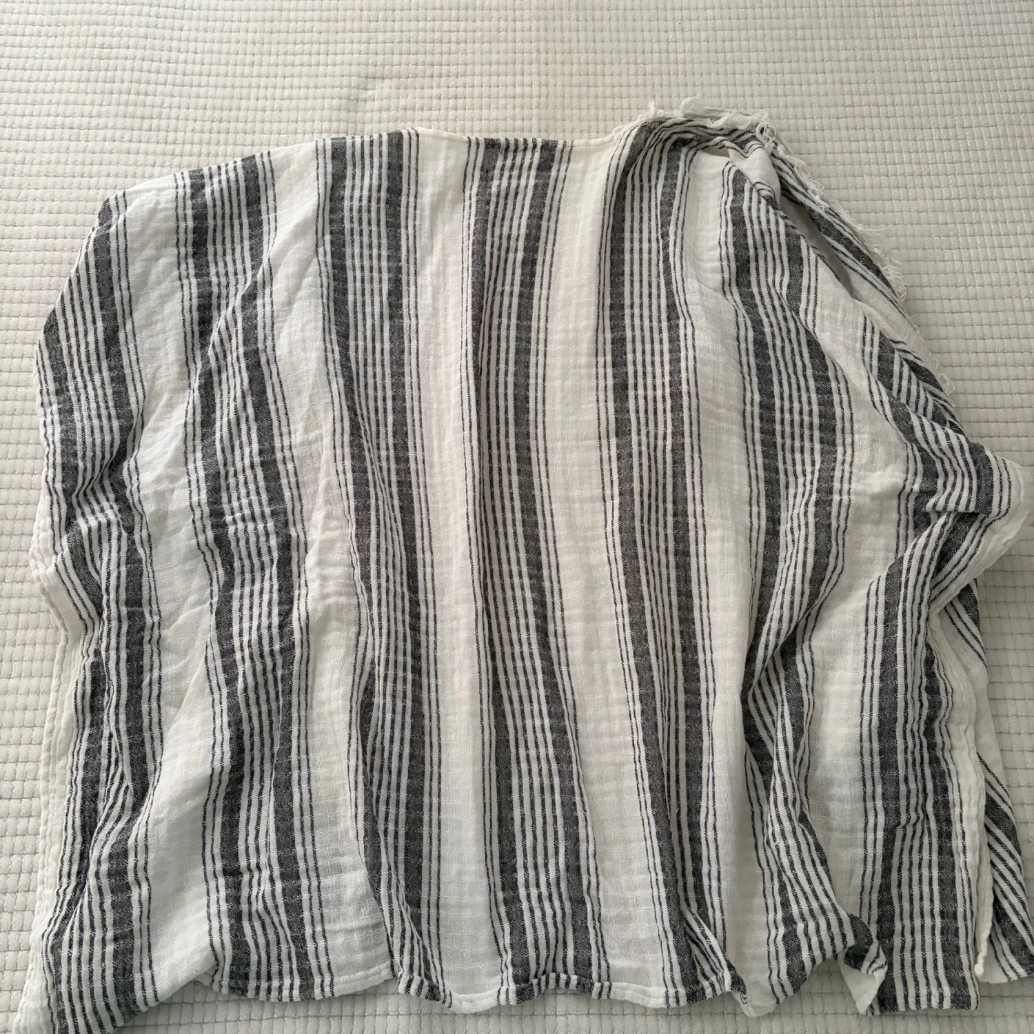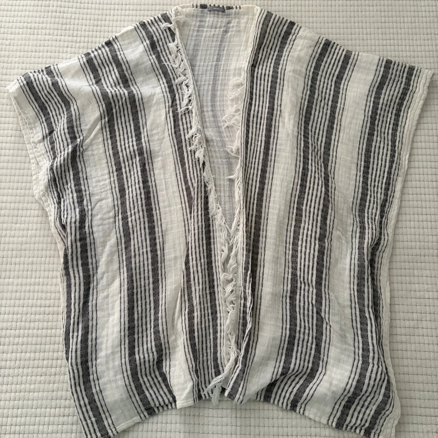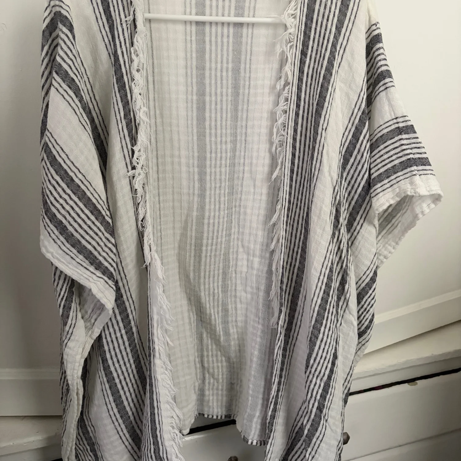 Lightweight open-weave kimono with vertical black stripes on a white base. Soft, airy fabric ideal for layering. Fringe-trim detail along the front edge. Good condition. Gently used. See photos for details and condition. All sales are final.