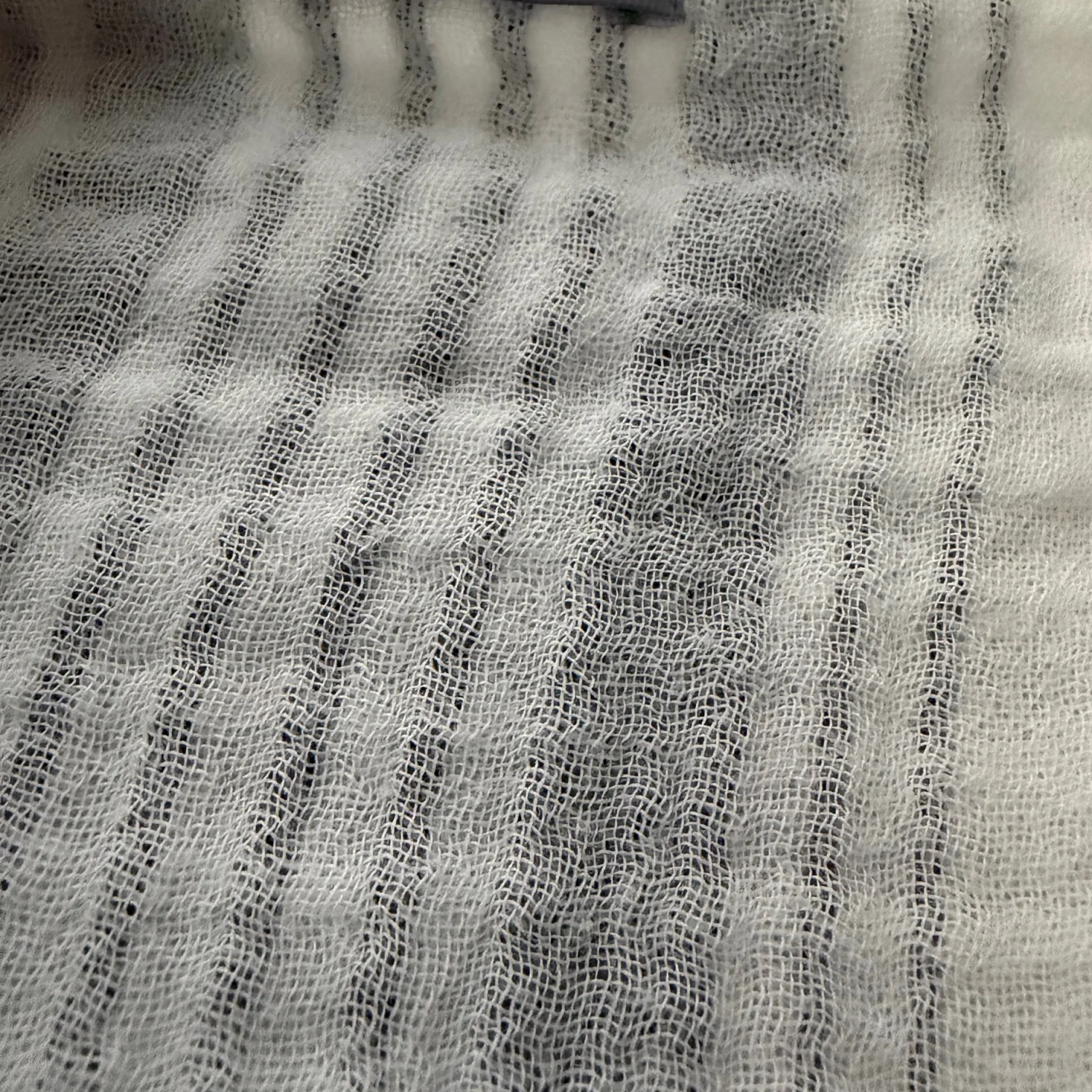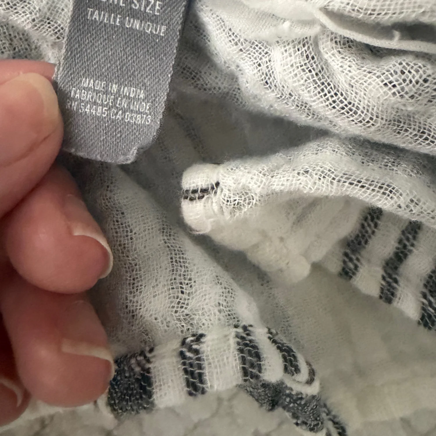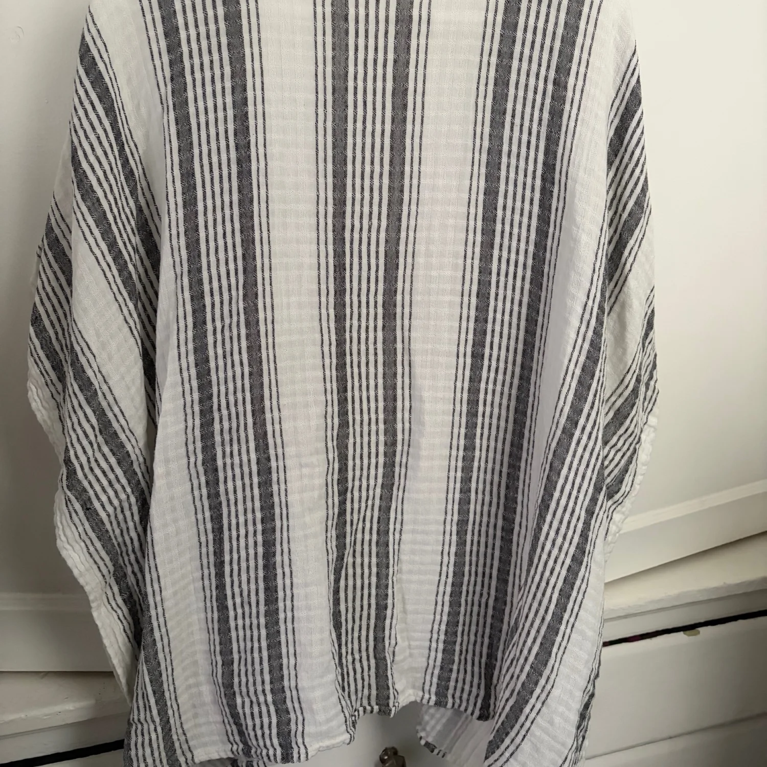 Lightweight open-weave kimono with vertical black stripes on a white base. Soft, airy fabric ideal for layering. Fringe-trim detail along the front edge. Good condition. Gently used. See photos for details and condition. All sales are final.