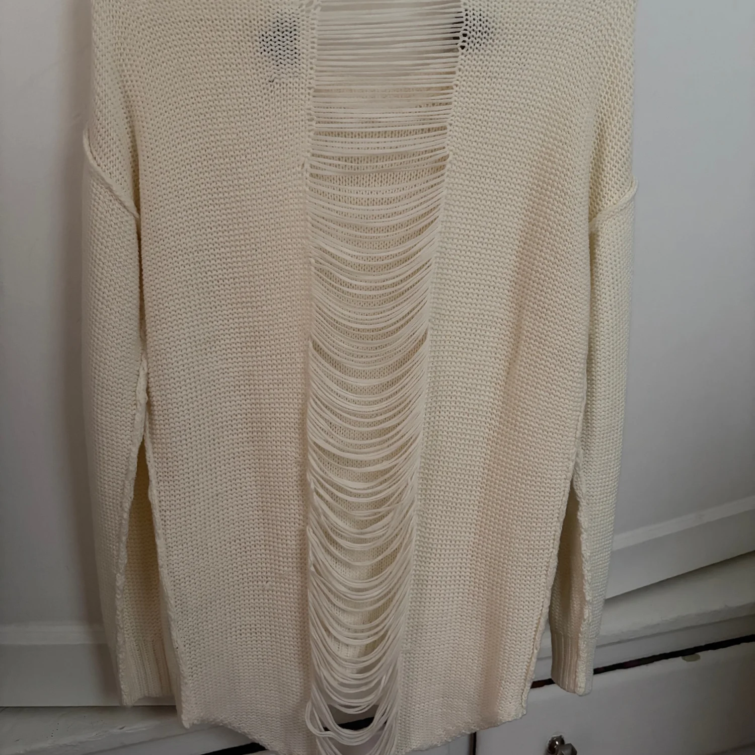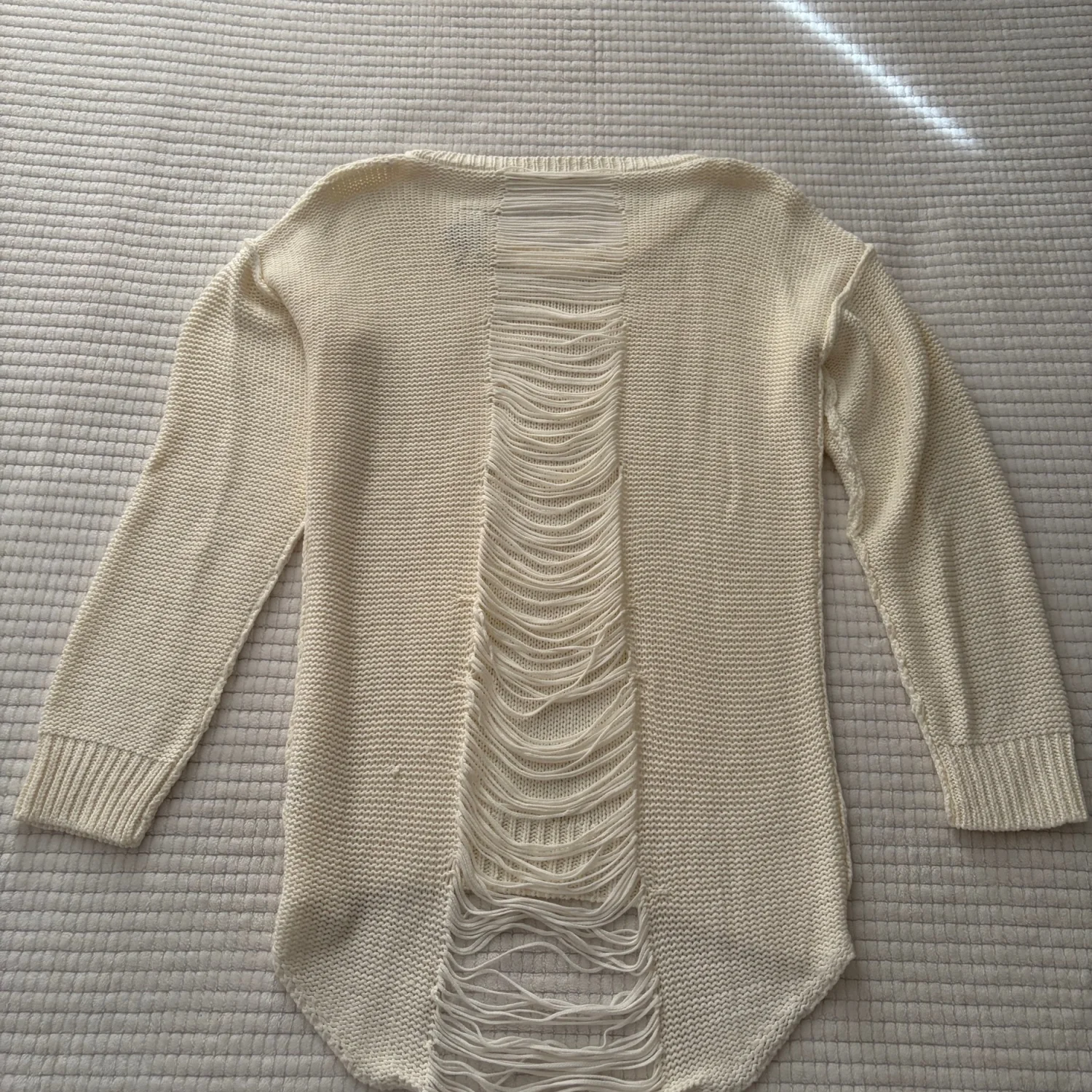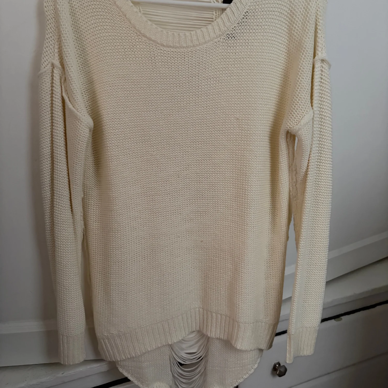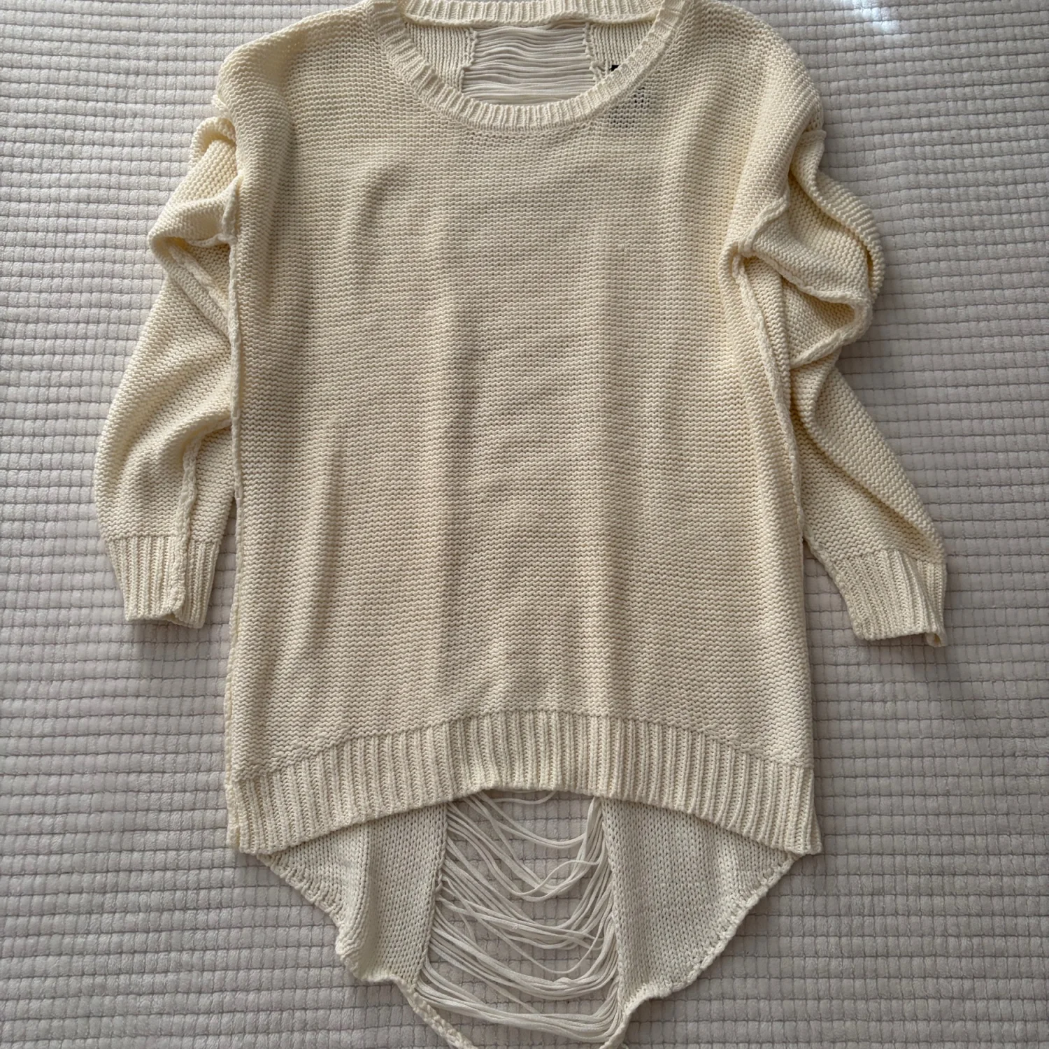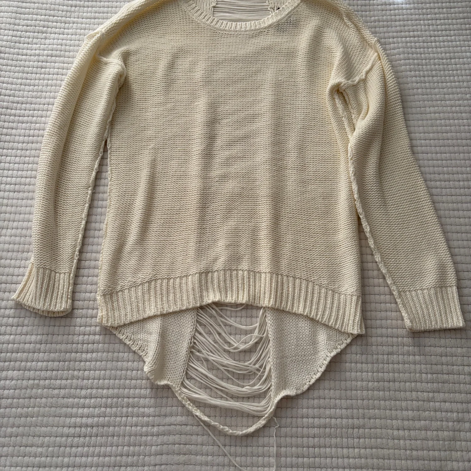 Soft cream knit sweater with a relaxed fit and intentional distressed hem detail. Lightweight and breathable for layered styling. Casual pullover ideal for everyday wear and versatile outfits. Good condition. See photos. All sales are final.
