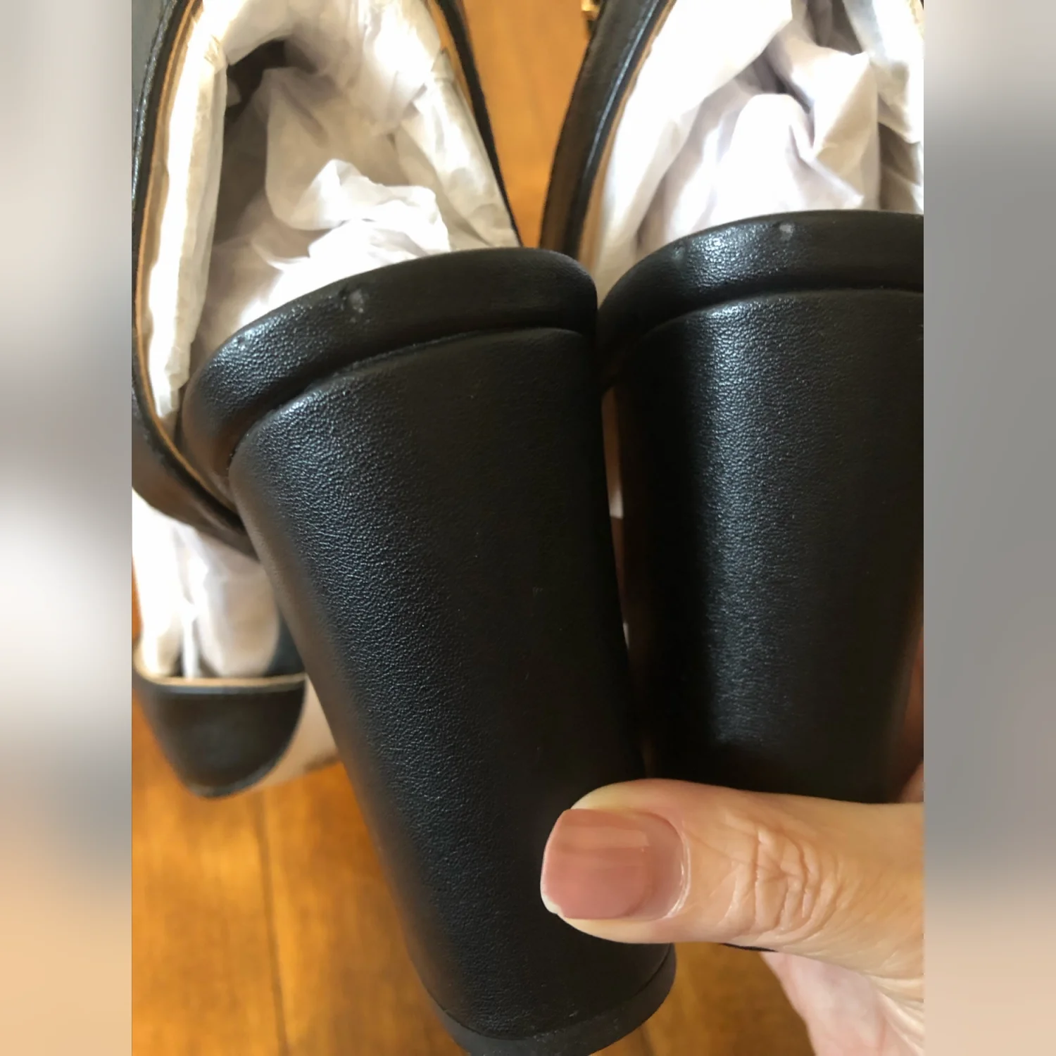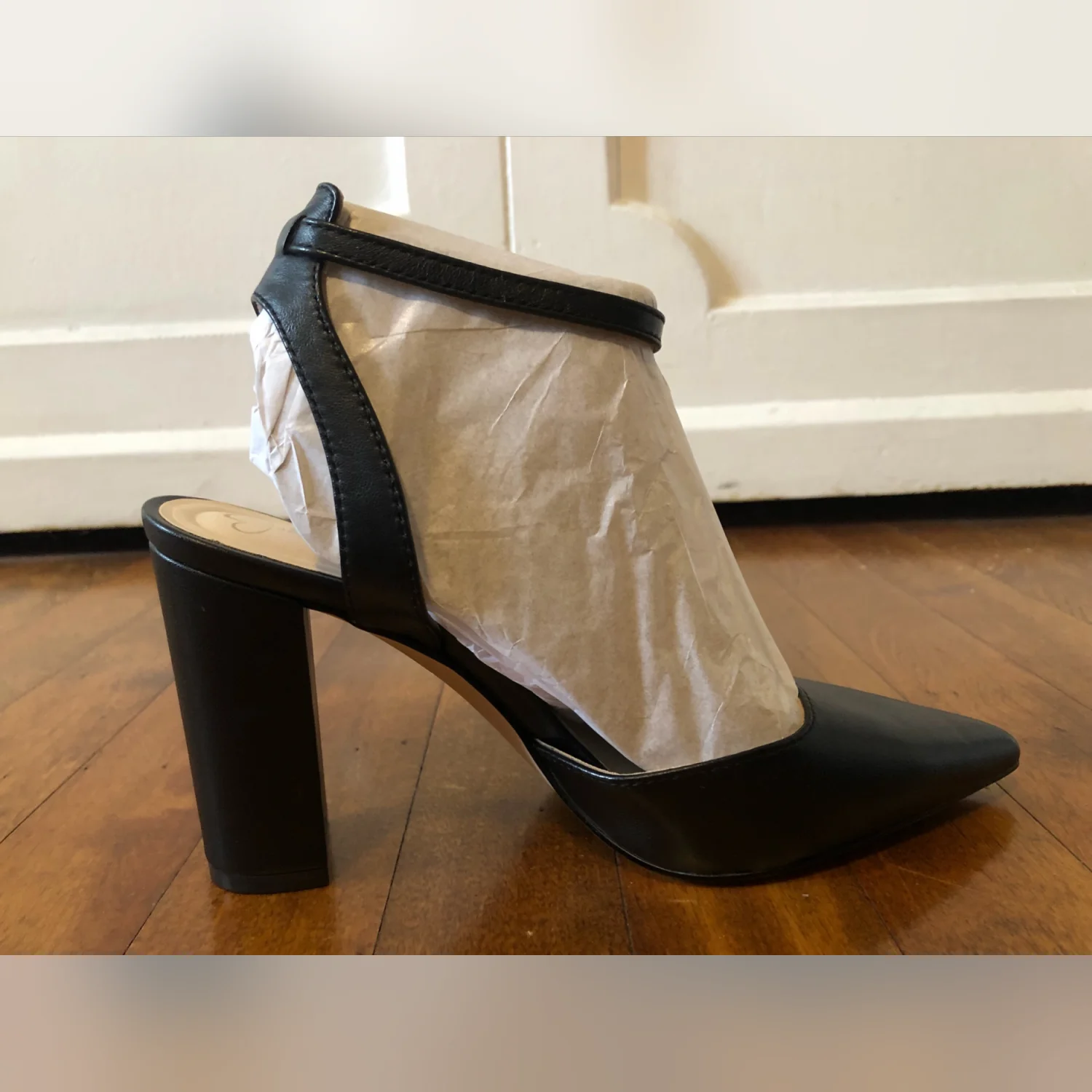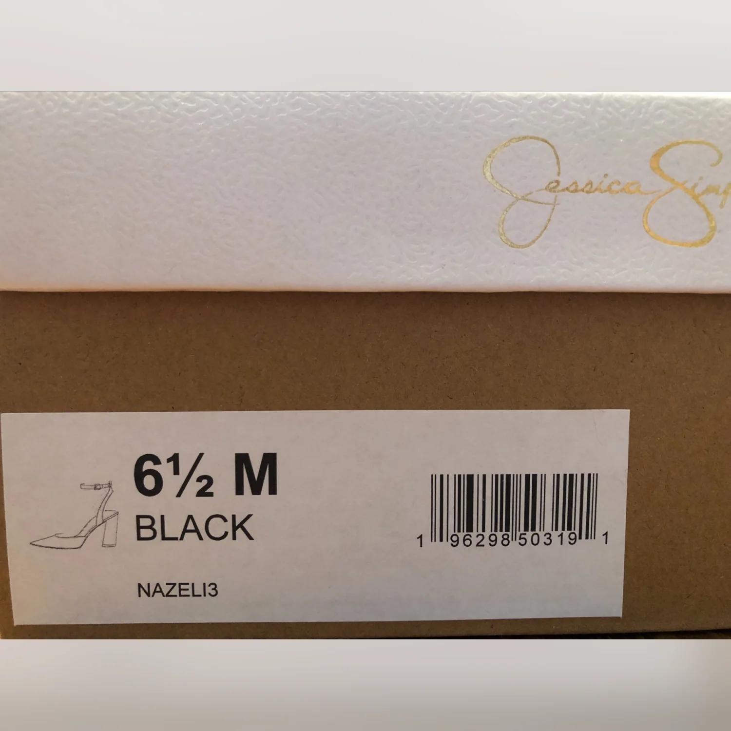 The Jessica Simpson Nazeli pump in size 6.5 features a stylish pointed toe and a tall block heel in sleek black. This ankle strap pump is made of faux leather and exudes elegance and sophistication, perfect for any occasion. The brand's reputation for quality and style is evident in this chic and fashionable shoe. Gently Used Blemish: Minor scuffs Heel Height - 3.95” See Photos For Details And Condition. All Sales Are Final