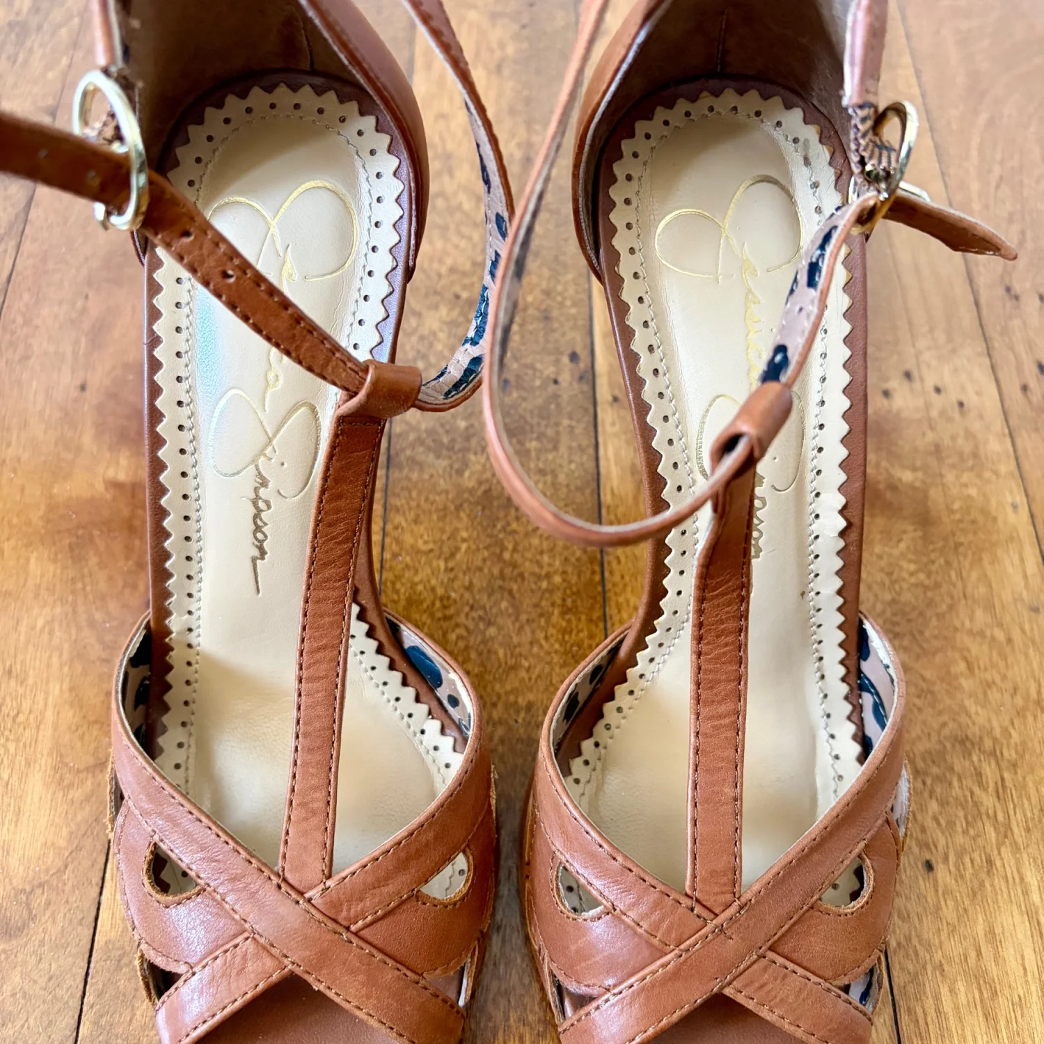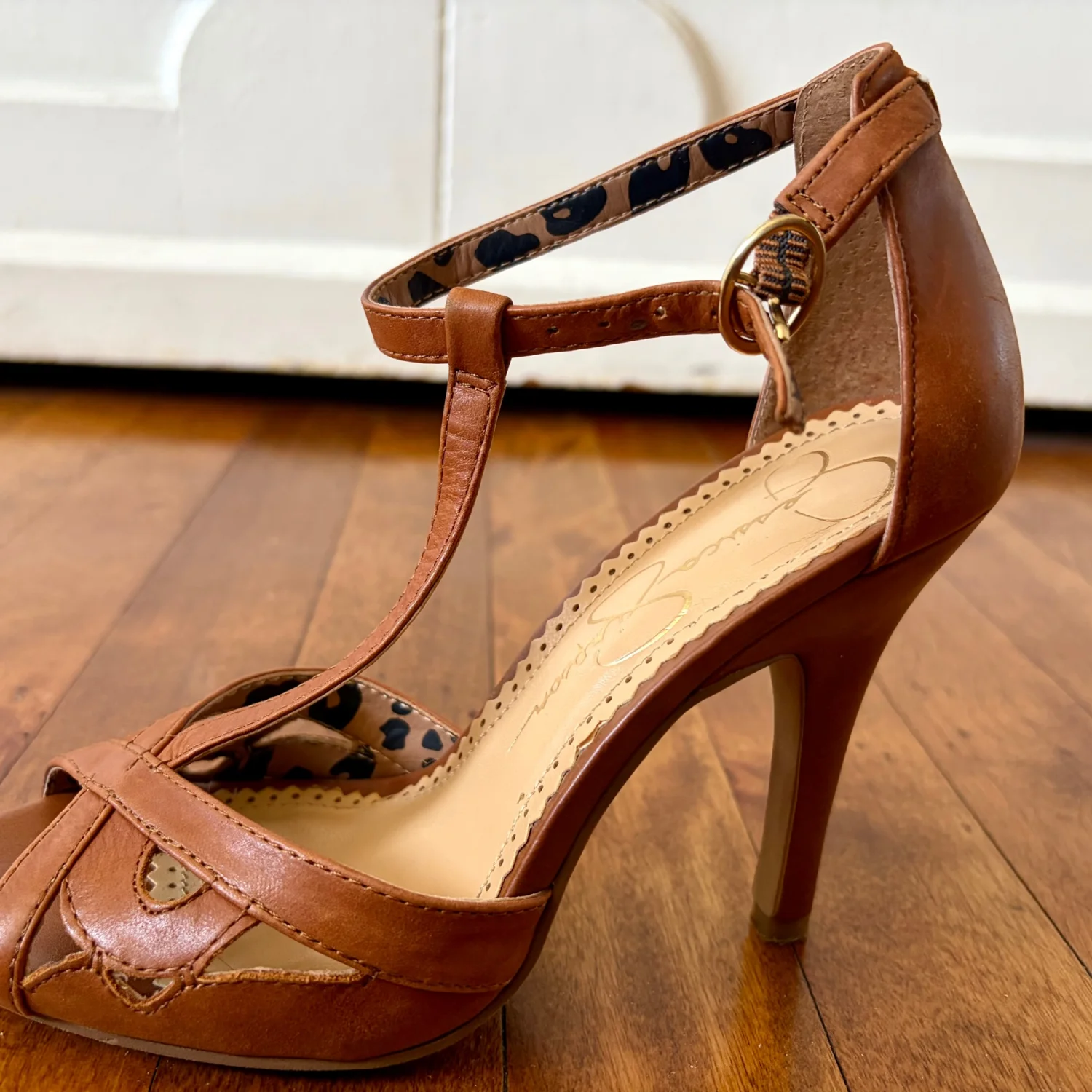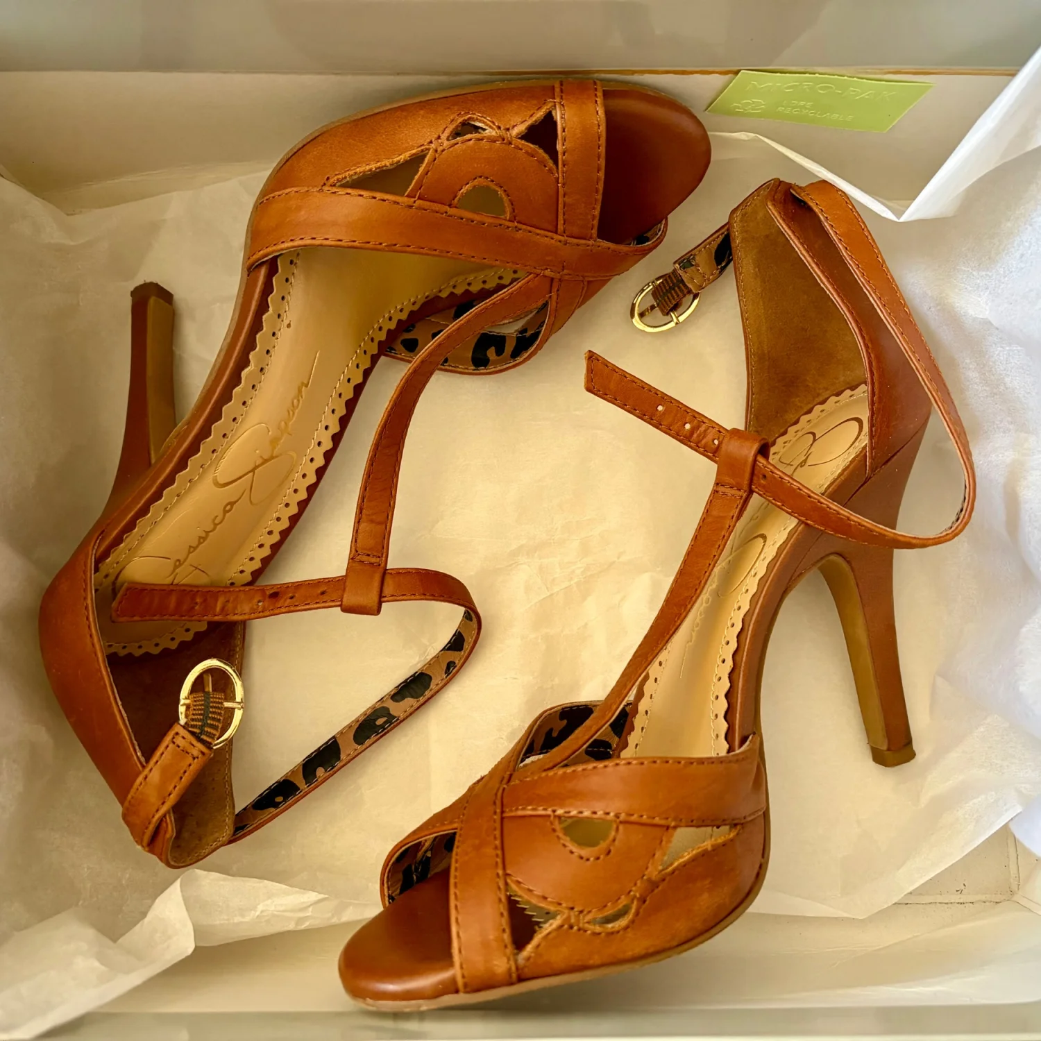 Jessica Simpson Jeraldine Brown Leather Open Toe Heels Women’s Size 5.5 M