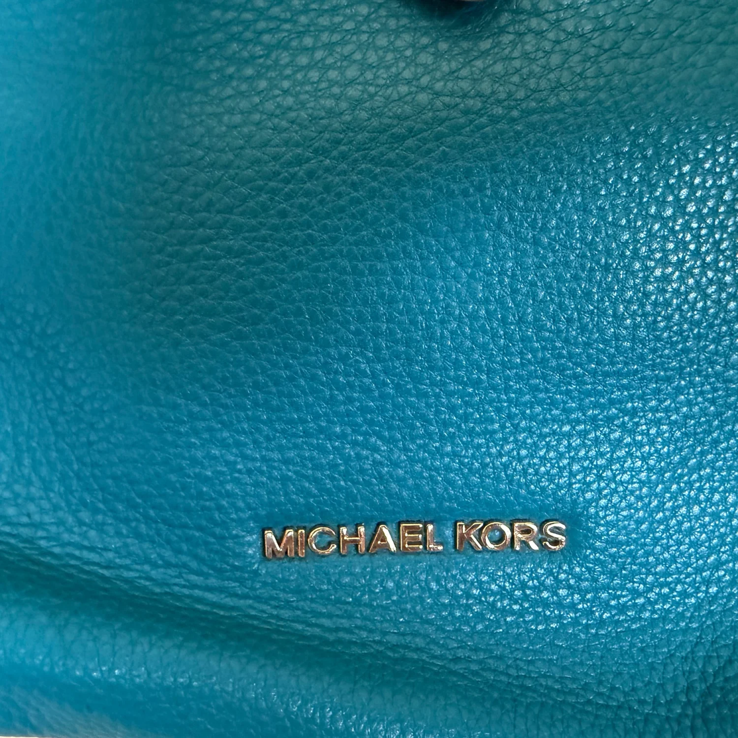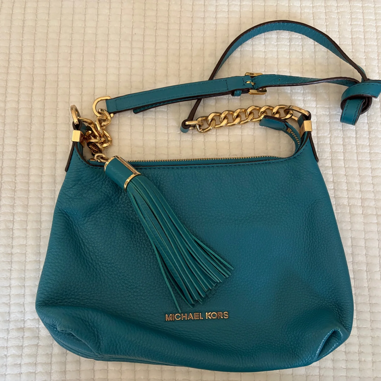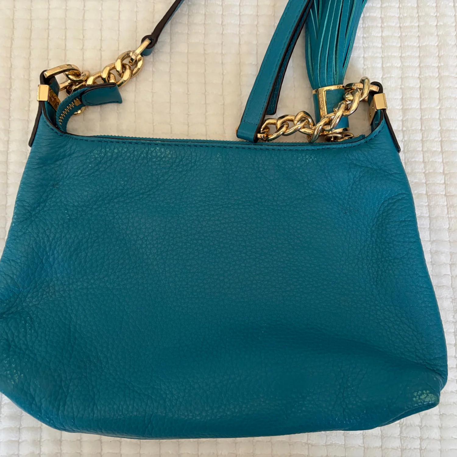 The product is a medium-sized Michael Kors leather shoulder bag with a chain strap and gold hardware. It features a solid teal exterior with a zip closure and shoulder strap handle style. The bag is suitable for travel and casual occasions, with inner pockets for organization. The gold-plated hardware adds a touch of luxury to the designer piece, which is perfect for those looking for a classic and colorful accessory to complete their city look. Good Condition. See Photos For Details And Condition. All Sales Are Final.