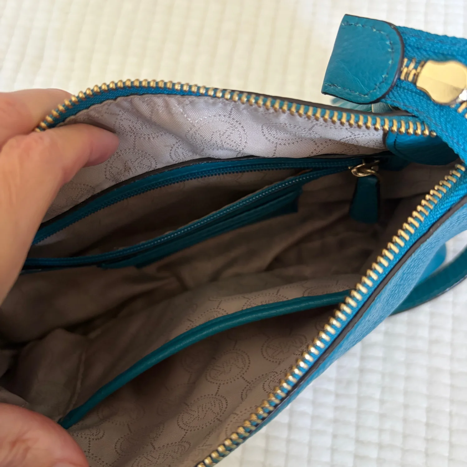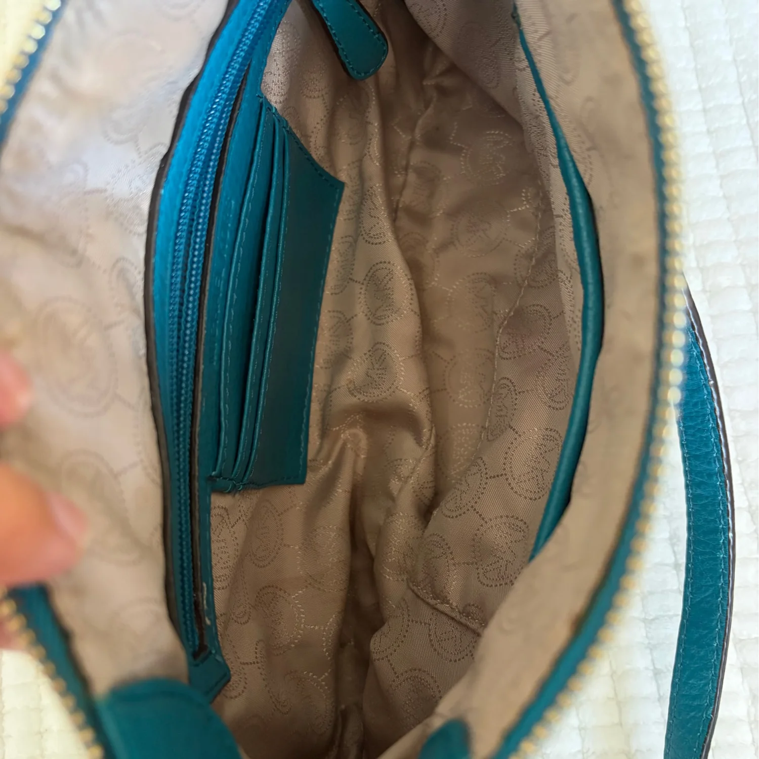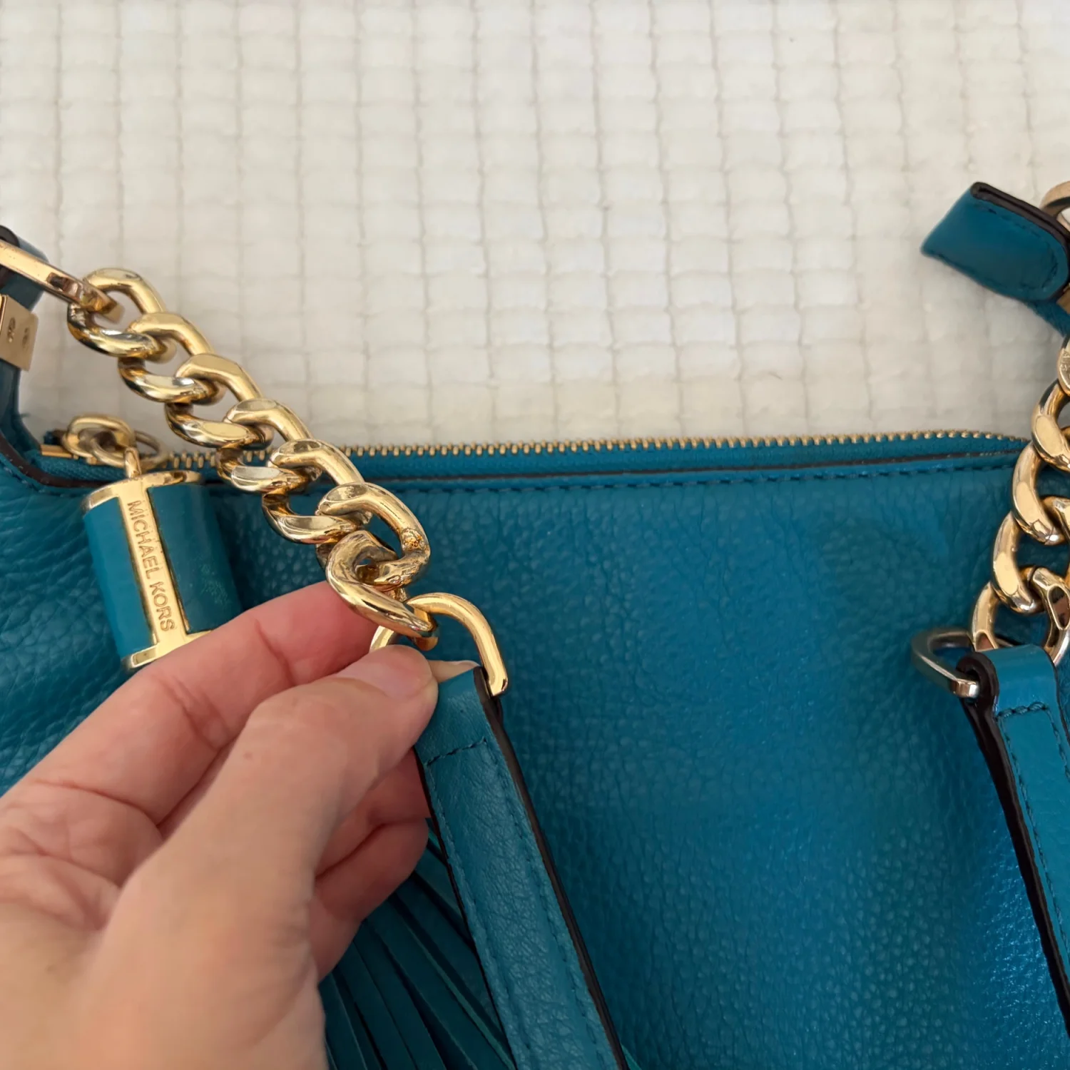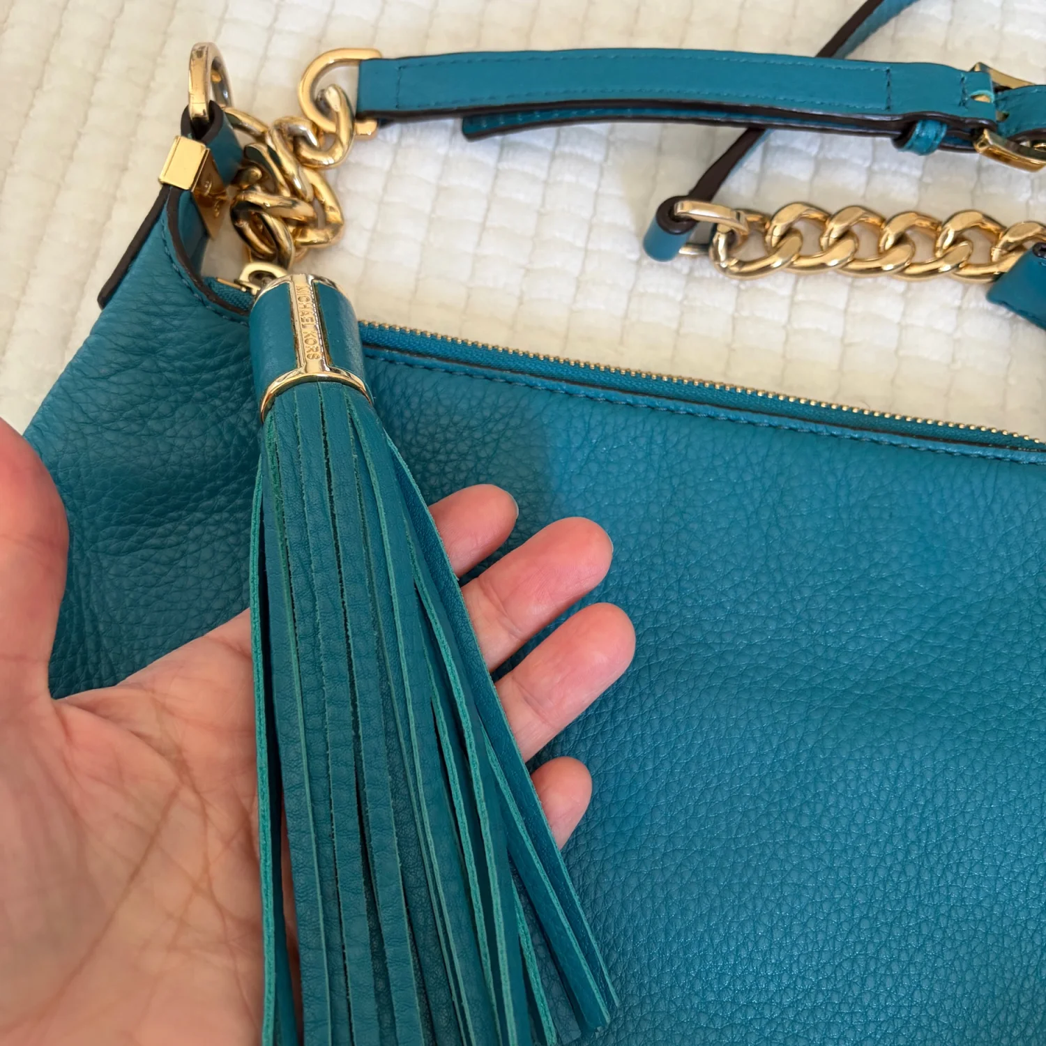 The product is a medium-sized Michael Kors leather shoulder bag with a chain strap and gold hardware. It features a solid teal exterior with a zip closure and shoulder strap handle style. The bag is suitable for travel and casual occasions, with inner pockets for organization. The gold-plated hardware adds a touch of luxury to the designer piece, which is perfect for those looking for a classic and colorful accessory to complete their city look. Good Condition. See Photos For Details And Condition. All Sales Are Final.