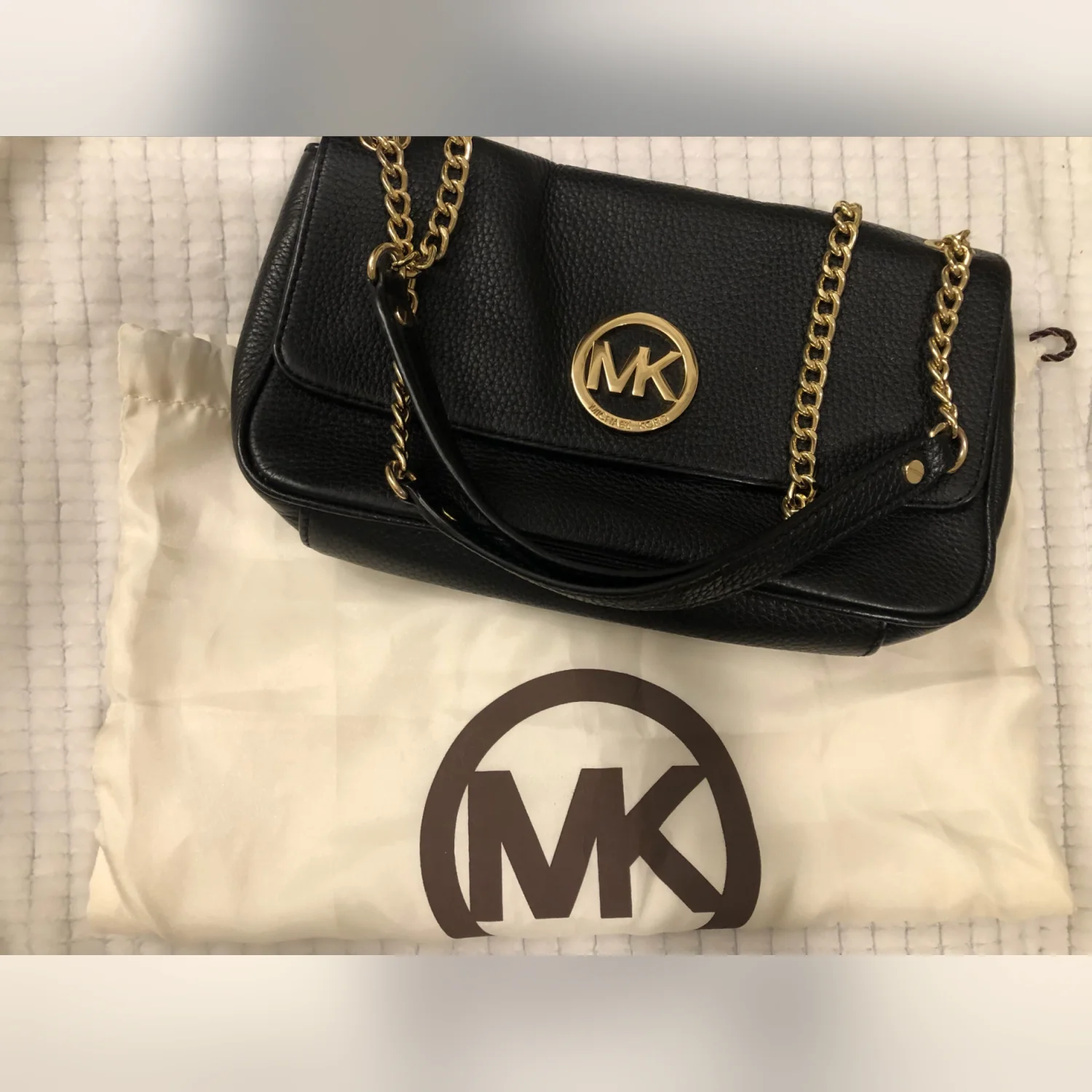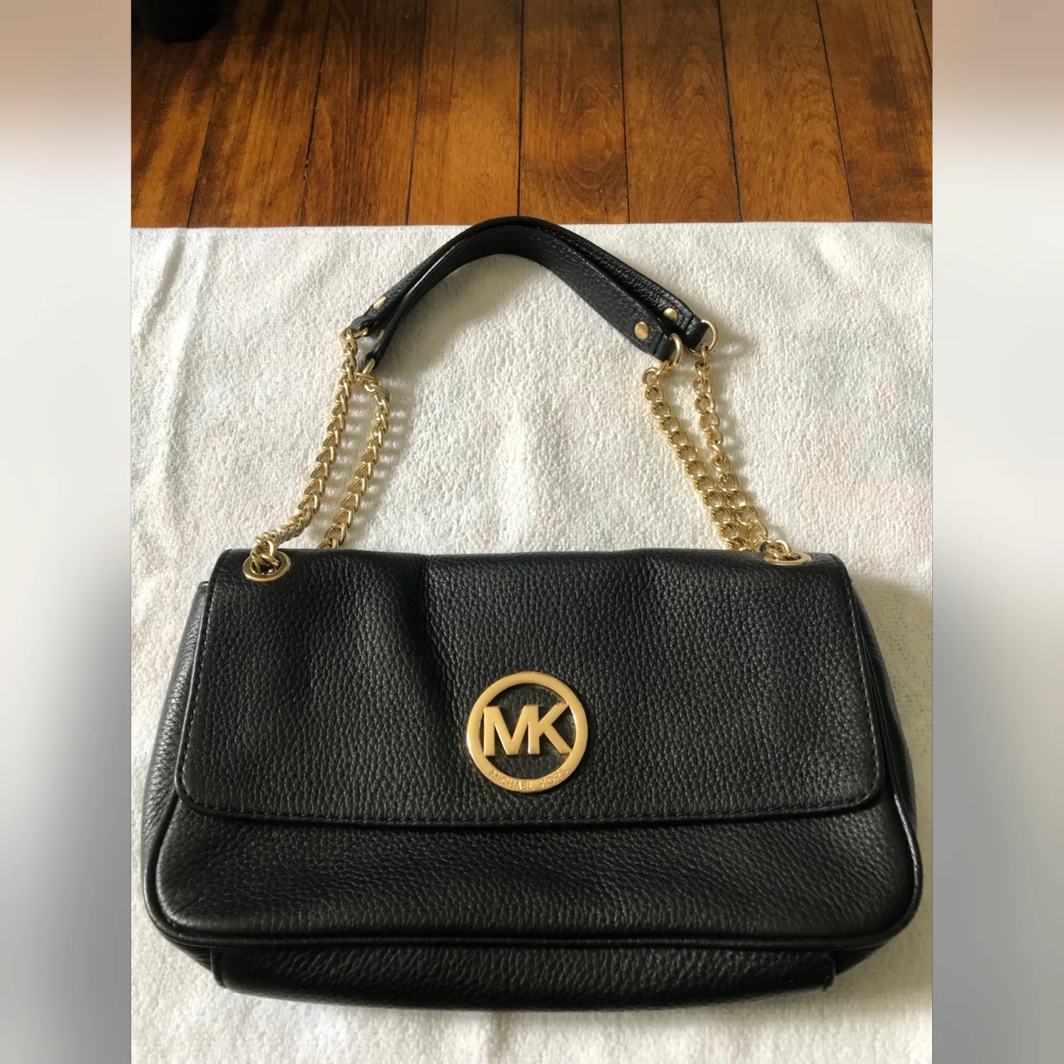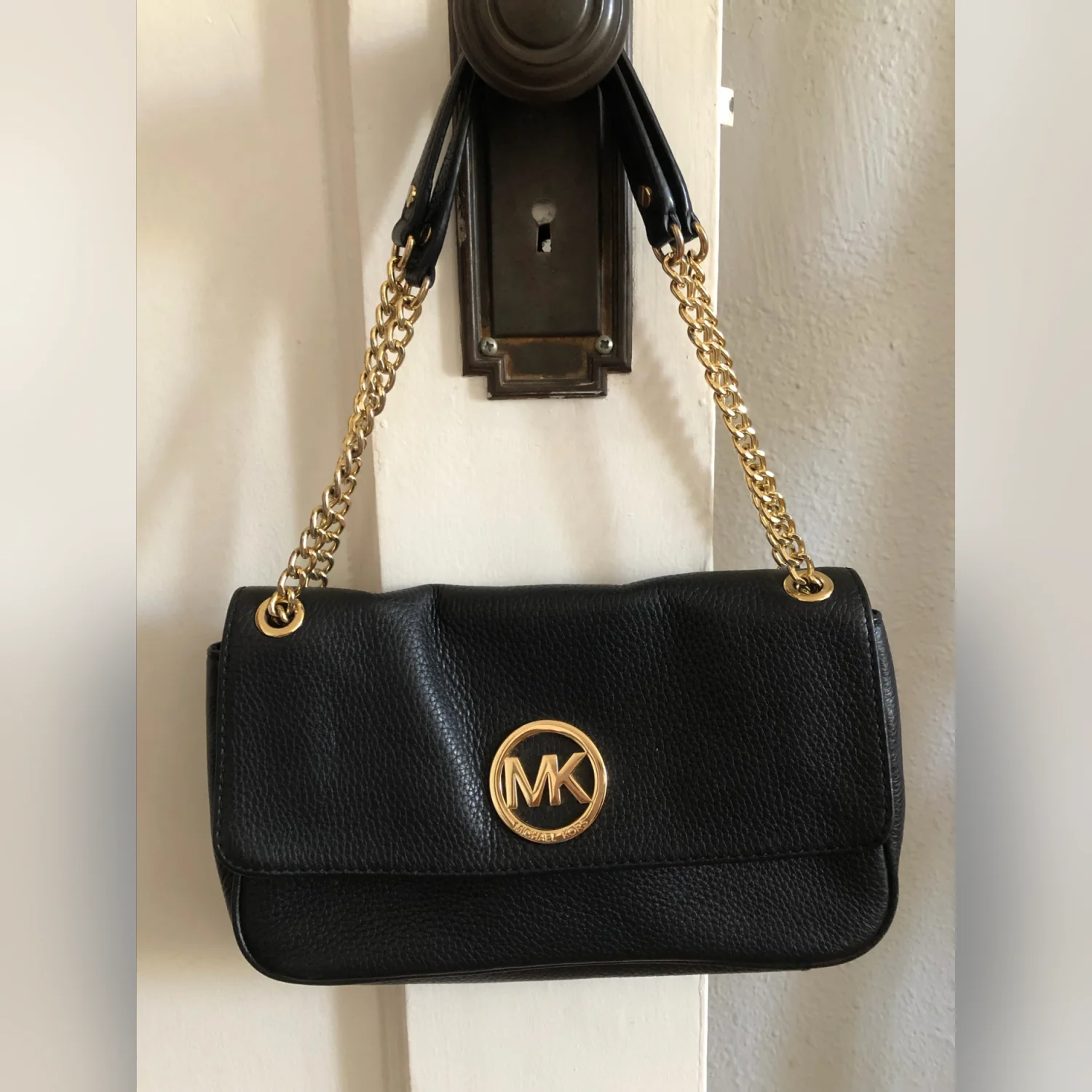 Michael Kors Women’s Fulton Shoulder Flap Bag Pebbled Black Leather Clutch Gold Logo Gold Chain Strap