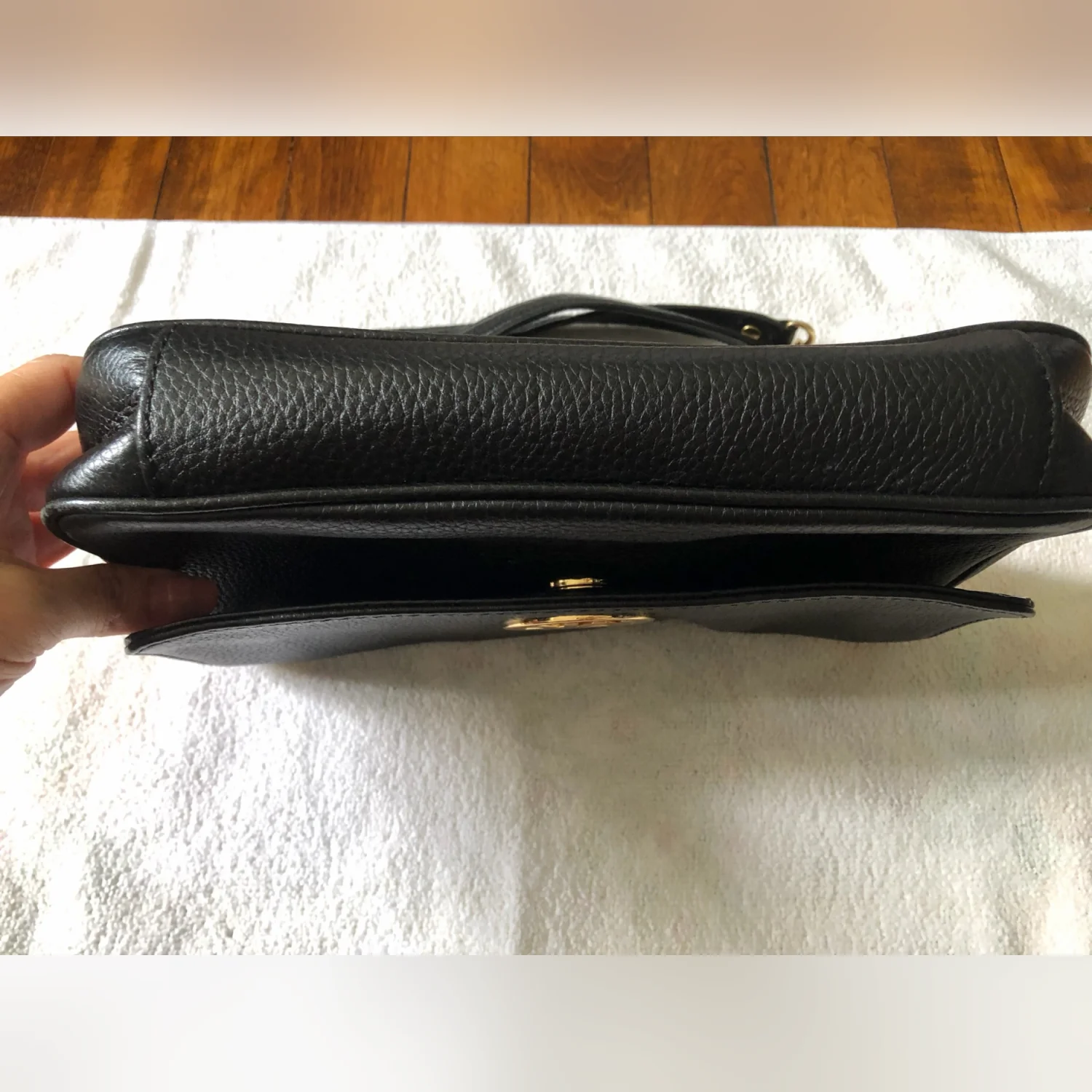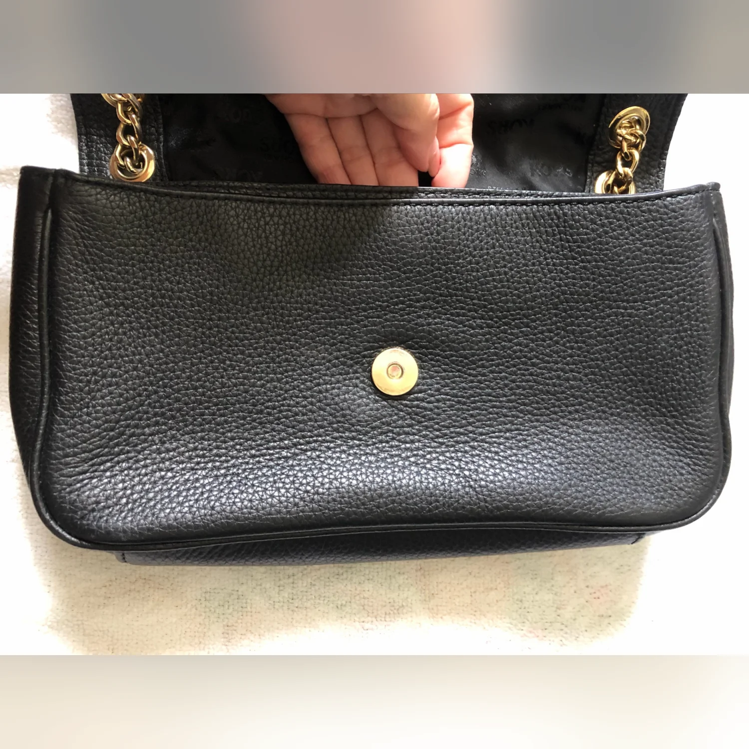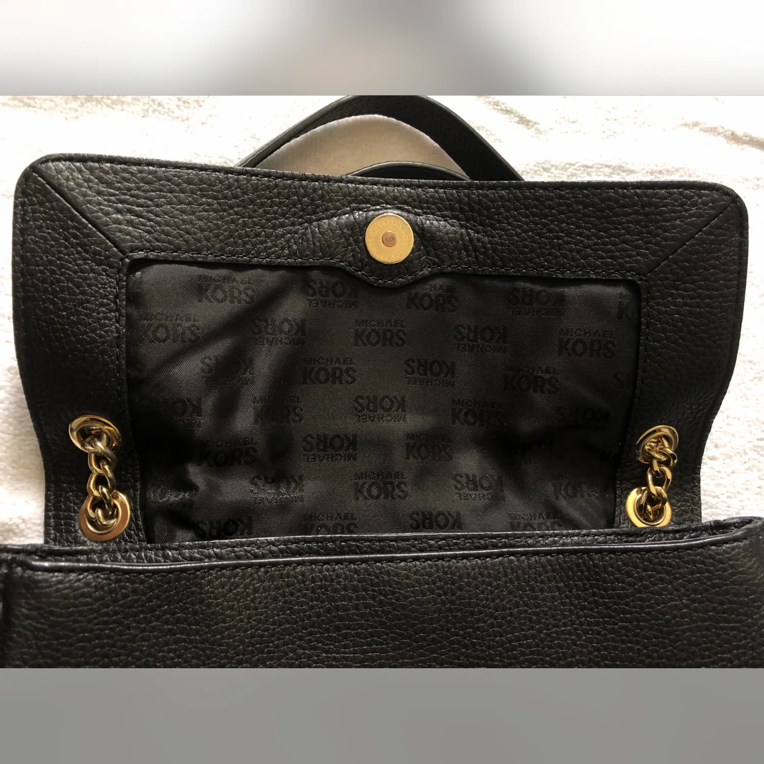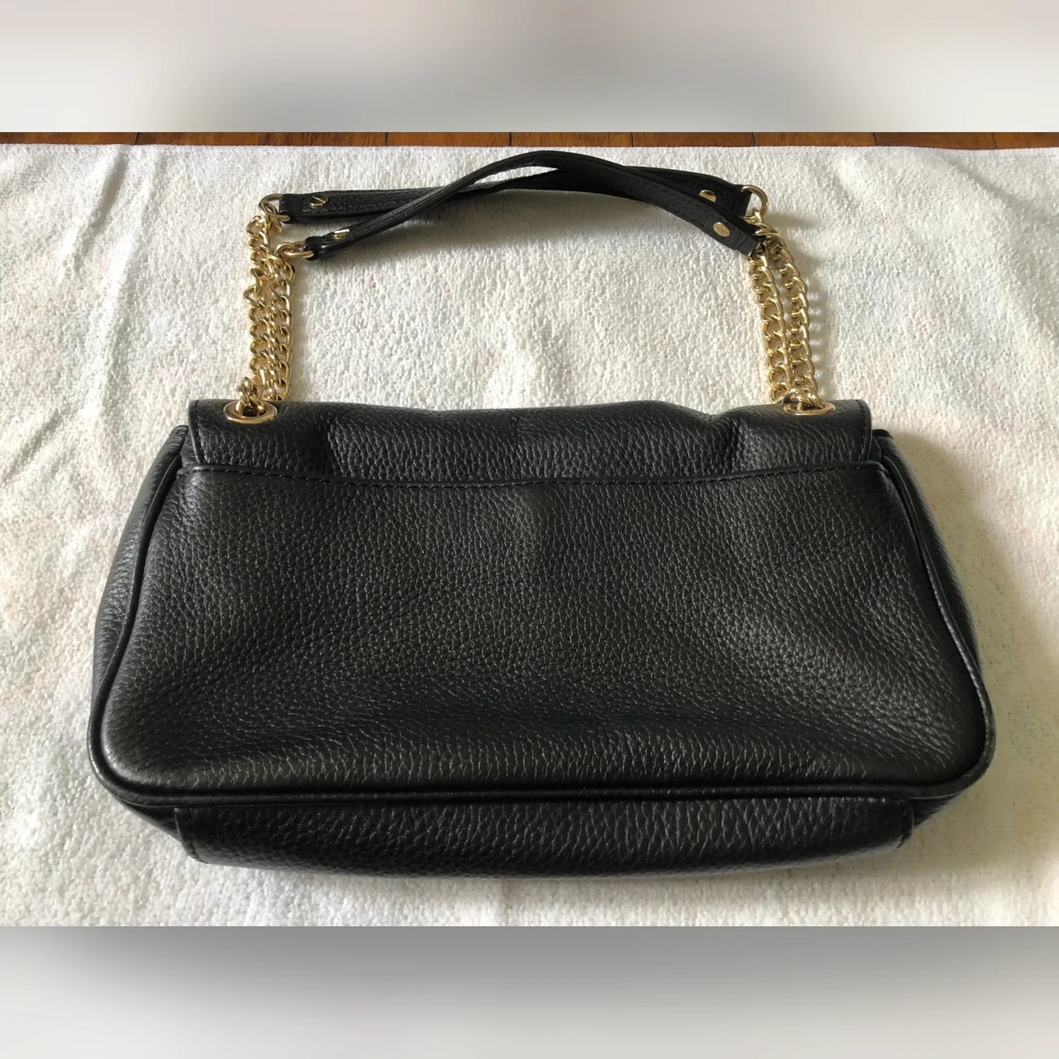 Michael Kors Women’s Fulton Shoulder Flap Bag Pebbled Black Leather Clutch Gold Logo Gold Chain Strap