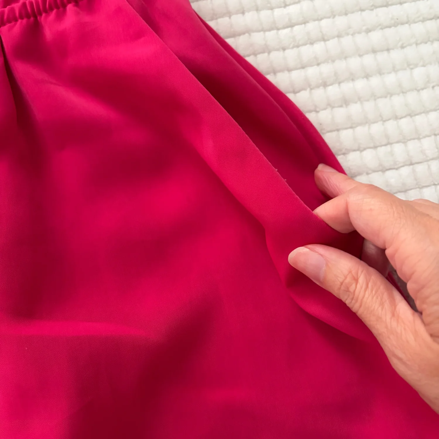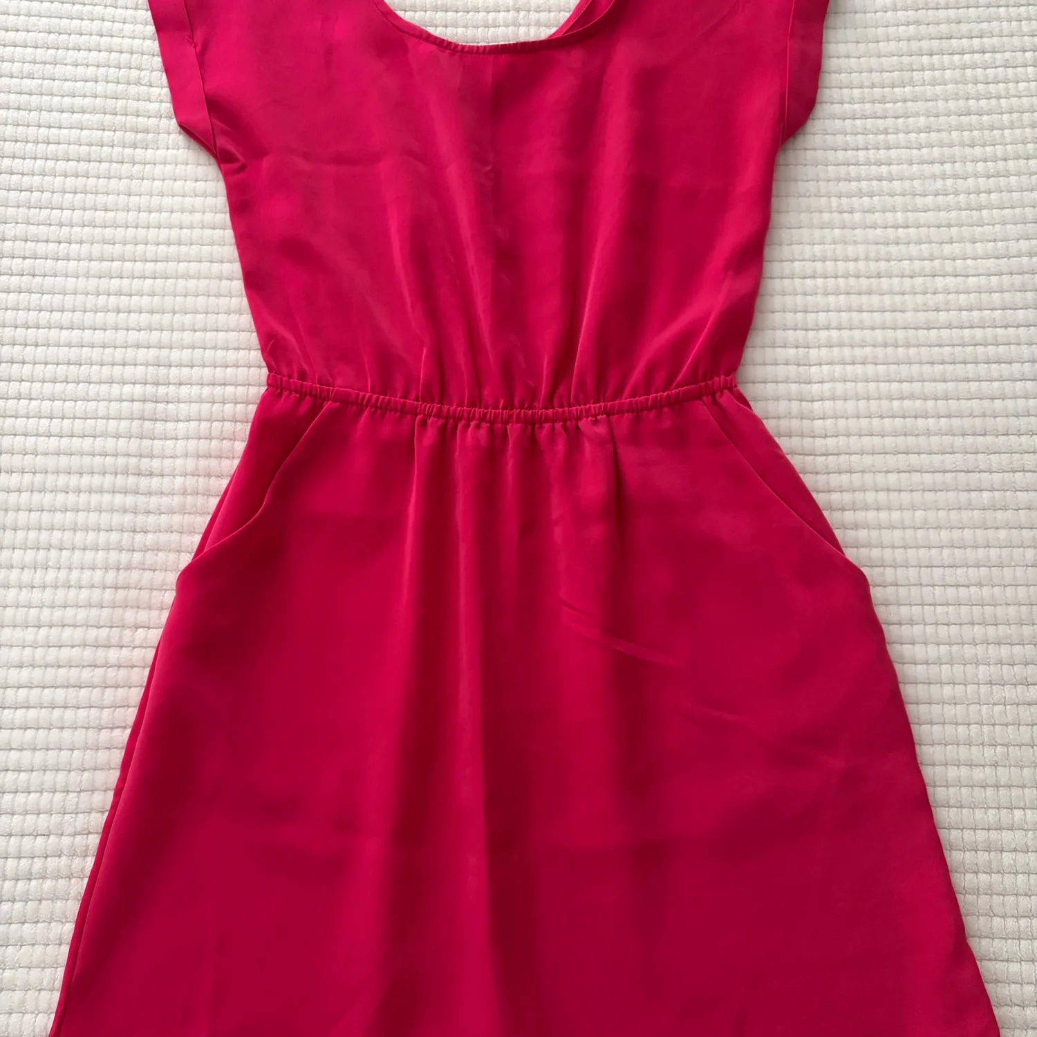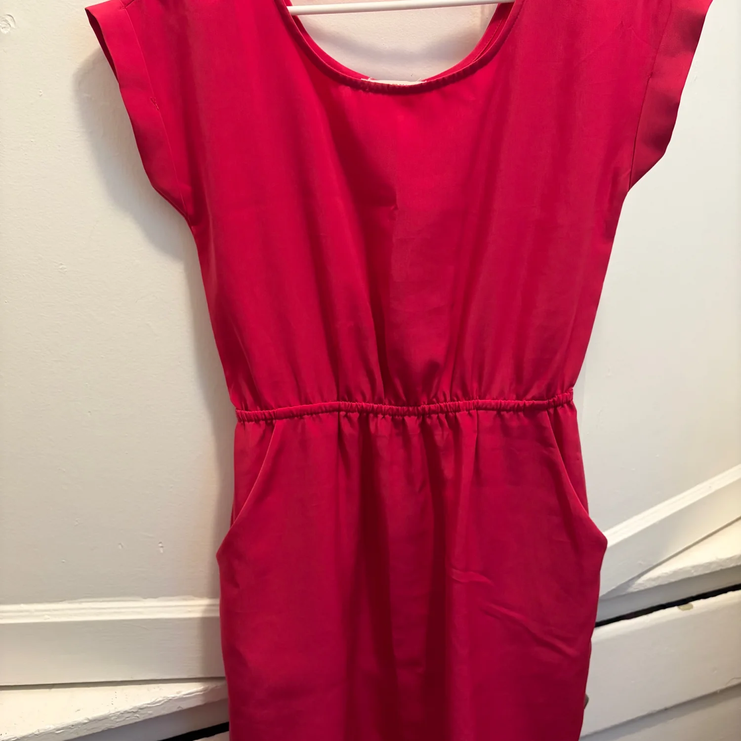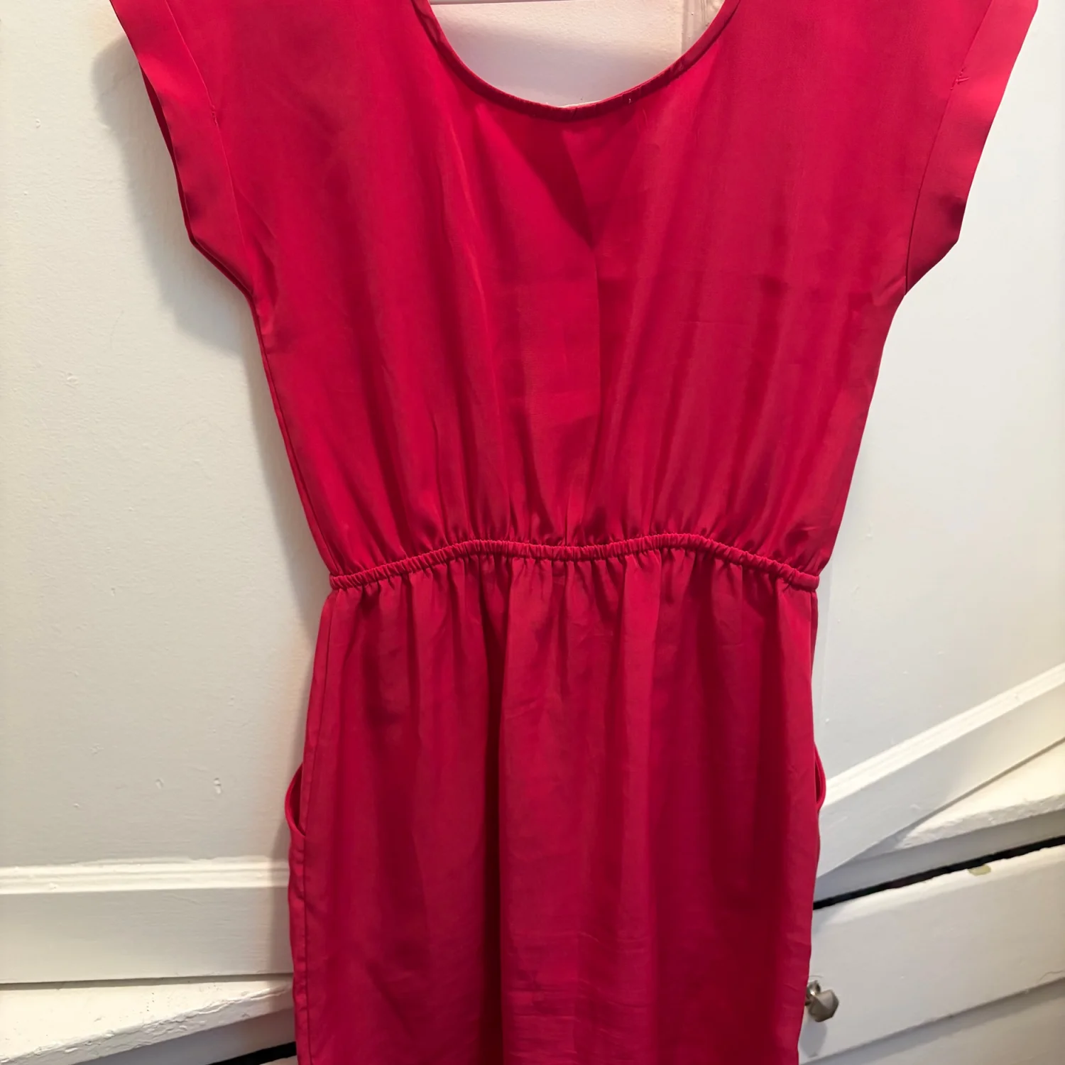 Vibrant pink casual dress from Pink Rose. Cap sleeves and a round neckline. Elastic waist for a gentle shape. Hidden side pockets for practicality. Smooth, lightweight fabric for daily wear. Good Condition. See Photos. All Sales Are Final.