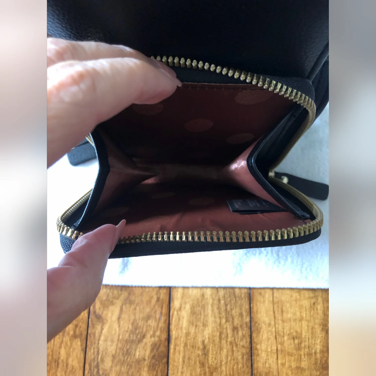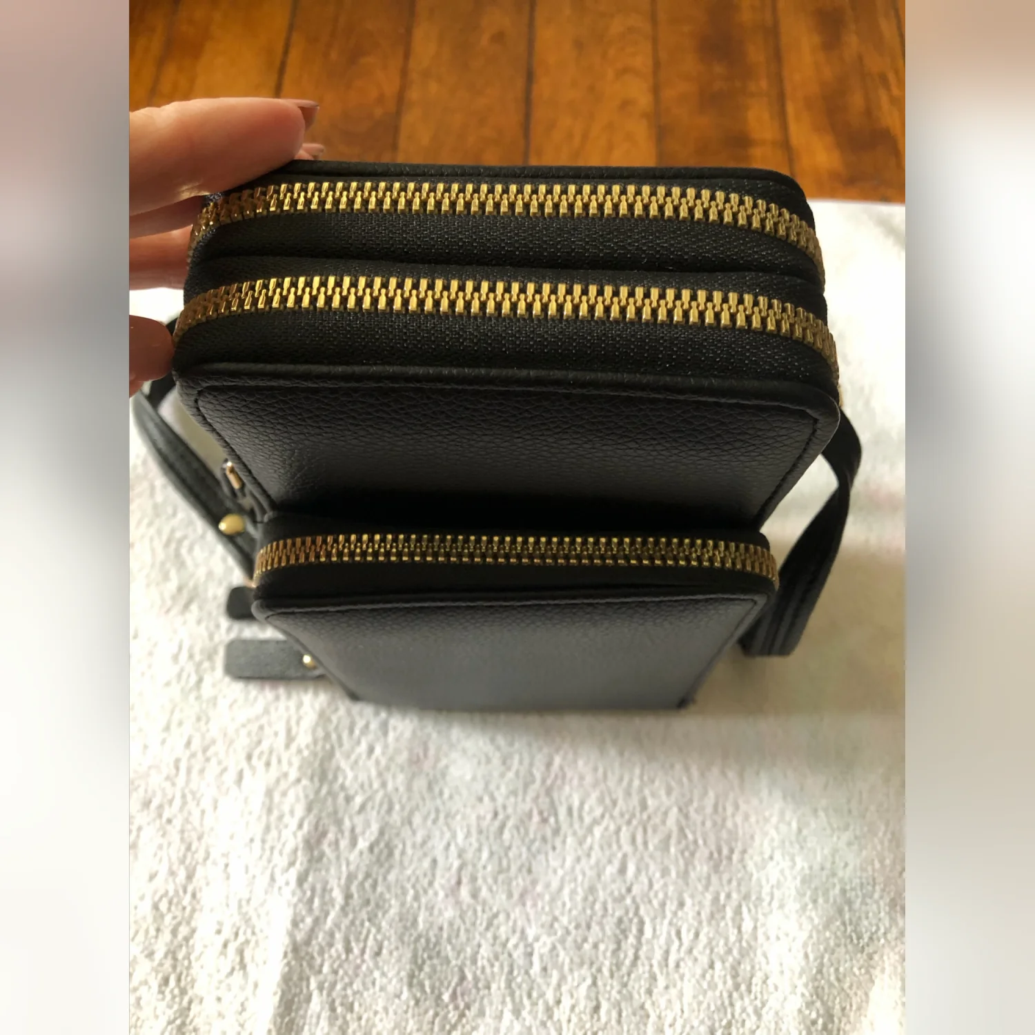 Small Black Leather Shoulder Bag Gold Zipper Detail Multiple Compartments Like New