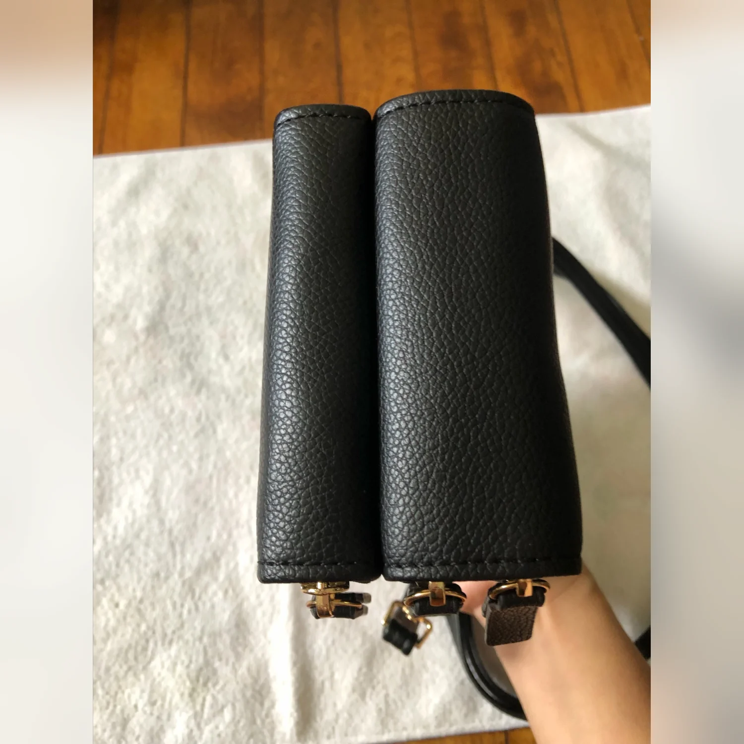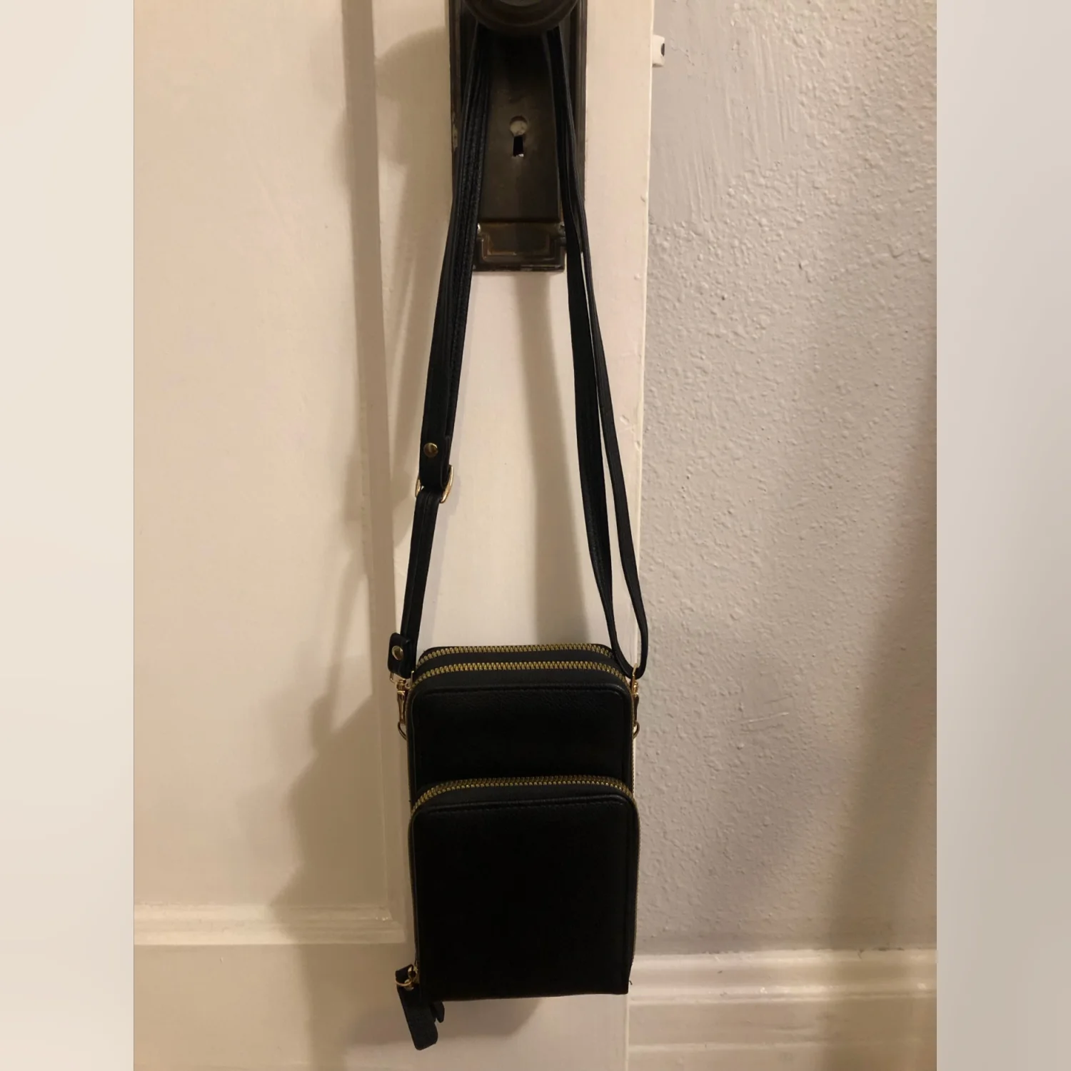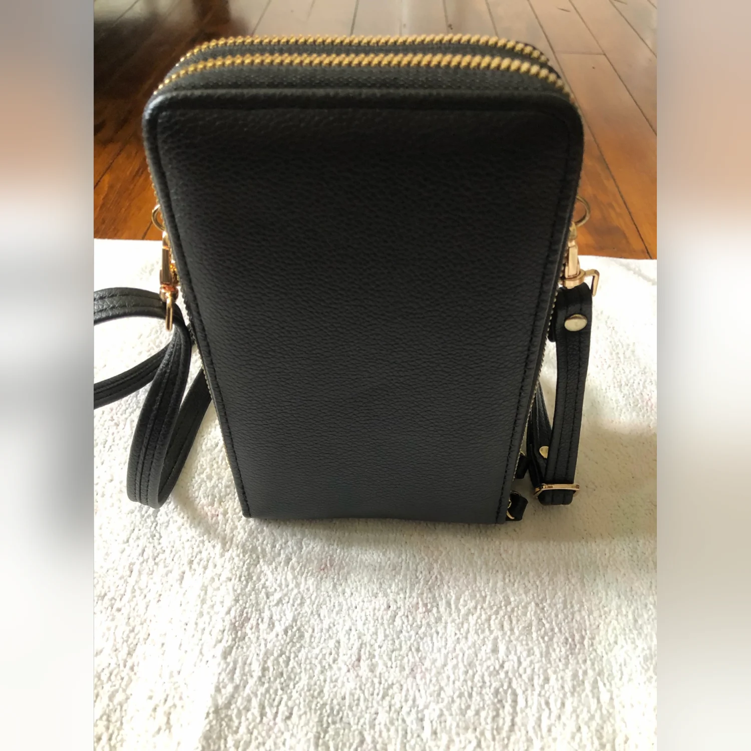 This small black leather shoulder bag features multiple compartments, making it ideal for organizing essentials while on the go. The black exterior and matching leather handle add a sleek and stylish touch, while the brown lining adds a subtle contrast. The compact size of the bag makes it perfect for carrying daily essentials, and the shoulder strap allows for easy and comfortable carrying. Perfect for women who appreciate both fashion and functionality in their handbag choice. Gently Used. In Excellent Condition. See Photos. All Sales Are Final.