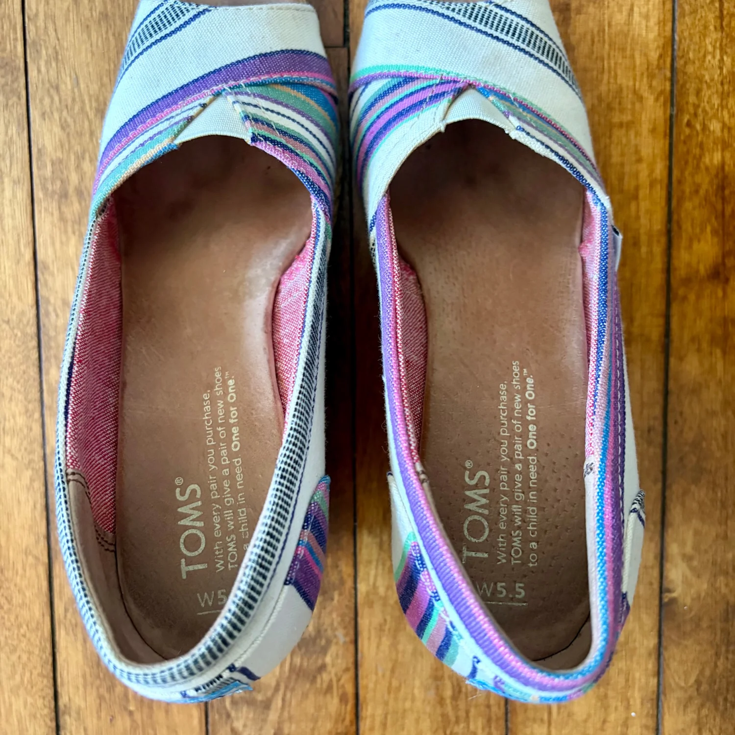 The TOMS Multicolor Wedge Village Stripe Peep Toe Women's Shoes in size W5.5 are a stylish and comfortable option for going out or traveling. With a slip-on design and wedge heel, these espadrilles feature a colorful striped pattern and a peep toe shape. The multicolor design and logo accents add a unique touch to the shoe, making them perfect for casual outings, parties, or cocktails during the spring or summer seasons. Made with a fabric upper and insole, these TOMS shoes offer both style and comfort for the modern woman on the go. Good Condition. Blemish: Minor Stain. See Photos For Details and Condition. Bottom Soles Need Cleaning. All Sales Are Final.