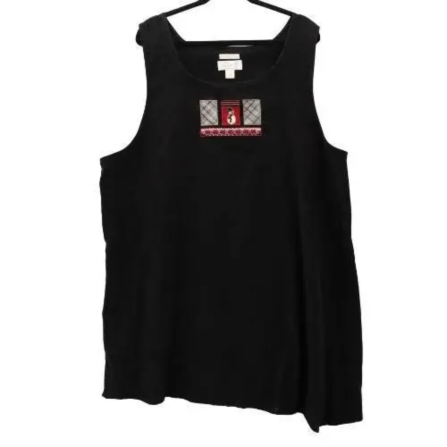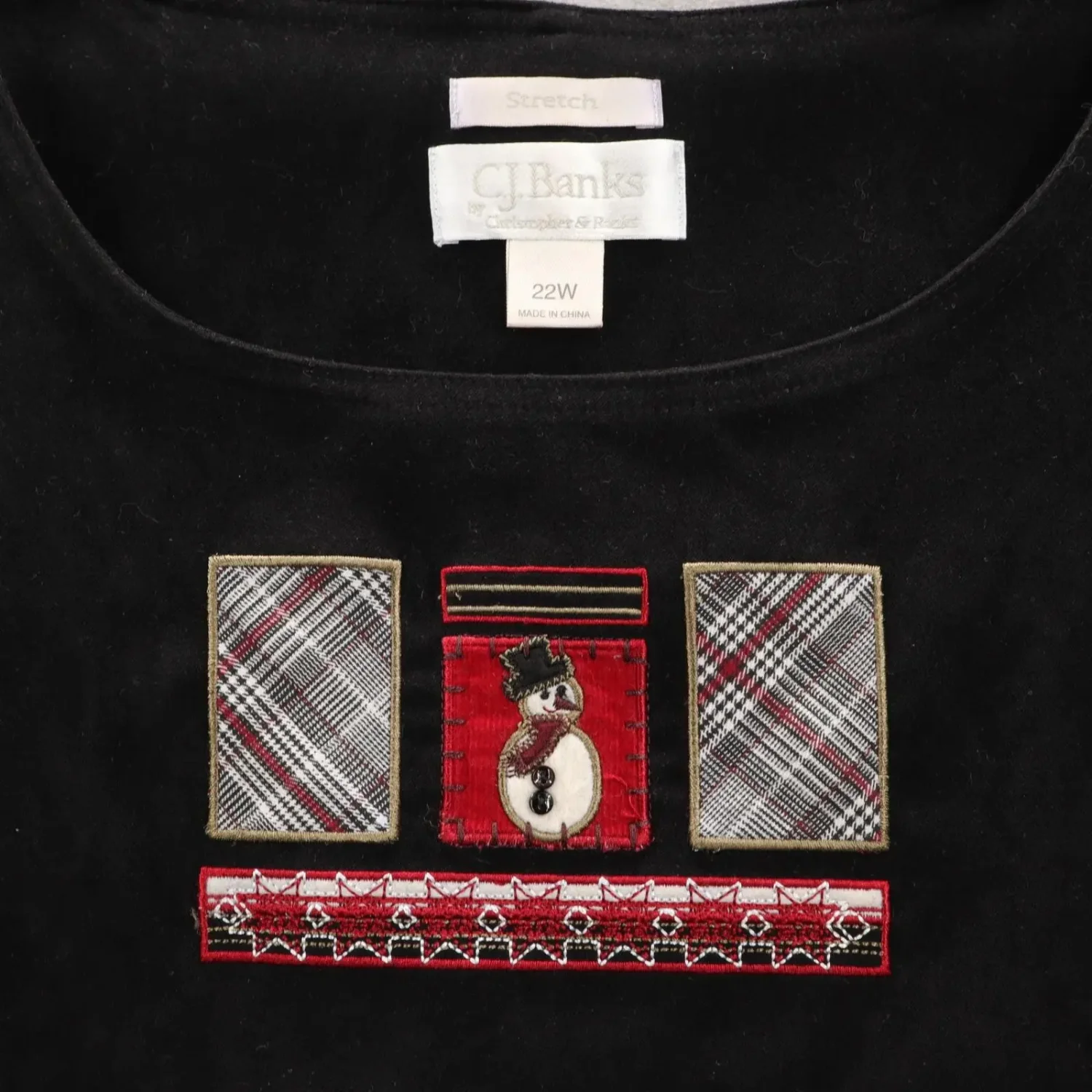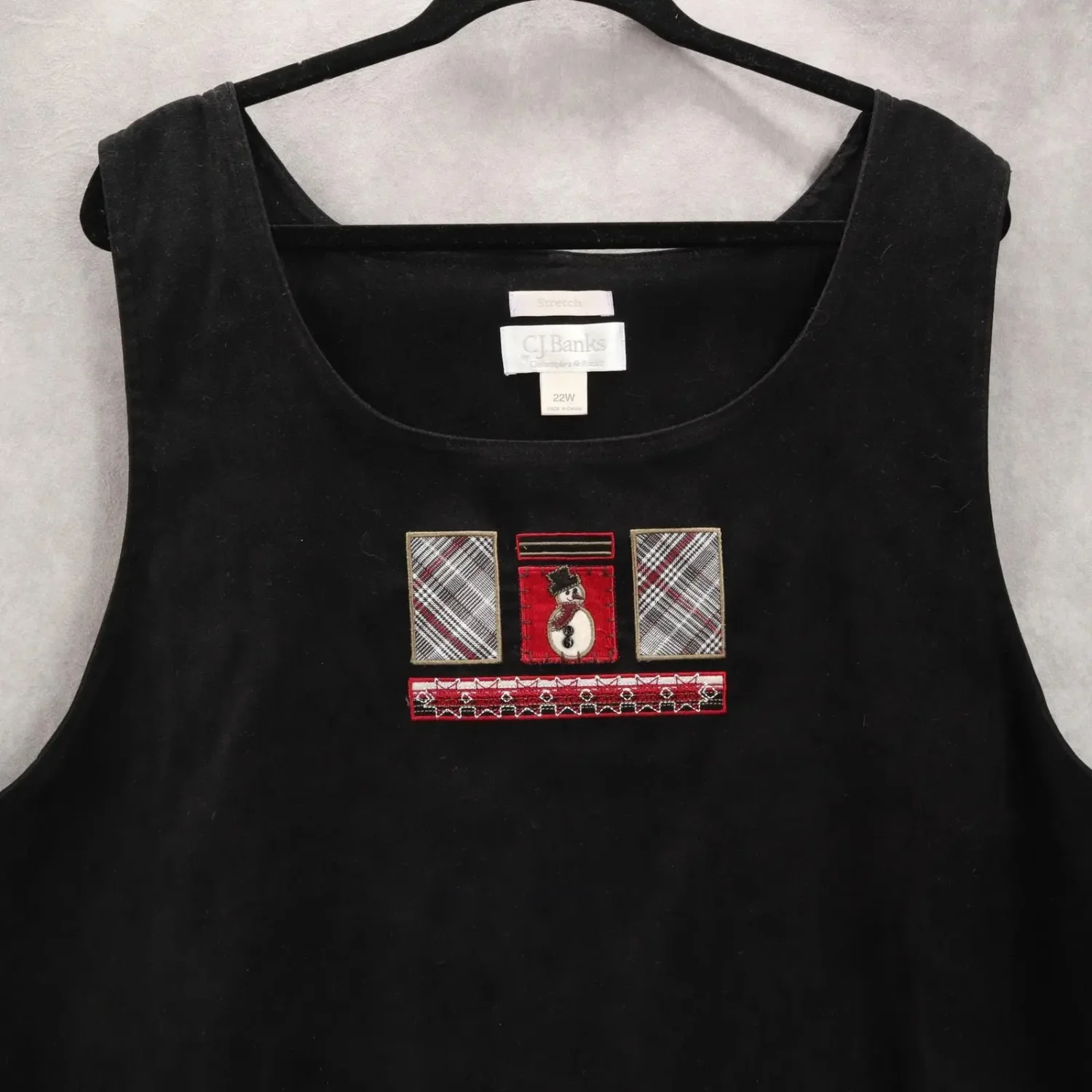 CJ Banks by Christopher Banks Black Snowman Stretch Vintage Granny Christmas Holiday Party Cottage Dress Plus 22W PTP: 27" Length: 36" Sleeveless Knee Length Pull Over Style Material Tag Missing Snowman Pattern on Front & Back Mark along the hem SKU: 00116