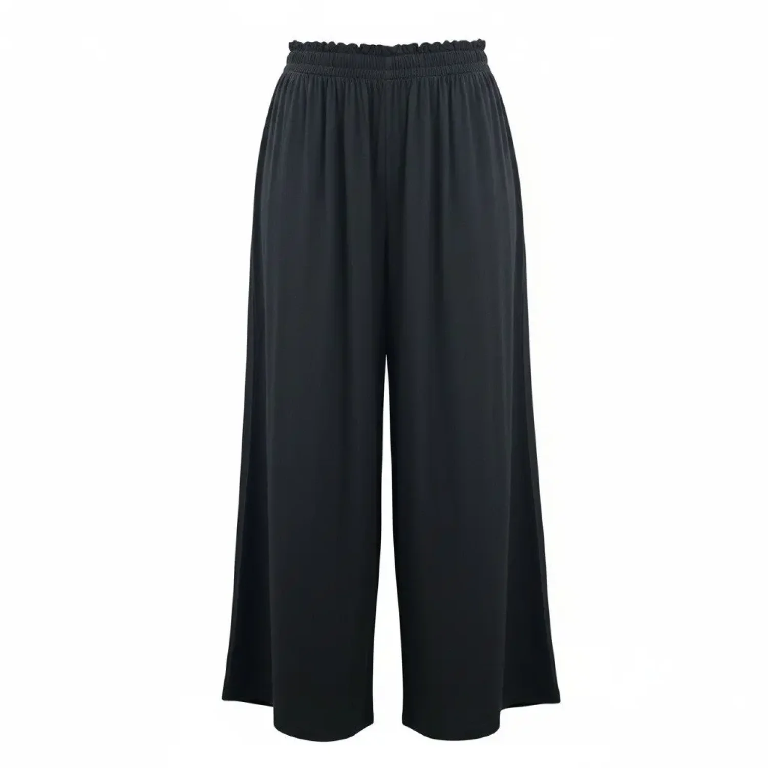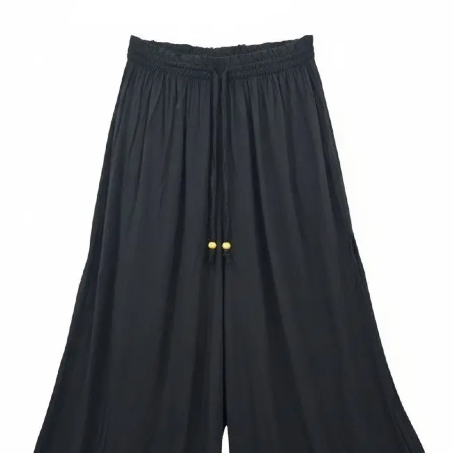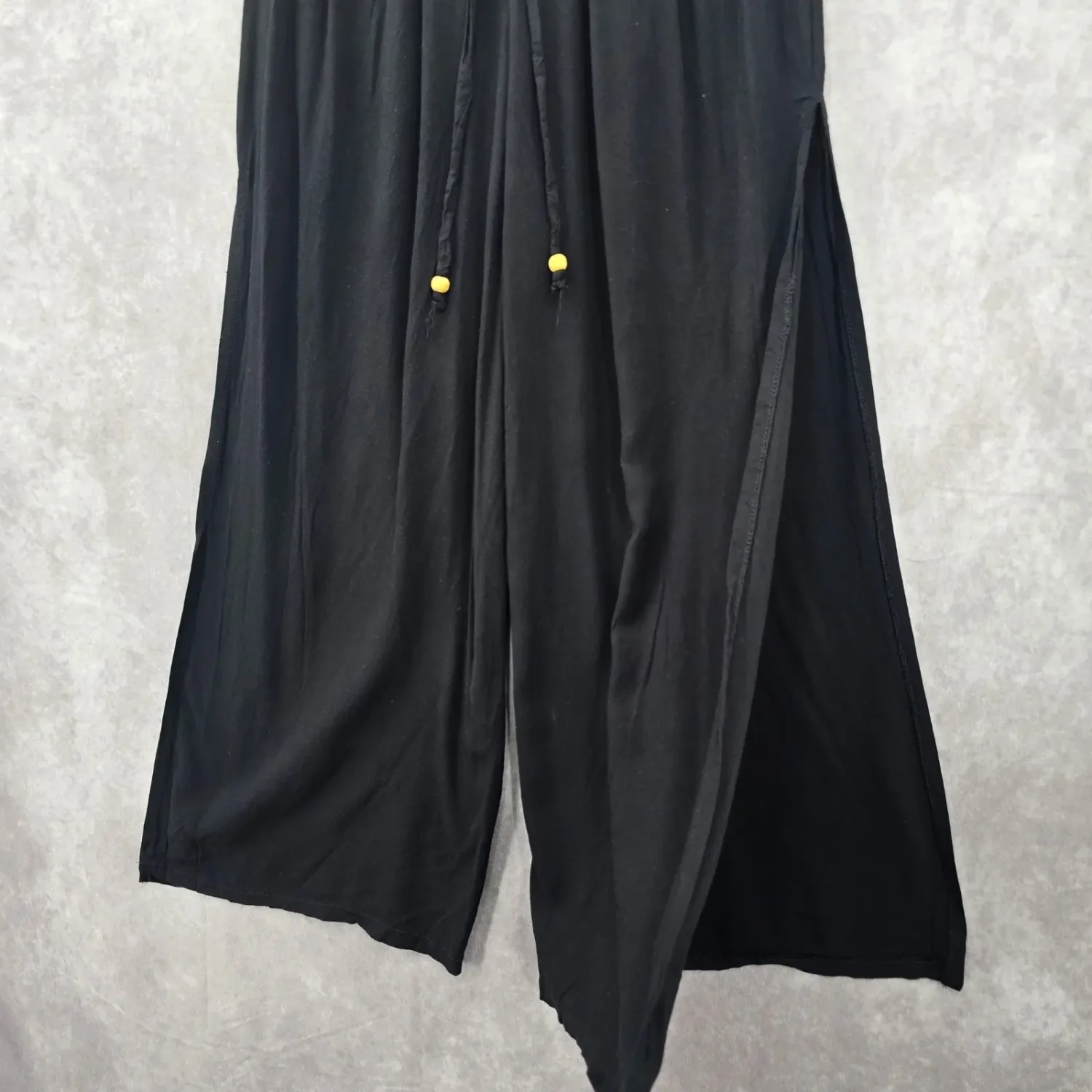 Black Wide Split Flowy Straight Beach Vacation Lounge 90s Pullon Boho Pants XS Waist: 12"-19" (Elastic Stretch) Length: 37" Inseam: 24.5" Leg Opening: 13" Split Length: 23" Elastic Waist Pull On Wide Leg Style Split on both side of legs Drawstring with beads No Brand/Material Tag SKU: 00061