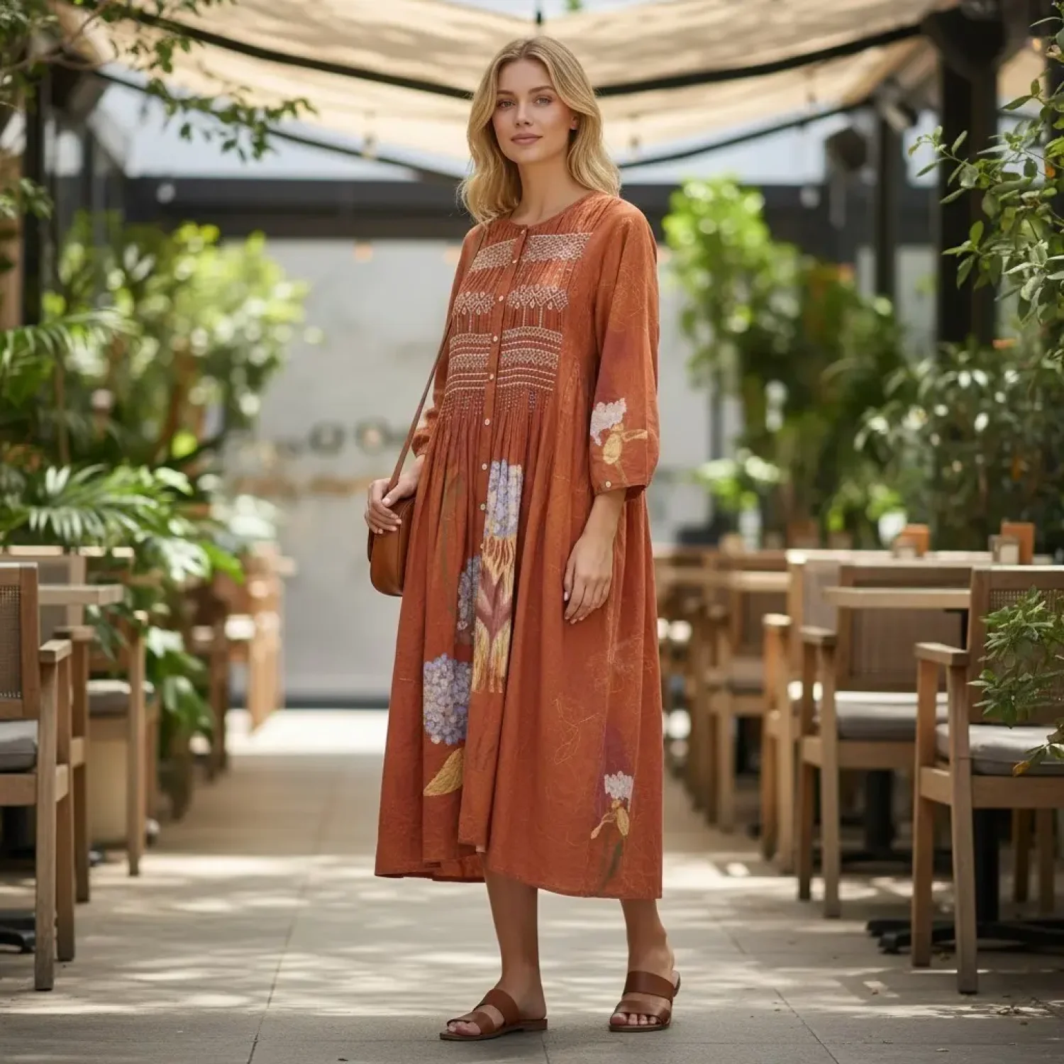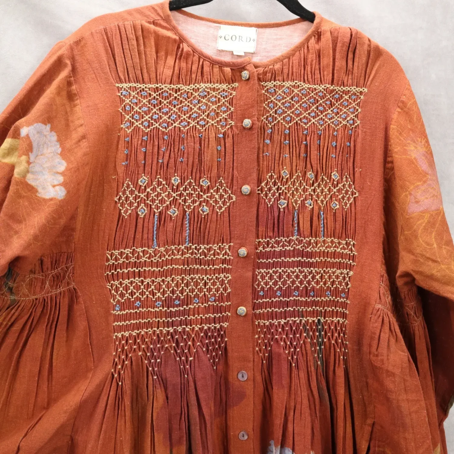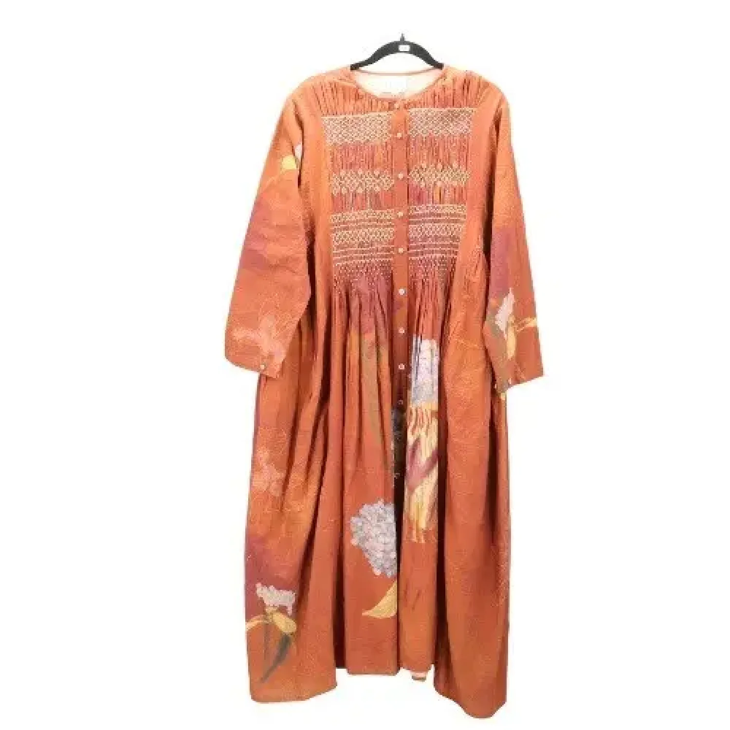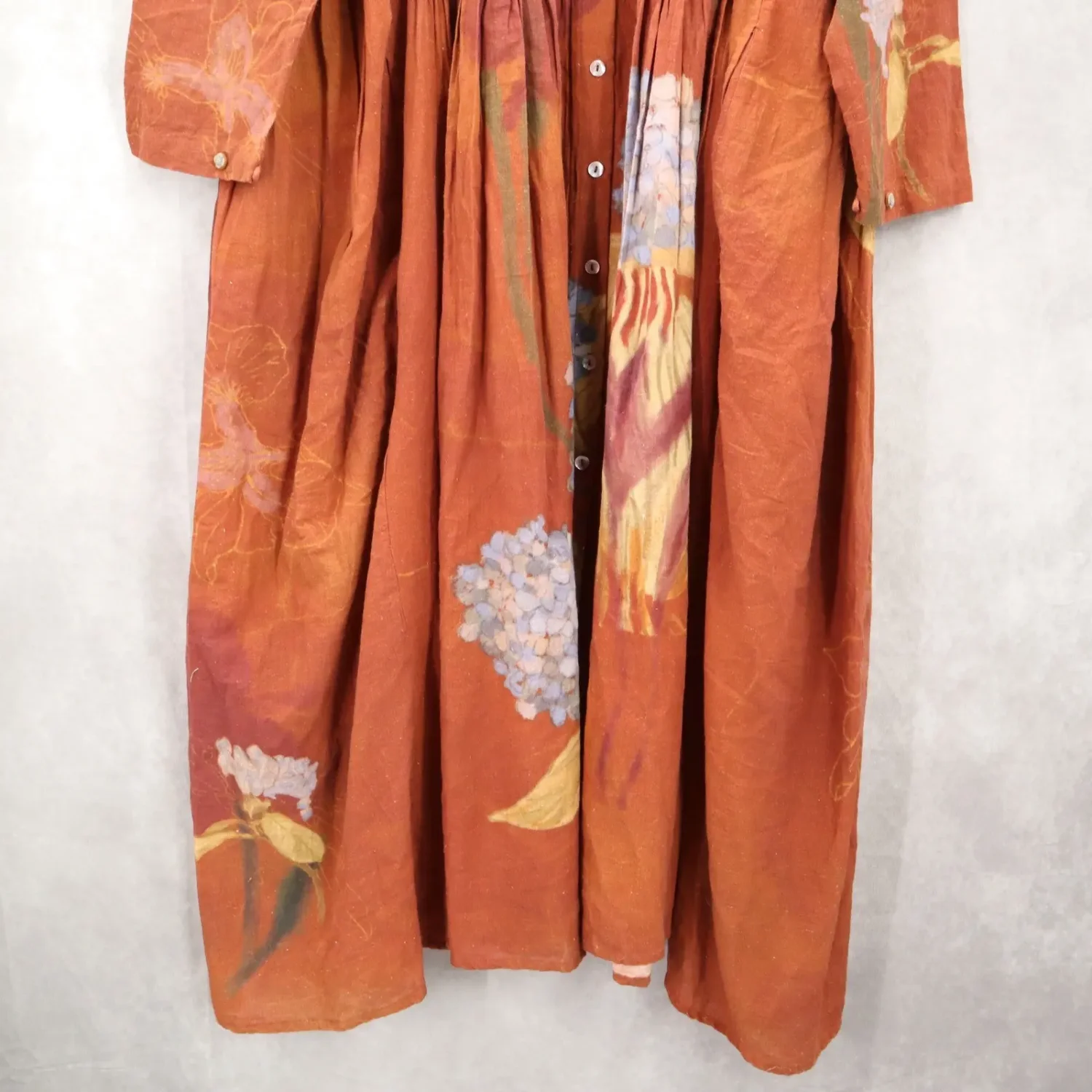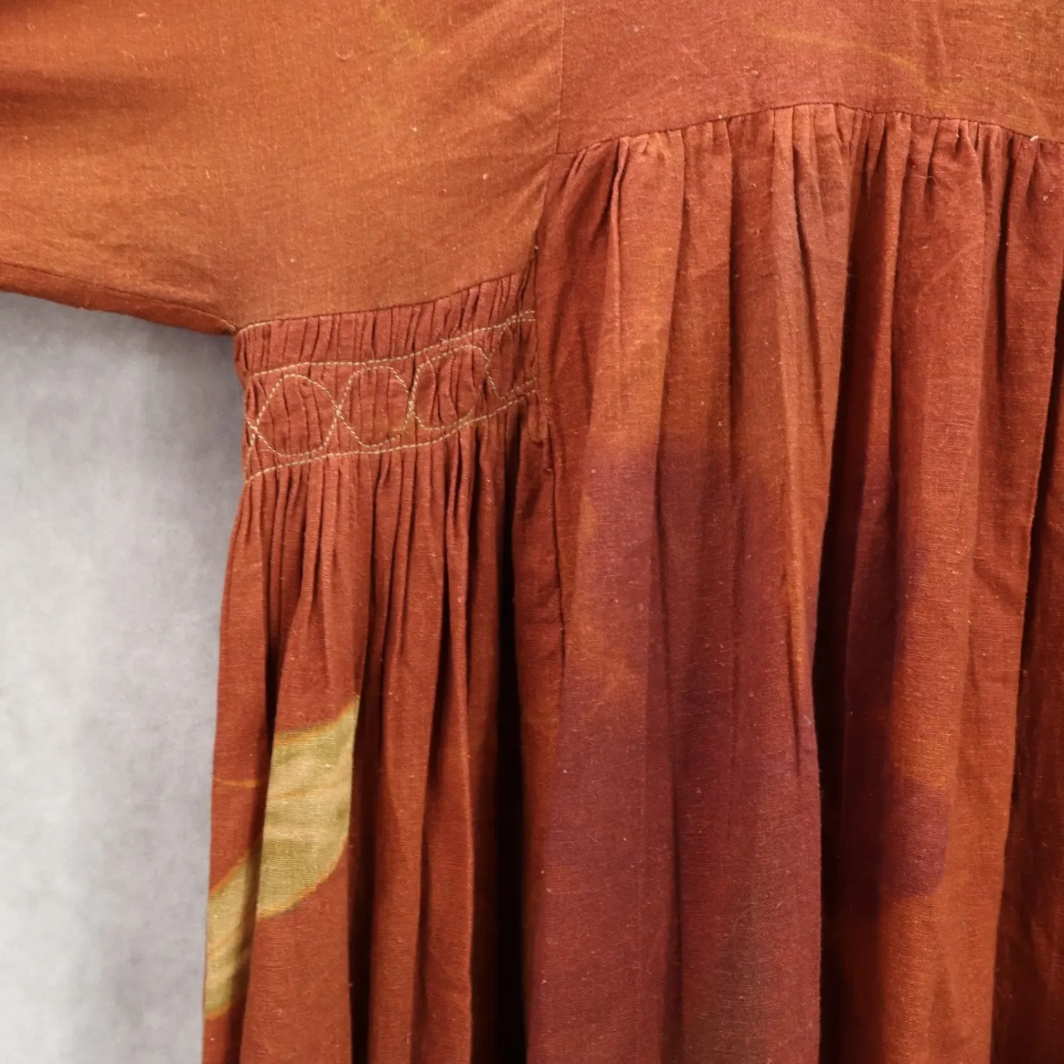 Boho Cottage Cotton Rust Floral Earthy Prairie Artsy Folk Peasant Maxi Dress XXL Brand: Cord Studio Frida Dress MSRP: $237 PTP: 26" Length: 51" This dress is made from cotton fabric in a relaxed silhouette. It features smocking on the yolk, gathers on the side and buttons along the front. Pattern: Foliage Floral Tropical Sleeve Length: Full Sleeves Details: Smocking details on the yoke, Front button fastening Fit: Relaxed Fit Material: Cotton Rust Orange Brown Flare Care: Dry clean only gentle hand wash SKU: 00116