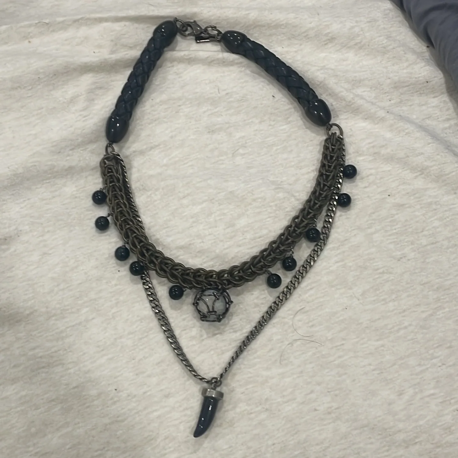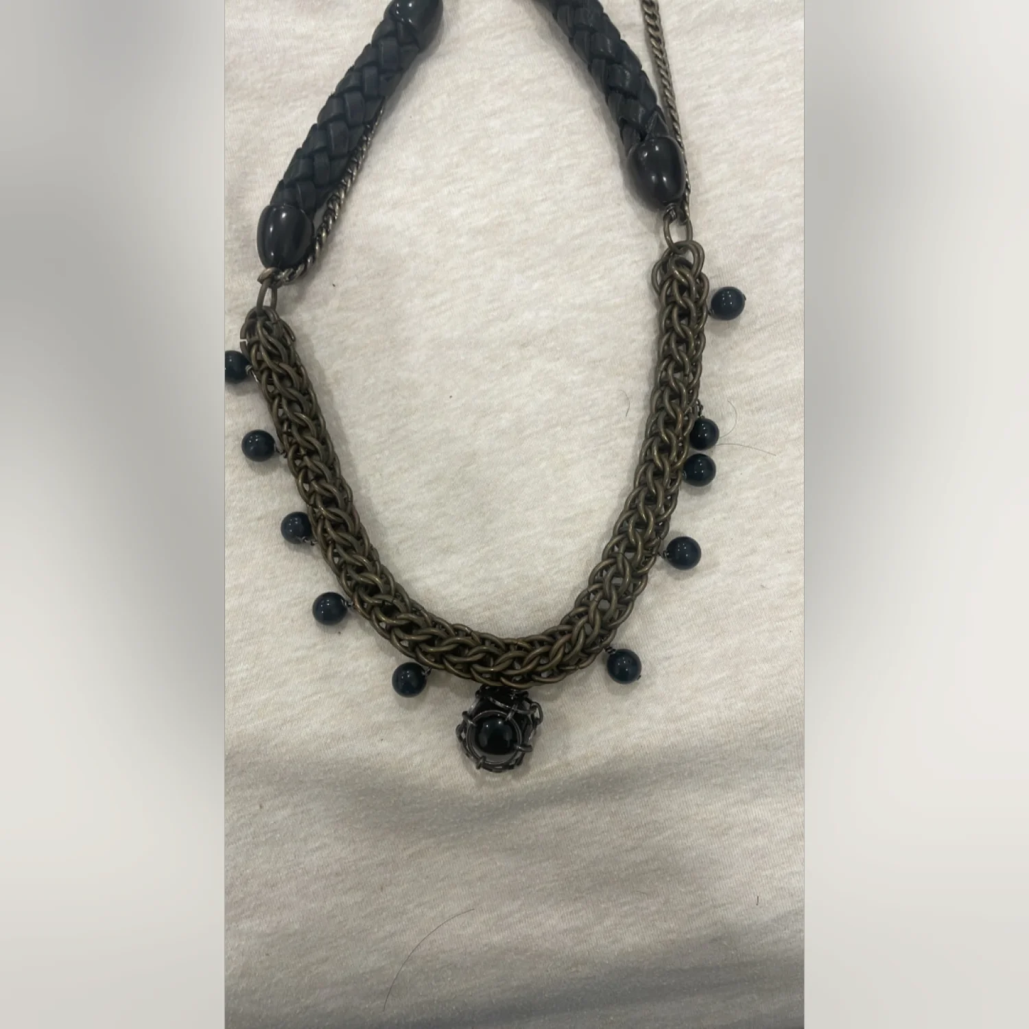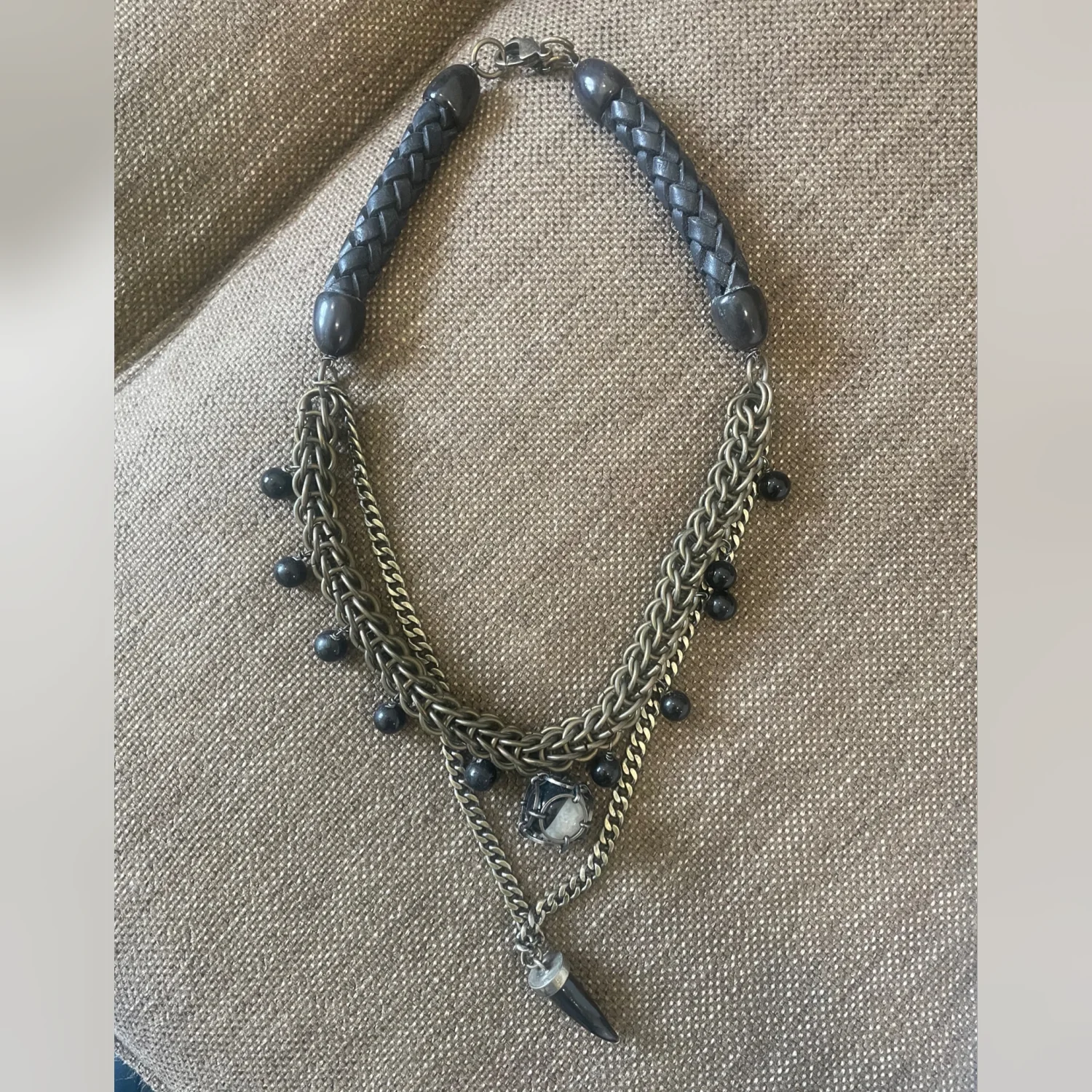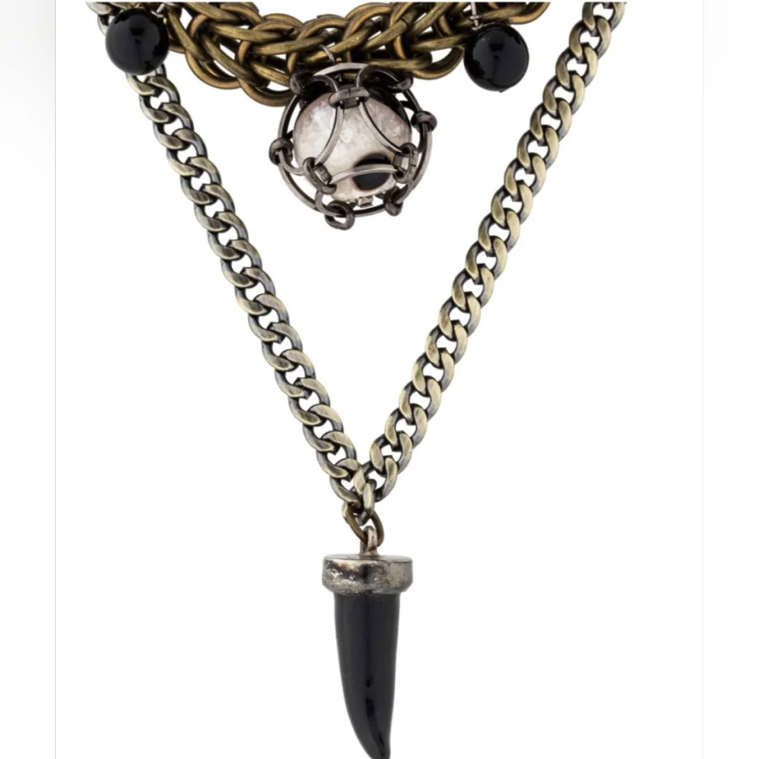RARE SOLD OUT NECKLACE! This statement necklace features a layered chain design with intricate woven brass links and black bead accents. It includes a striking black pendant and a unique feature piece enclosed in a metallic frame. The back has a braided leather black cord for comfort. Perfect for adding an edgy touch to any outfit. #statementjewelry #edgy #layerednecklace