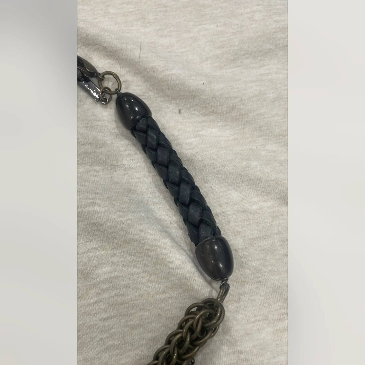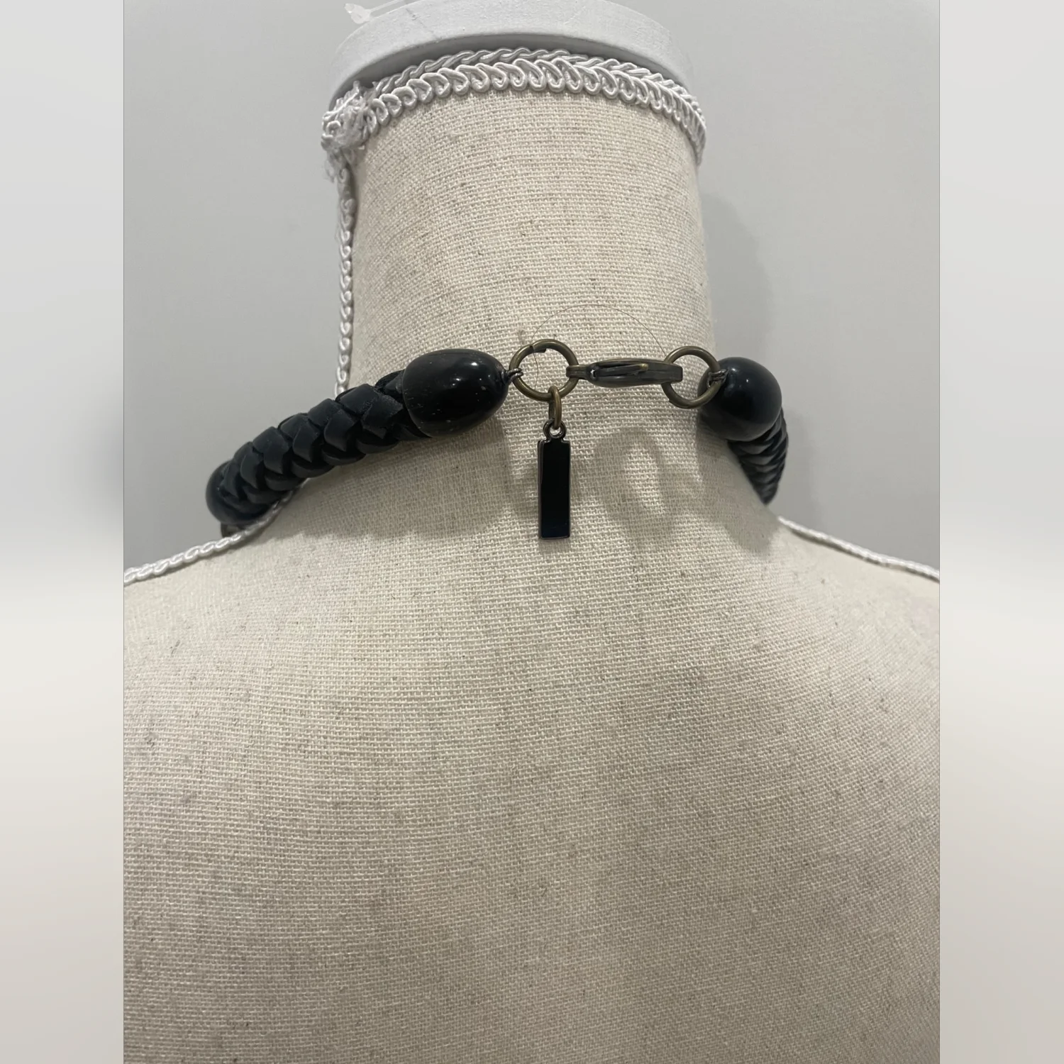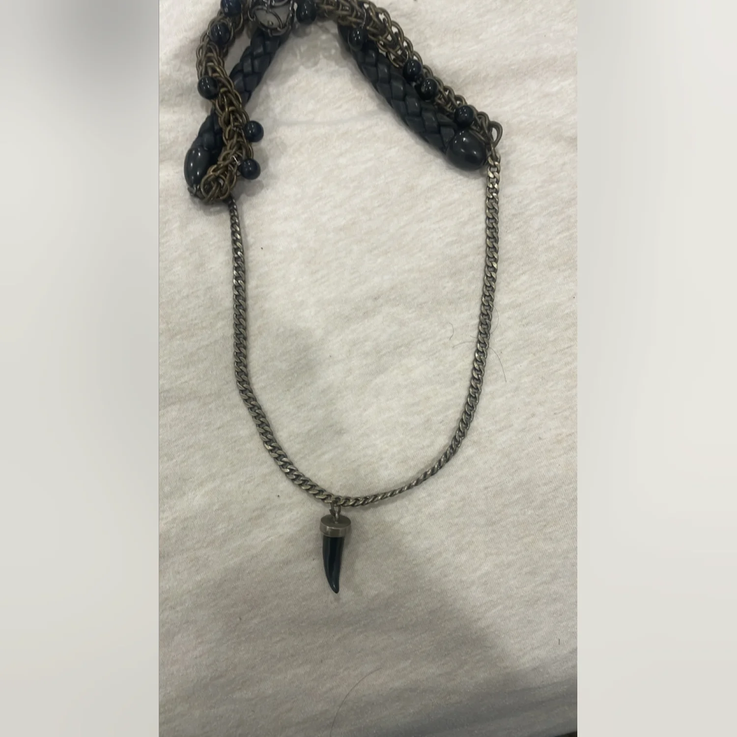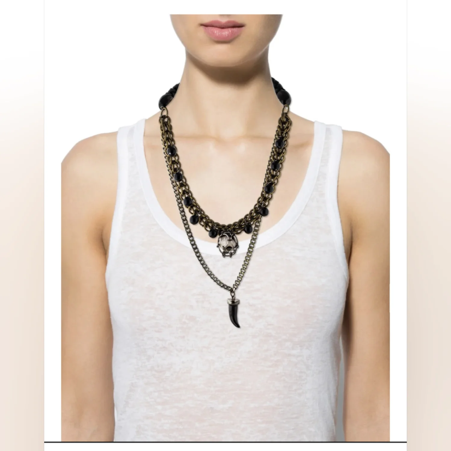 RARE SOLD OUT NECKLACE! This statement necklace features a layered chain design with intricate woven brass links and black bead accents. It includes a striking black pendant and a unique feature piece enclosed in a metallic frame. The back has a braided leather black cord for comfort. Perfect for adding an edgy touch to any outfit. #statementjewelry #edgy #layerednecklace